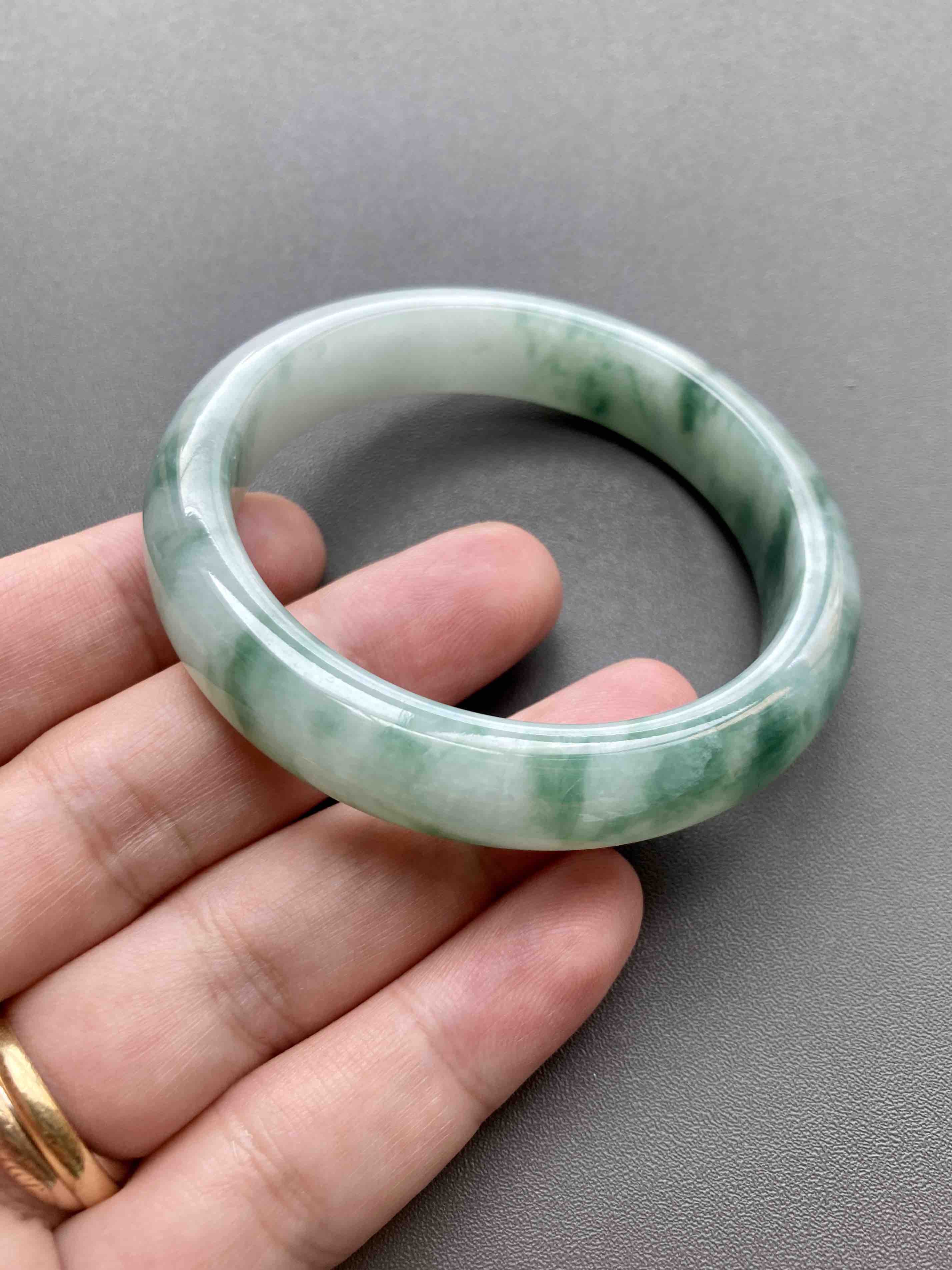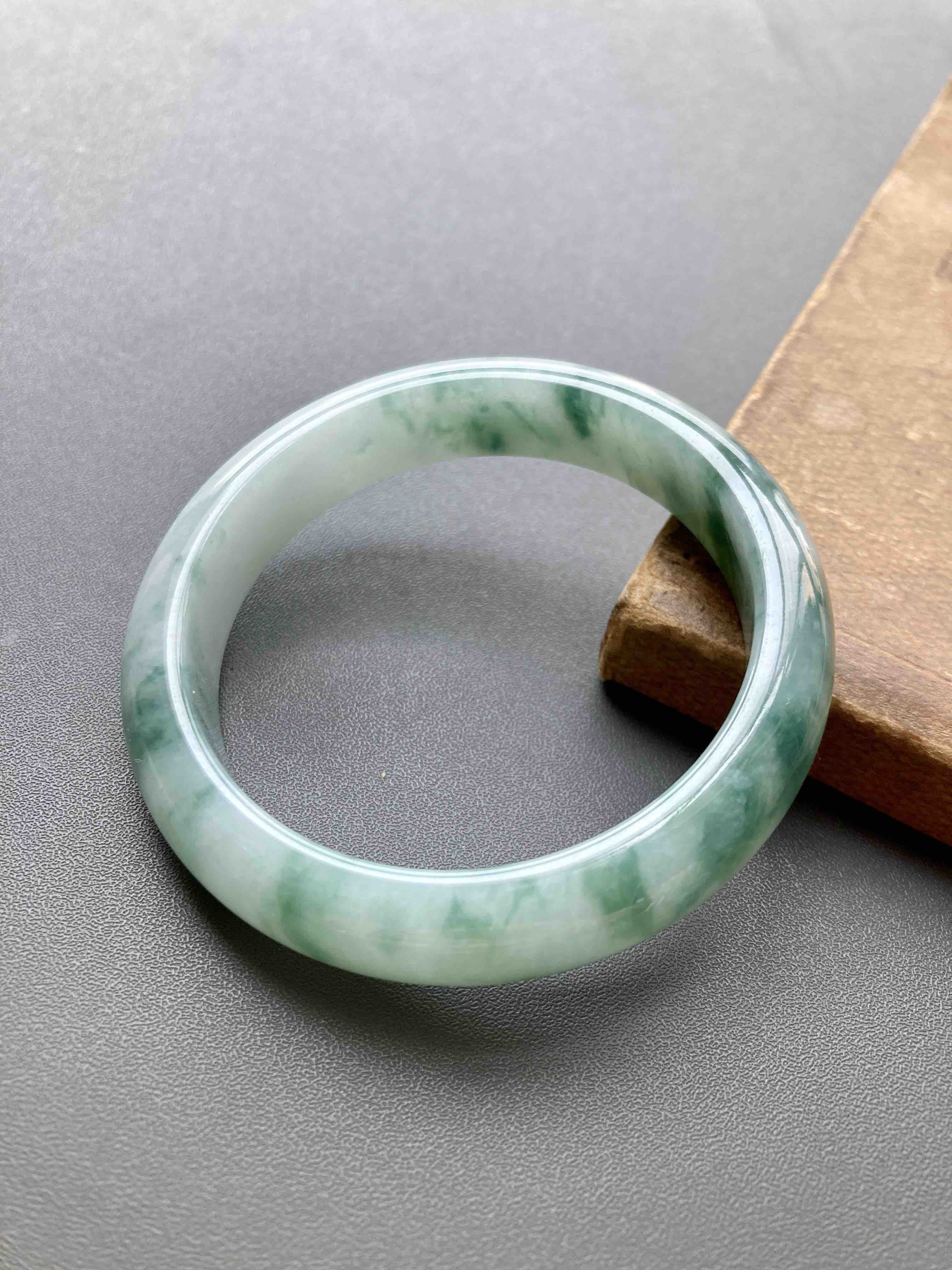 种水细腻柔滑的糯冰种飘花翡翠手镯,古典气质满满,飘花写意,底白肉细,质感温润均匀,上手特别舒服,内径53mm,适合手寸52到54佩戴,只要四位数,性价比超群