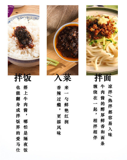 小蓝瓶的牛肉酱有245g,开盖可见鲜香油亮的红油及大粒的牛肉,辣椒的鲜辣以及豆豉的浓香扑鼻而来。挖出一勺,口水不自觉的开始分泌,配上米饭、粉面,浅浅的辣,加上有嚼劲的大块牛肉粒,胃口大振,三下五除二就能干掉一大份主食!39.9元有两瓶,估计,吃不了太久,太好吃啦!