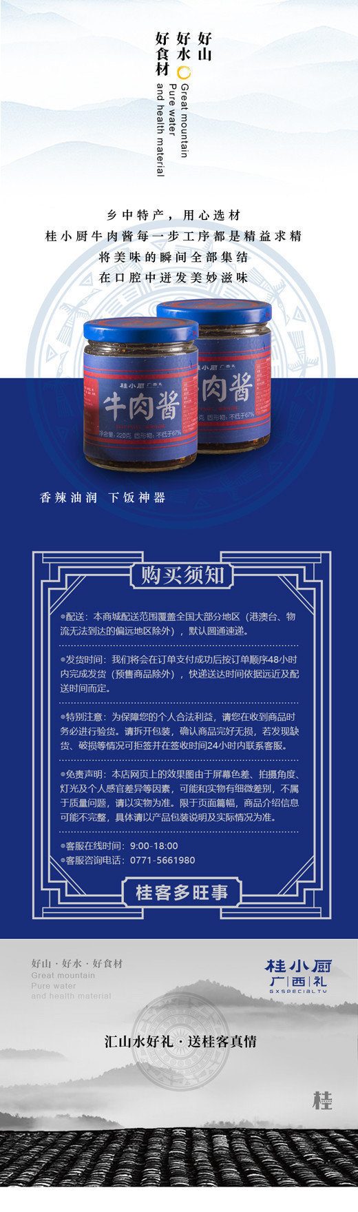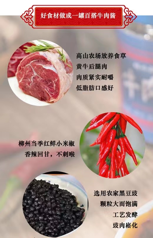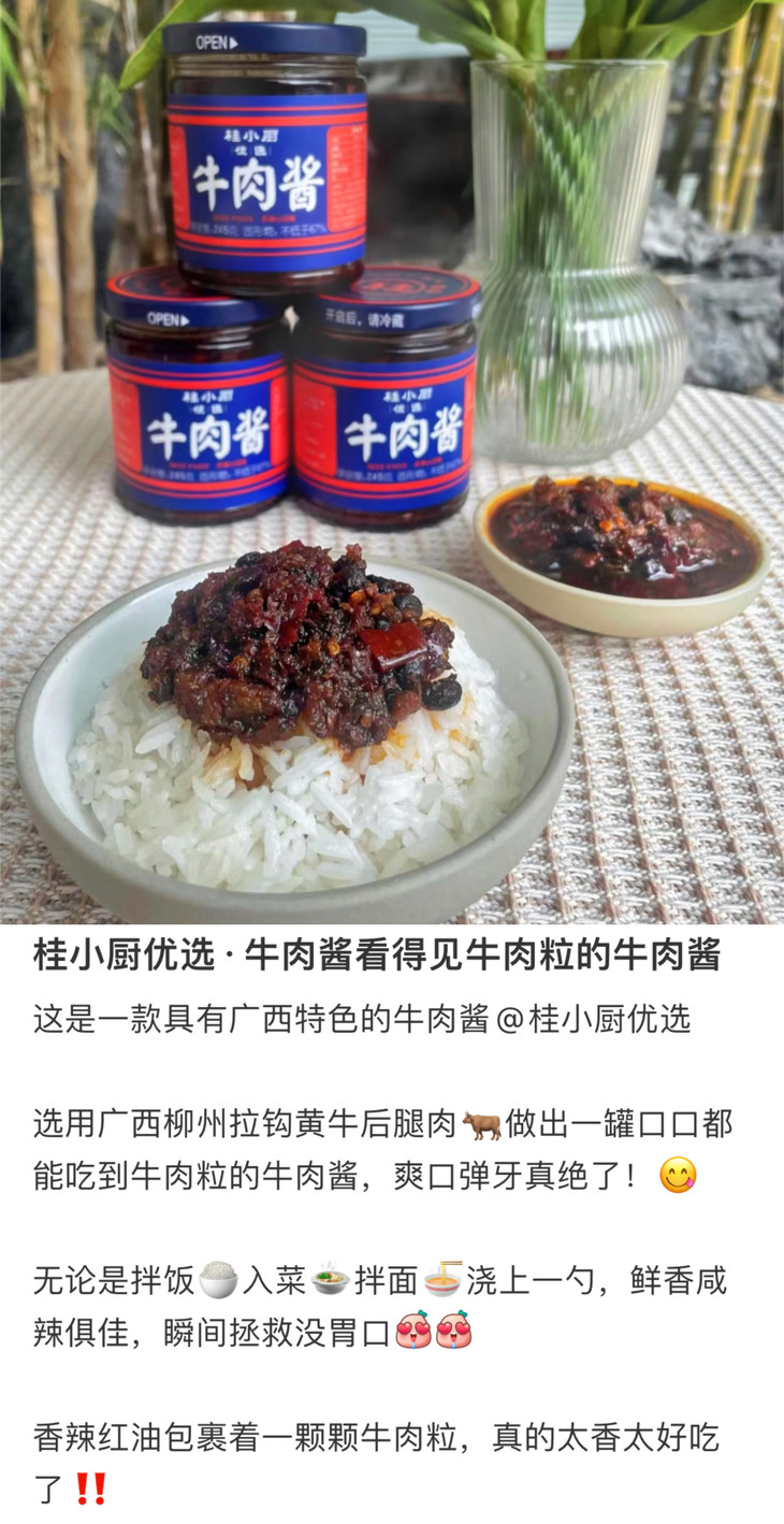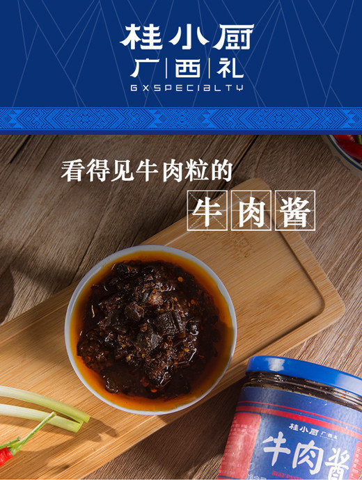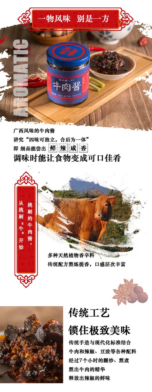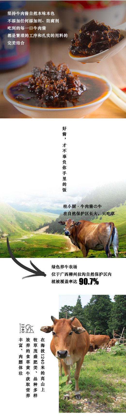 在广西柳州拉沟自然保护区,有一片绿色养牛农场,这里海拔1240米,植被茂盛,生态优良,放养的黄牛可以获取丰富的营养,肉膘体壮,后腿肉更是肉质紧实耐嚼,低脂肪,口感好。桂小厨便是精选了这里的黄牛后腿肉,以及柳州当季香辣回甘的红鲜小米椒和农家颗粒大而饱满的黑豆豉,采用传统工艺和秘制配方,历经7小时熬煮,打造出了具有广西特色的牛肉酱。在制作过程中,坚持自然本味本色,不添加任何添加剂和防腐剂,多种天然植物香辛料与传统配方相结合,充分释放出辣椒的鲜味和牛肉的精华。