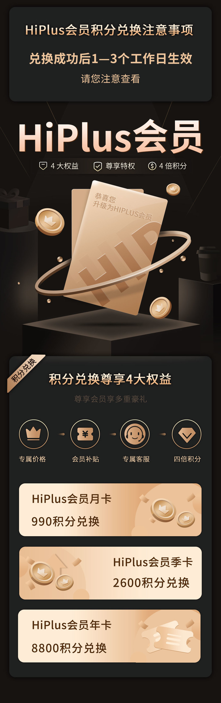 温馨提示:由于系统原因,兑换成功后,HiPlus会员无法及时生效,将在1—3个工作日内生效,请兑换前务必注意;