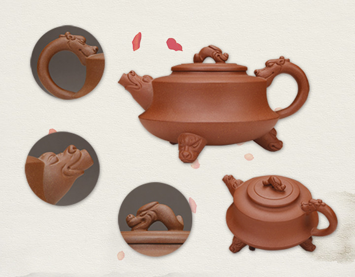 此壶器饰以龙,壶把、嘴纽、三足皆龙,谓“六龙御天”,民间有玉皇大帝以六条龙为座驾统御天下的传说,龙行雨施,滋润万物。“尽挹西江,细斟北斗”。香茗玉露,诚邀天下客。