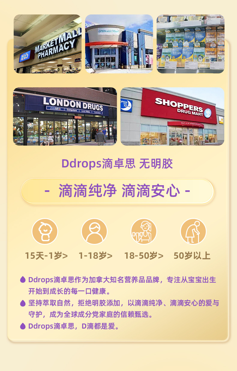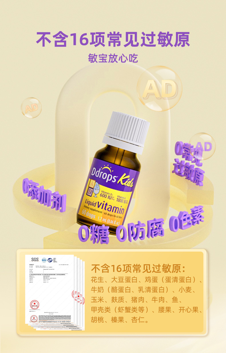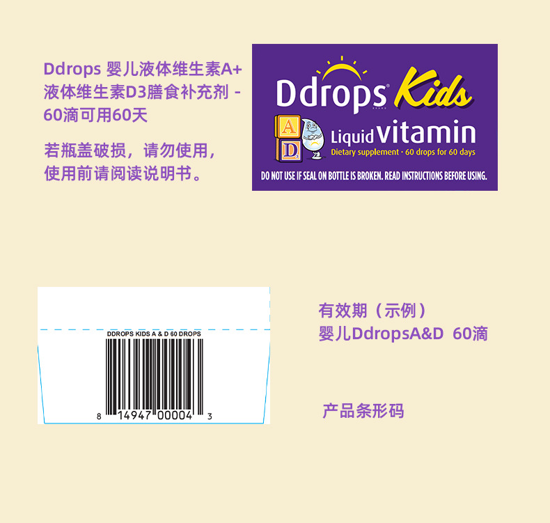 【香港直邮】美国Ddrops滴卓思儿童维生素AD补钙滴剂1.7ml 适用1岁以上(60天用量)