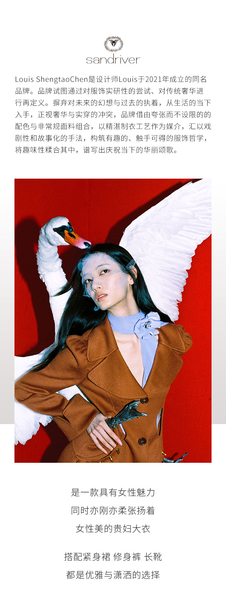 历年在巴黎时装周亮相,享誉世界的艺术羊绒品牌[Sandriver 沙涓]由羊绒布道者郭秀玲女士创立。阿拉善自有牧场纯种羔羊绒,日本国宝设计师小筱顺子,上海自有基地精工细作。承载羊绒情怀,坚持匠人品质。