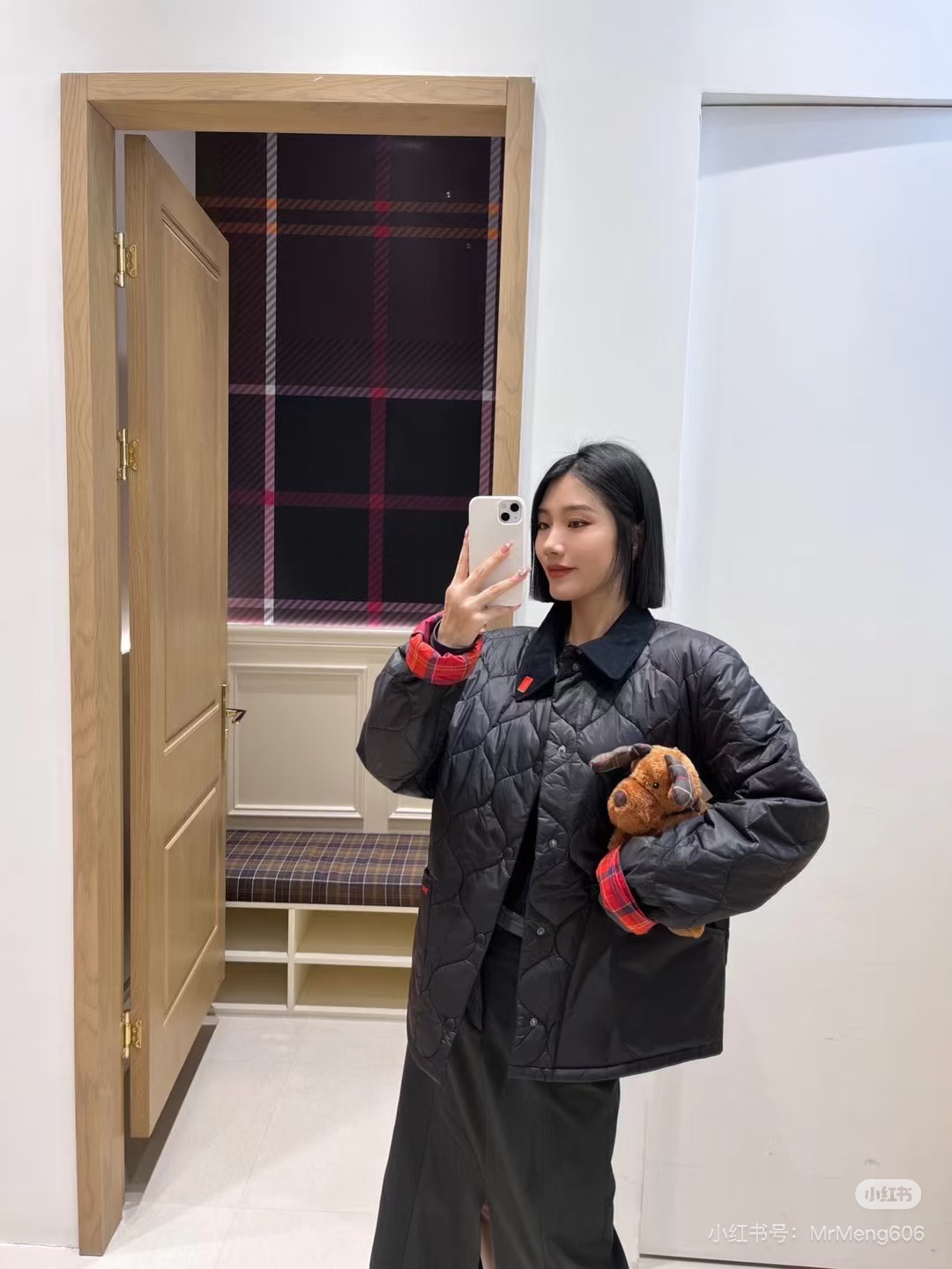 新款洋葱纹绗缝棉服,红色翻袖格纹