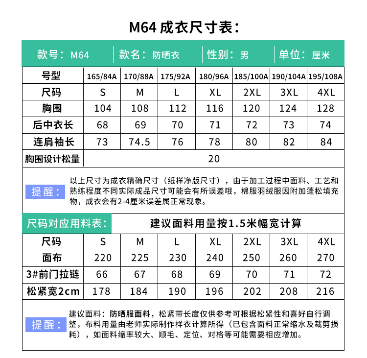 裁缝学苑 M64男士防晒衣防晒服户外皮肤风衣服装纸样裁剪图纸