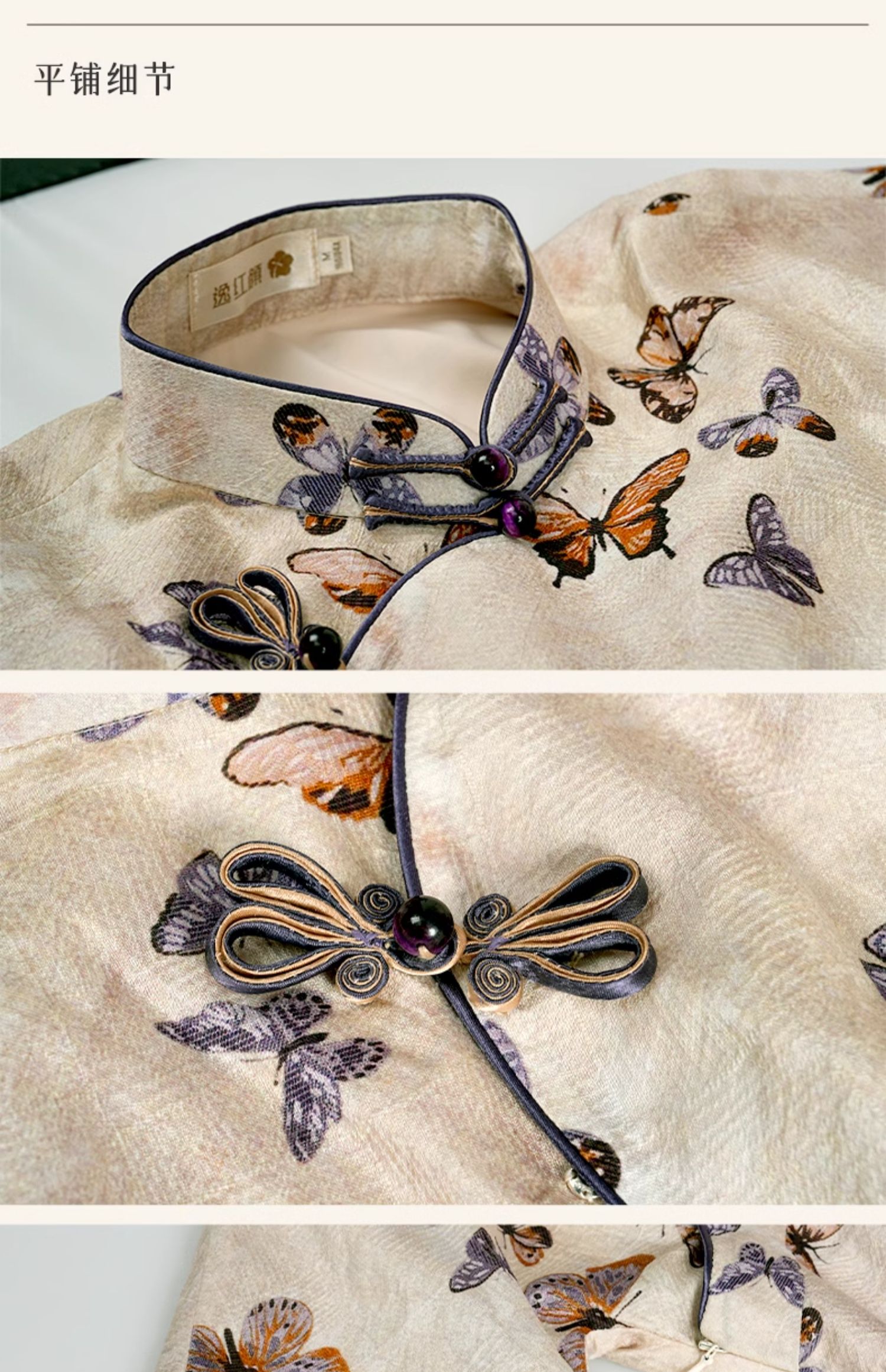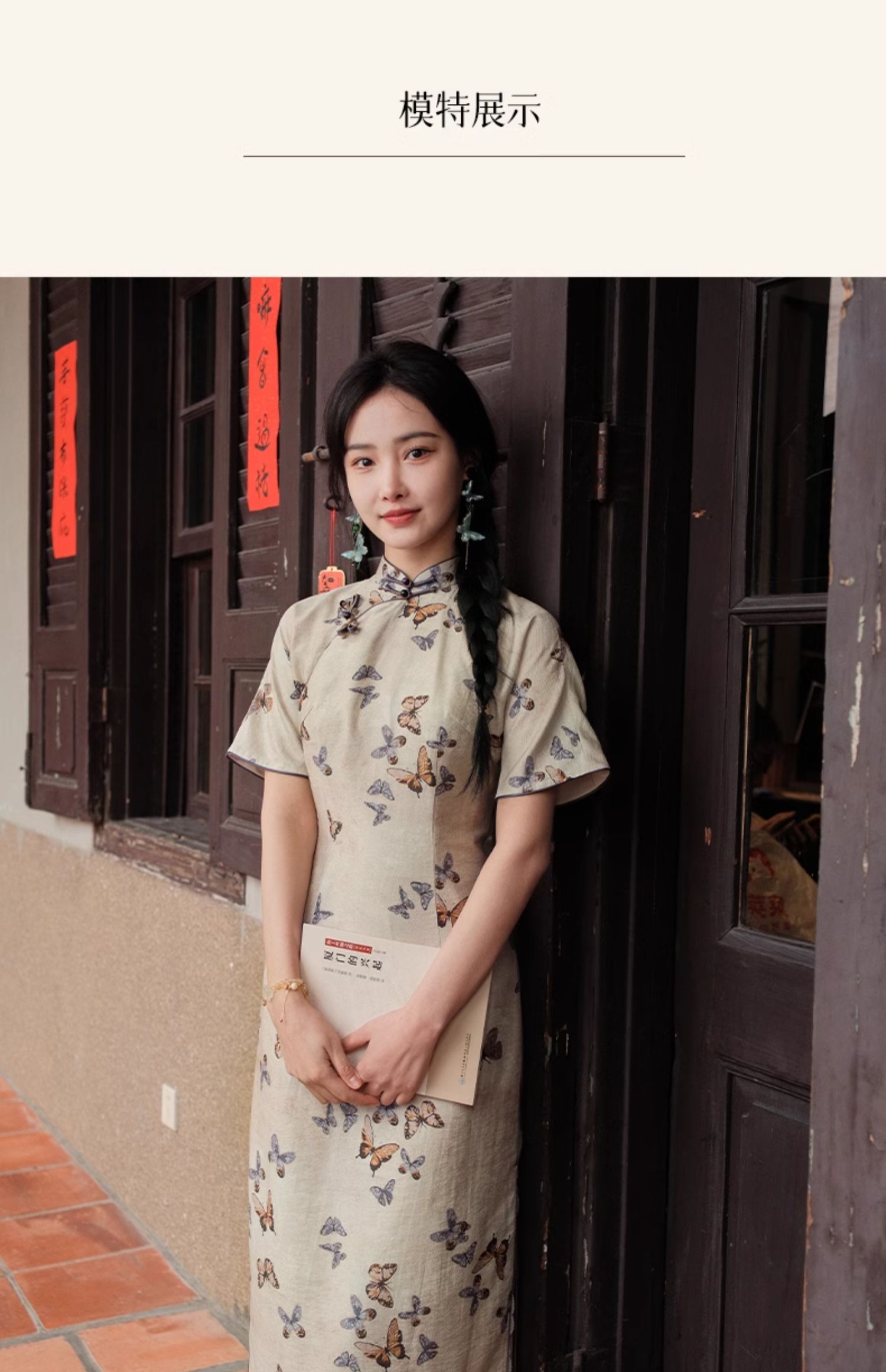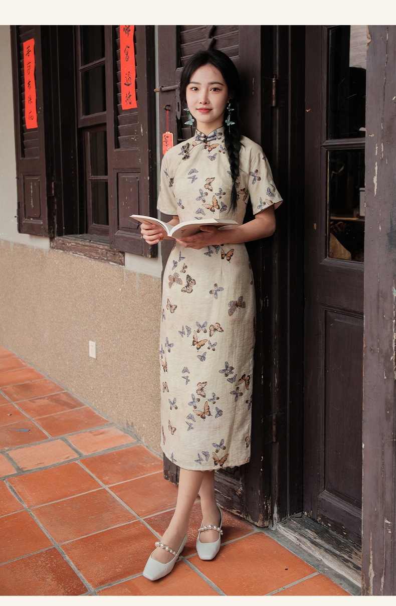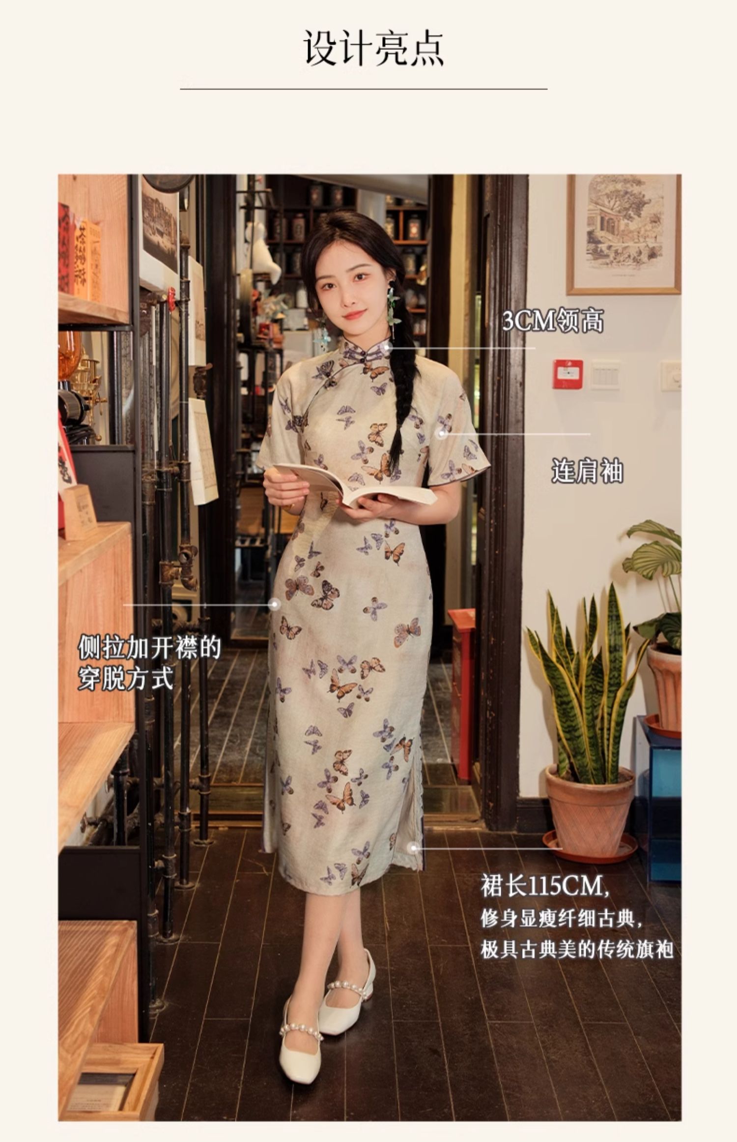 上海逸红颜蝶涯2025夏新棉麻质感提花蝴蝶印花新中式日常文艺旗袍