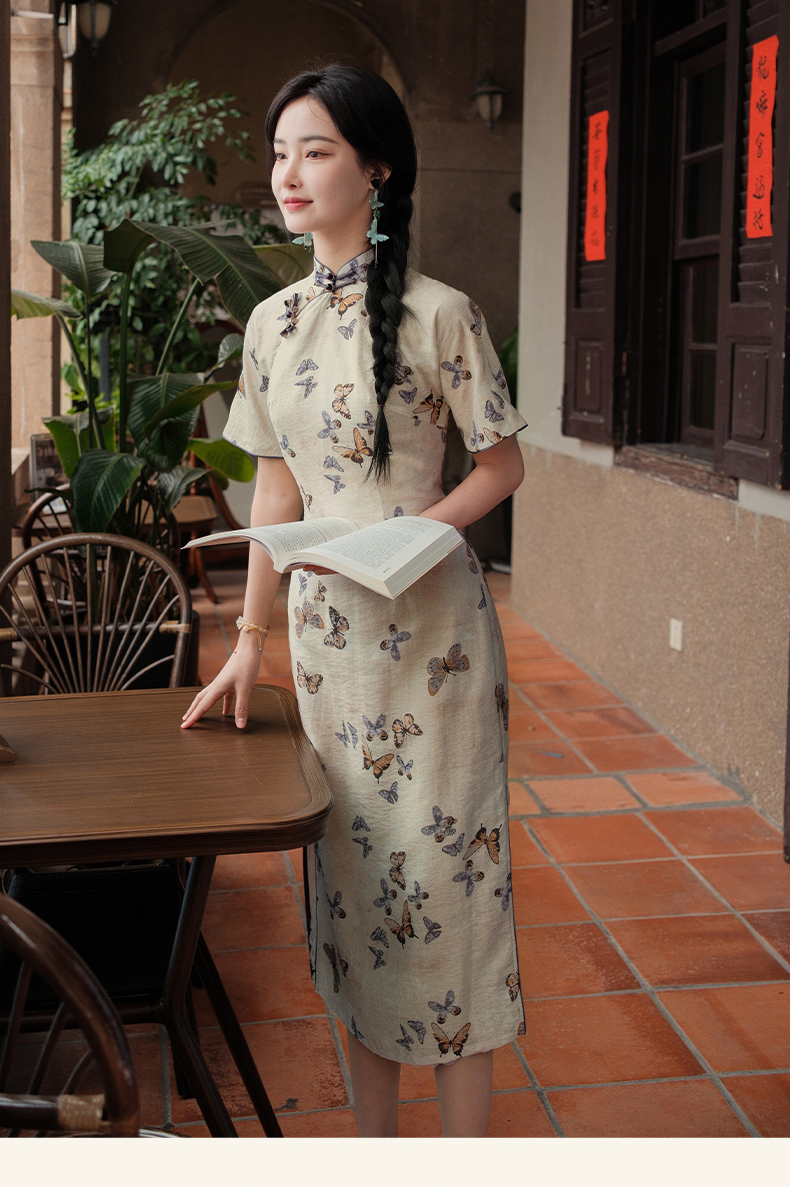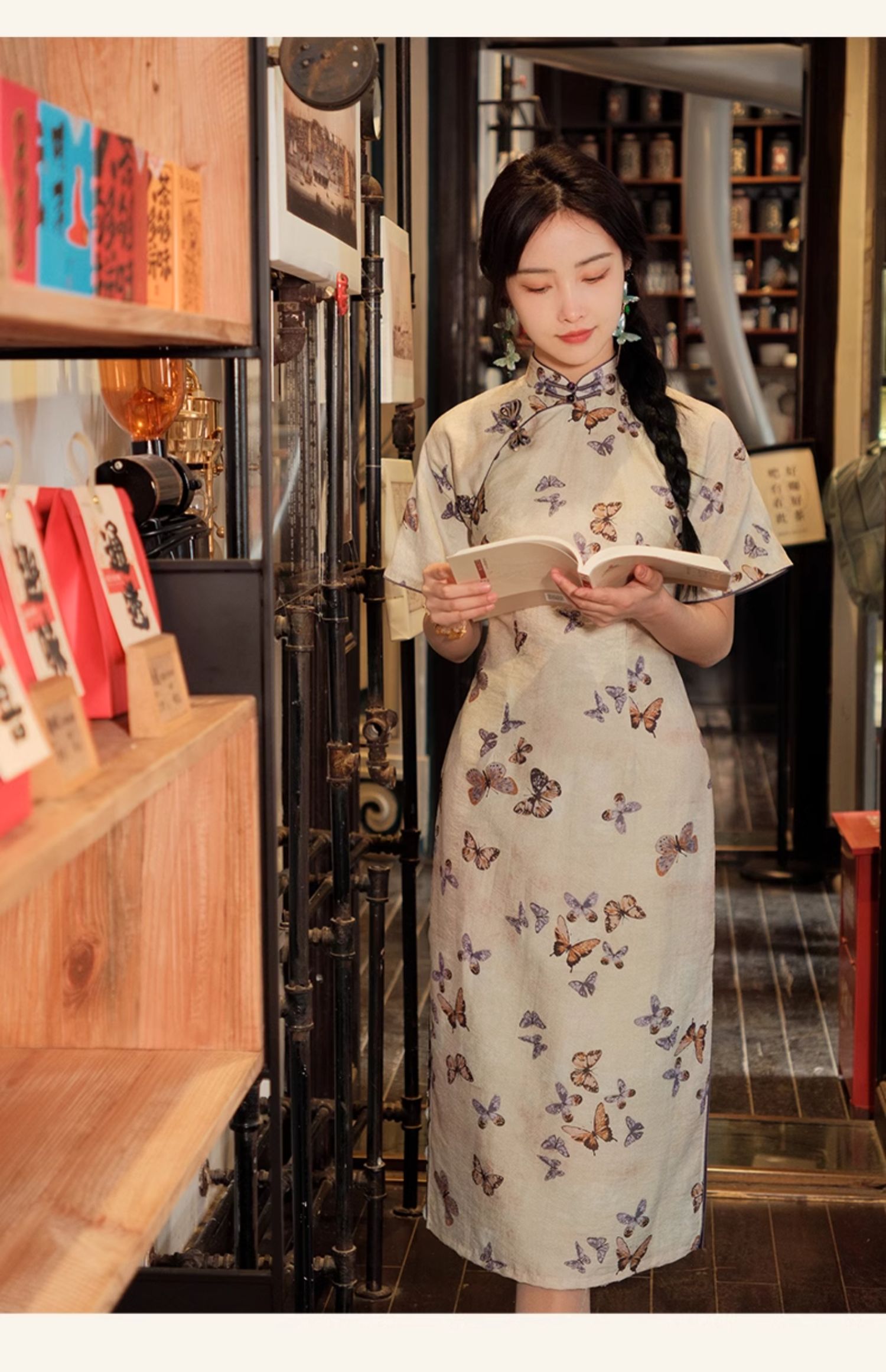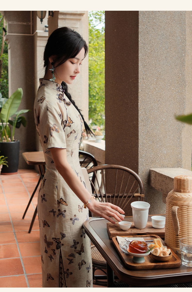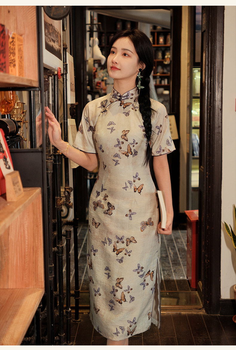上海逸红颜蝶涯2025夏新棉麻质感提花蝴蝶印花新中式日常文艺旗袍