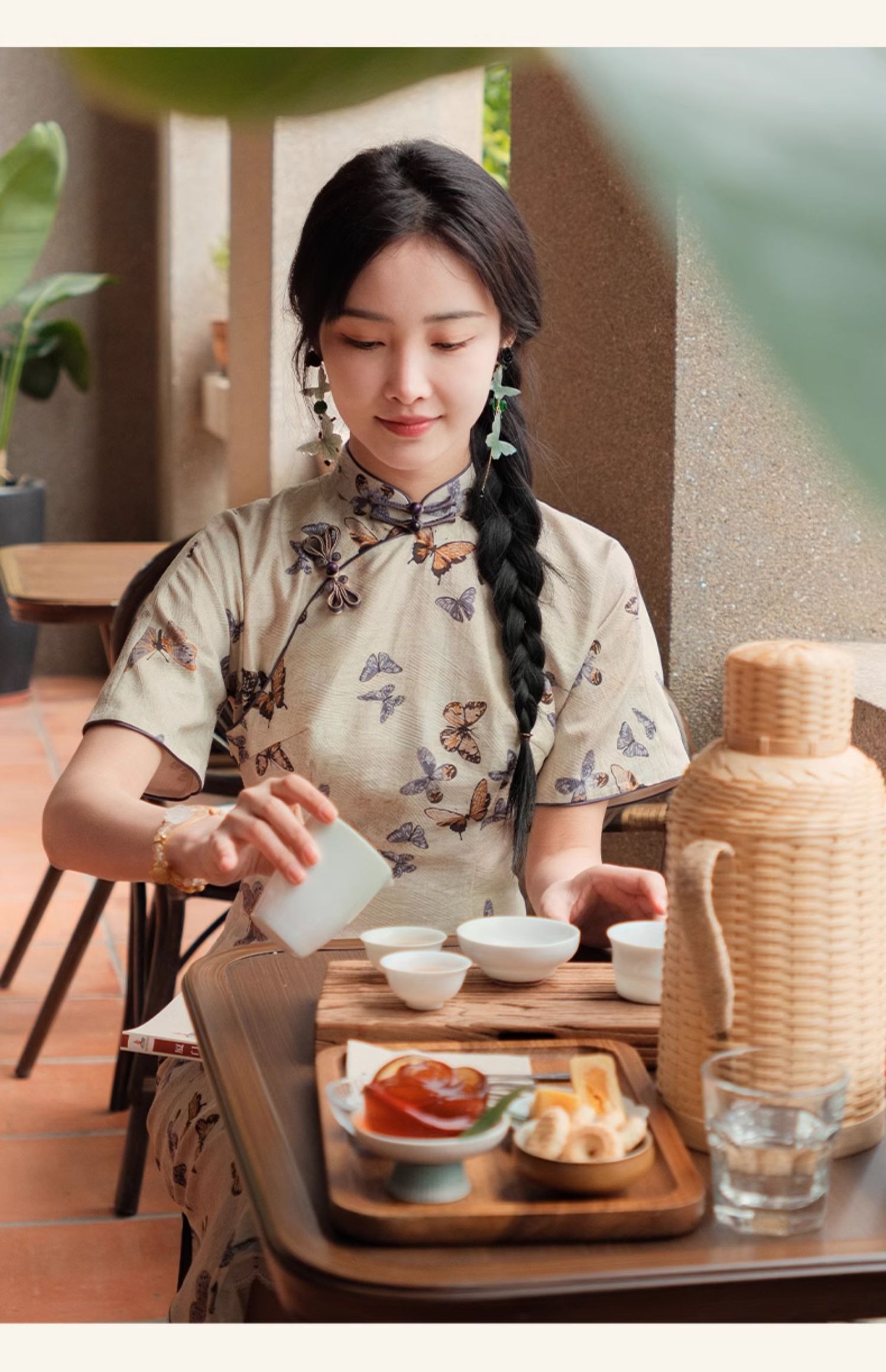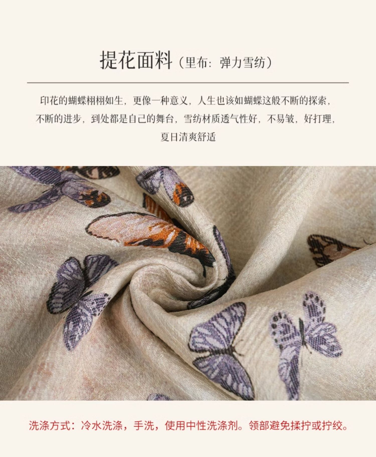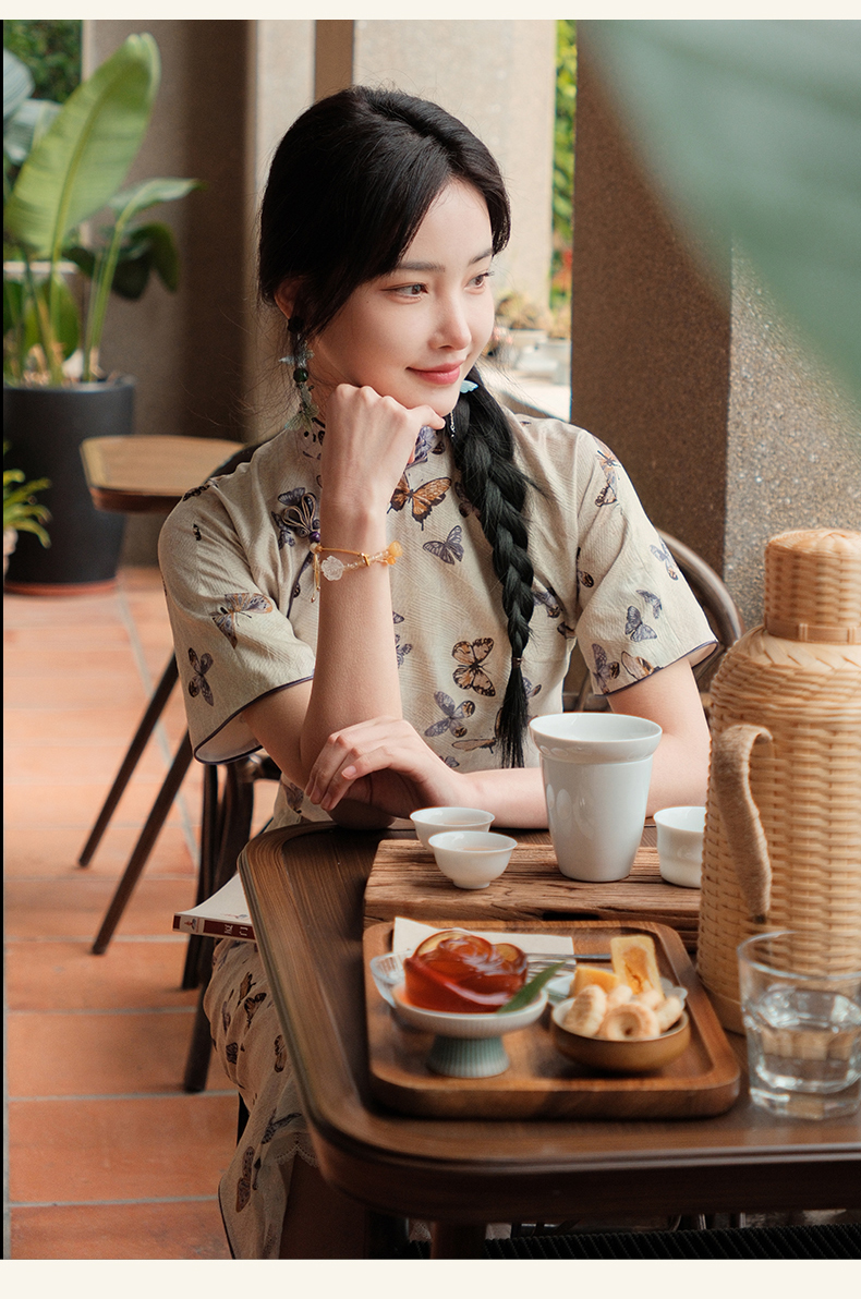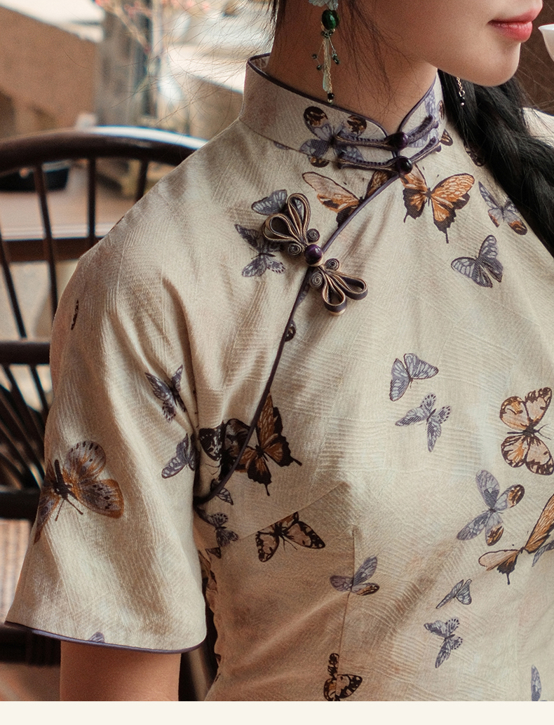上海逸红颜蝶涯2025夏新棉麻质感提花蝴蝶印花新中式日常文艺旗袍