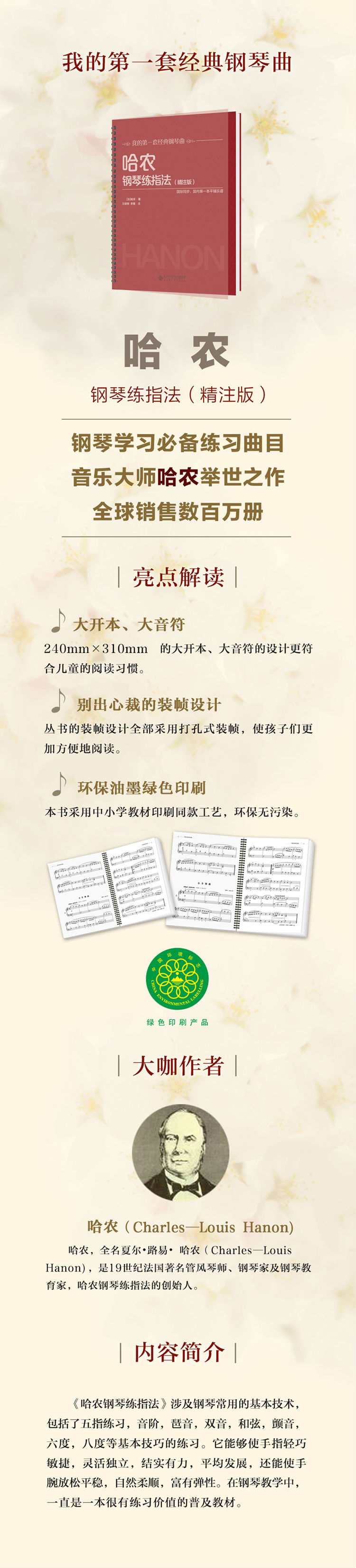 “我的*套经典钢琴曲”系列教程为了更加接近于原著,希望将真实、*的版本展示给学生,故而在德国以及美国寻找了多个*版本进行比较分析,在比较分析之后将一些表情术语以及分句进行了处理,并且将乐谱中的个别错音进行了校正,在尊重原著的基础上进行了些许修改。除此之外,为了更加适应中国人的生理特点,特地对指法进行了些许调整,中国人的手掌相对西方人较小,传统的指法并不利于学生练习。所以,新的版本特地在此做了修订,将跨度较大且不易弹奏的指法进行了调整,*大限度地方便东方人弹奏。