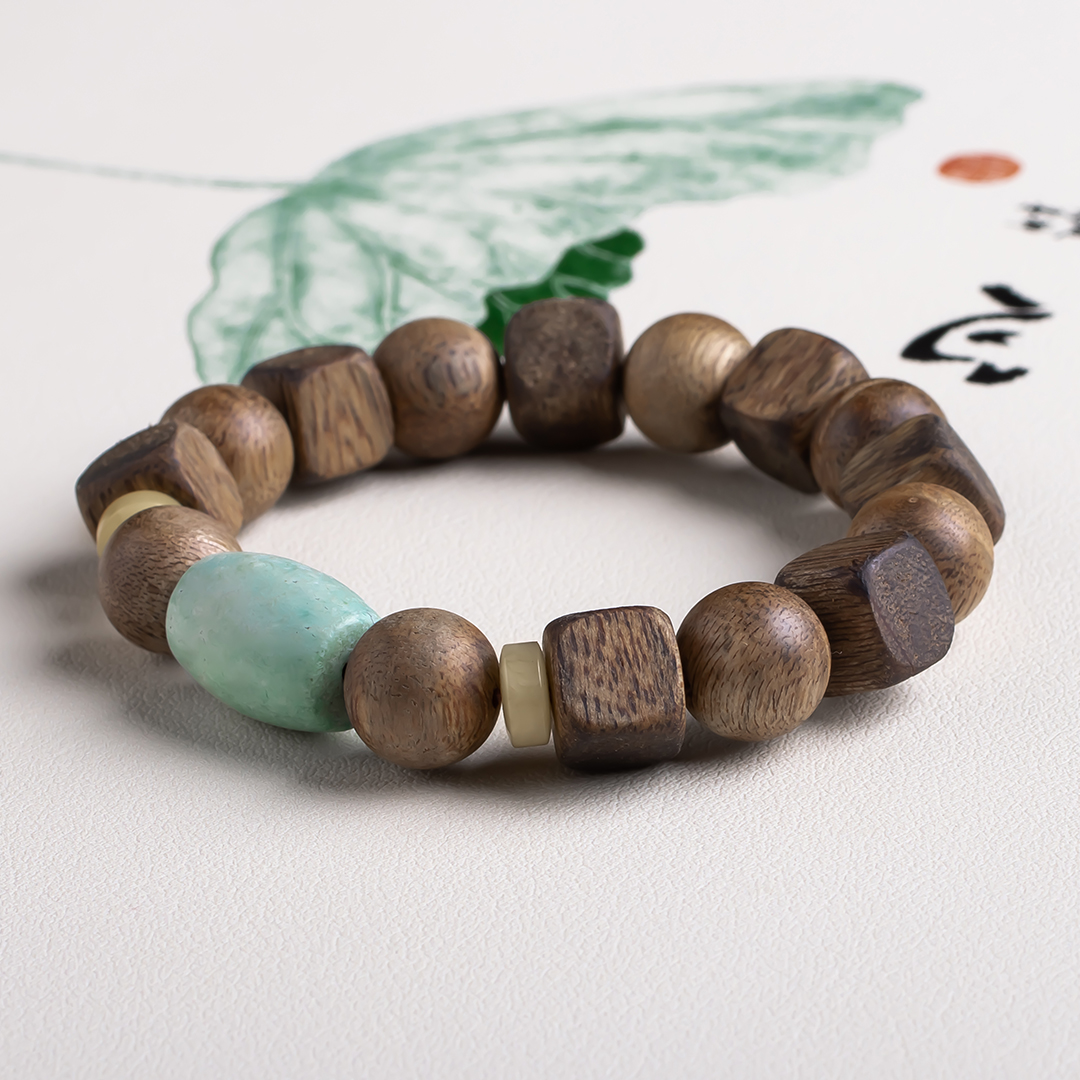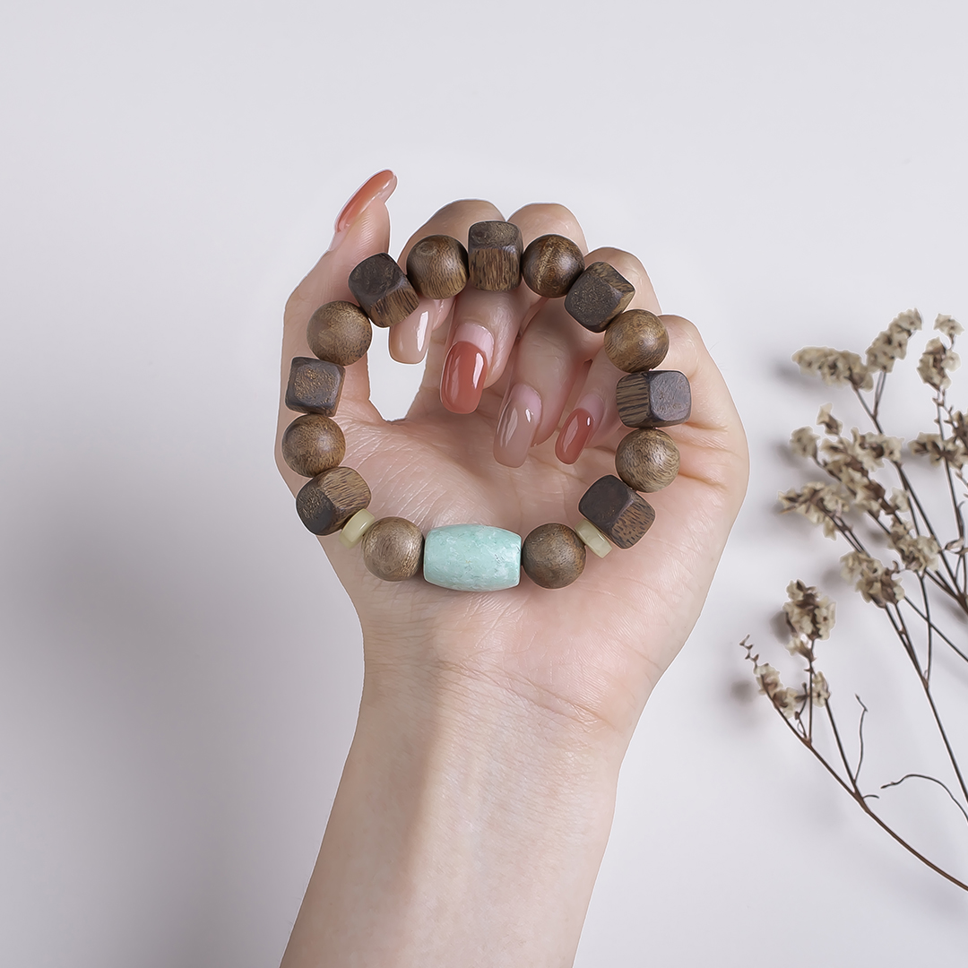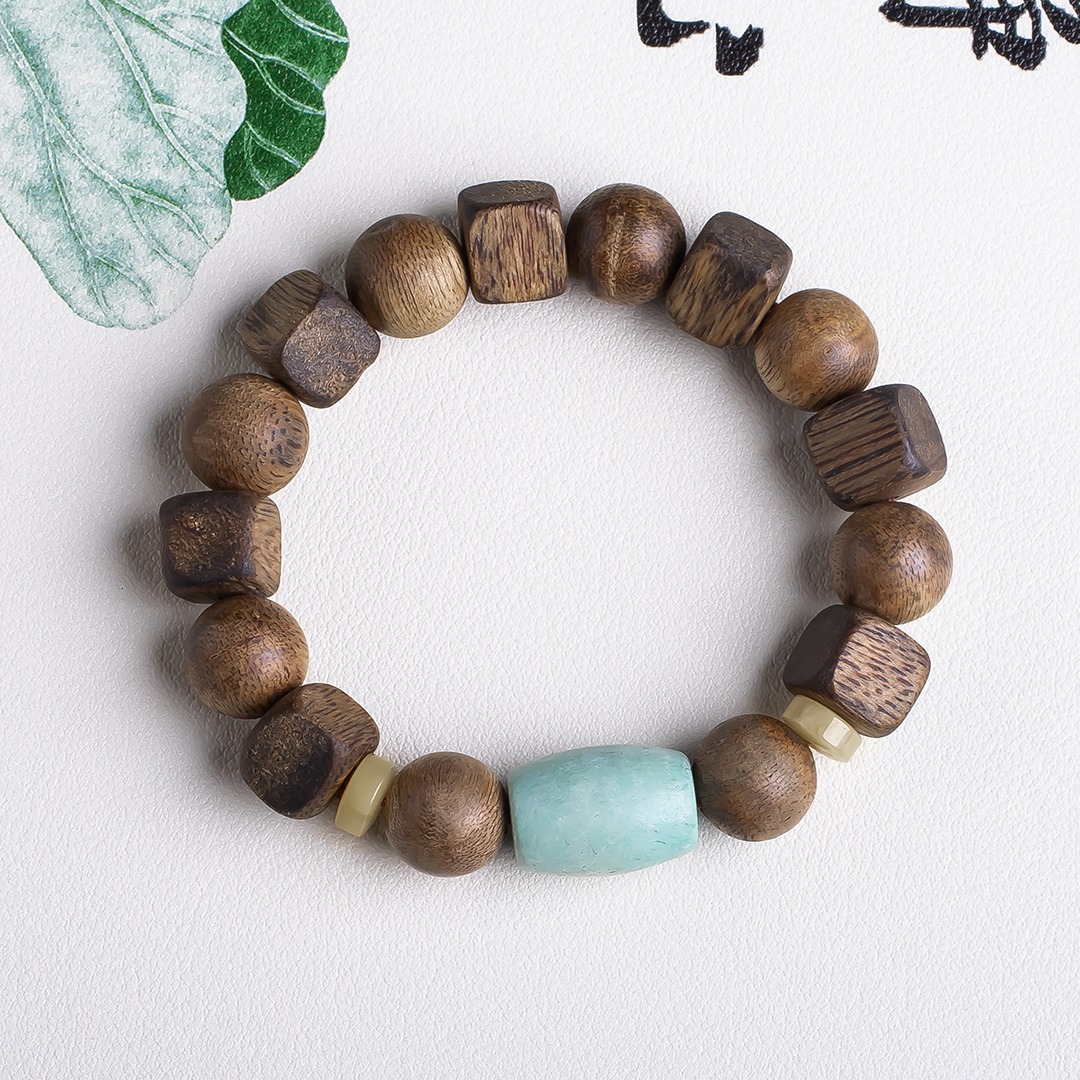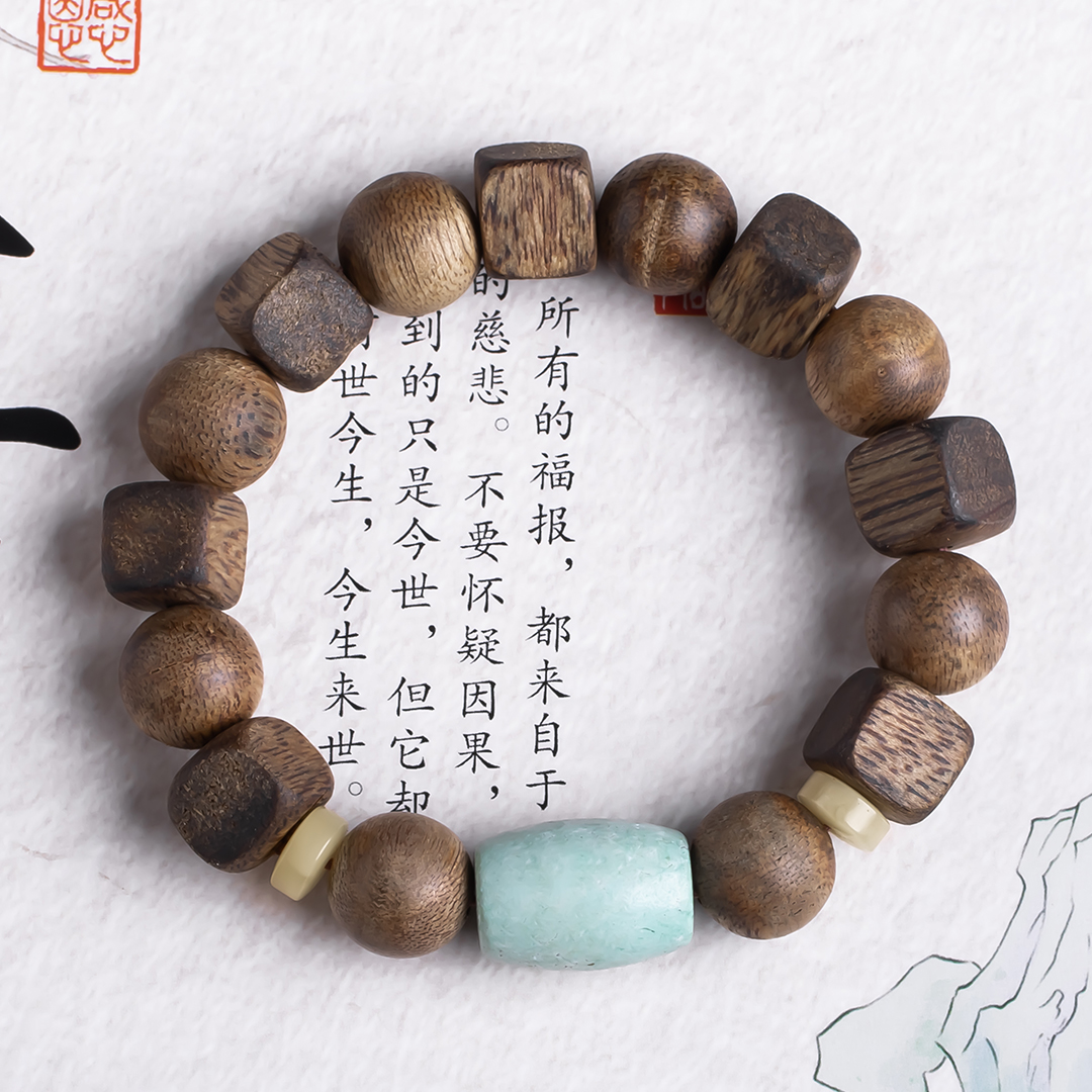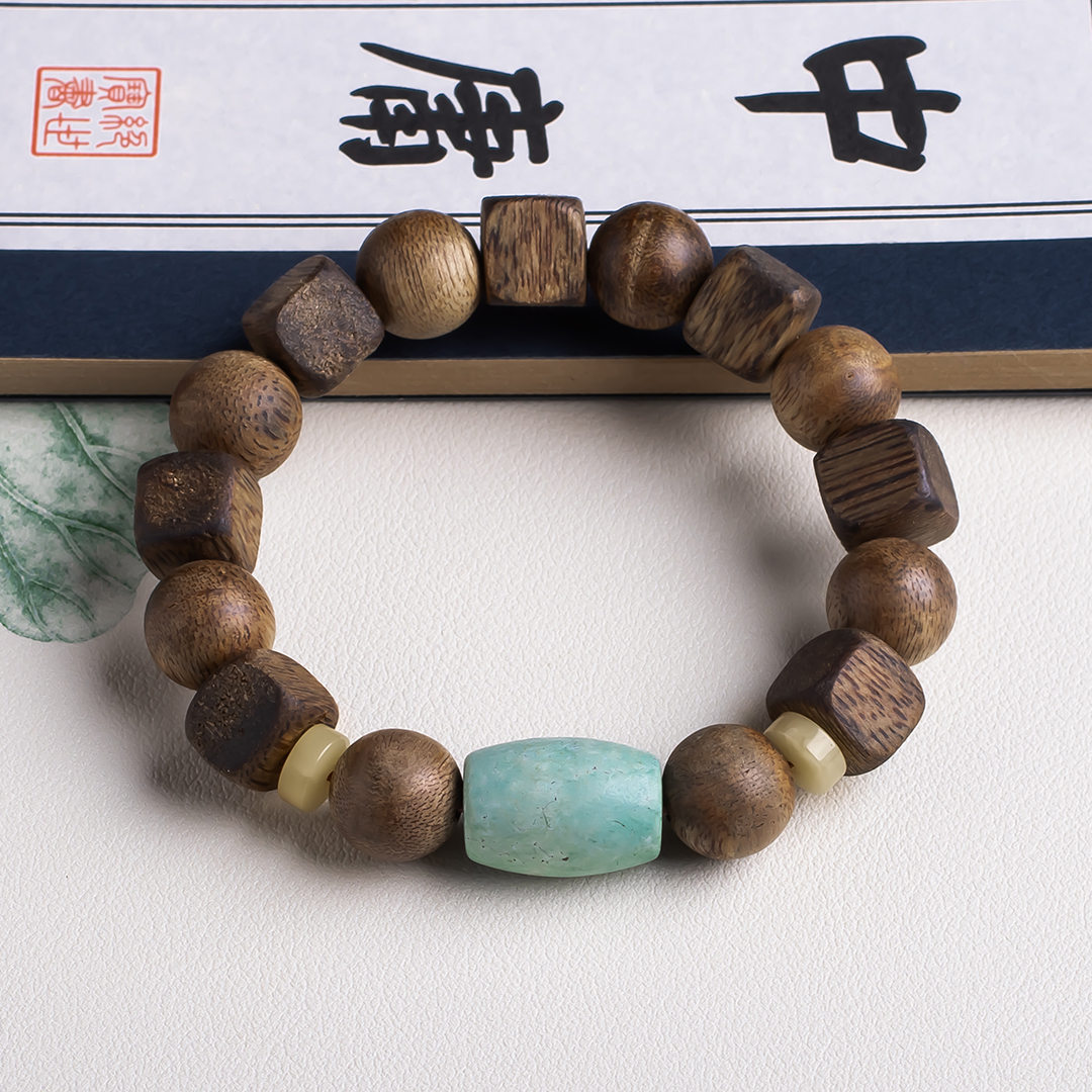xy0459沉香+蜜蜡绿松石桶珠手串,天然沉香约10.7mm,原色原味,香味自然清甜,方形珠与圆珠相结合,一枚浅蓝高瓷绿松石大桶珠,文玩悠闲,上手大气。