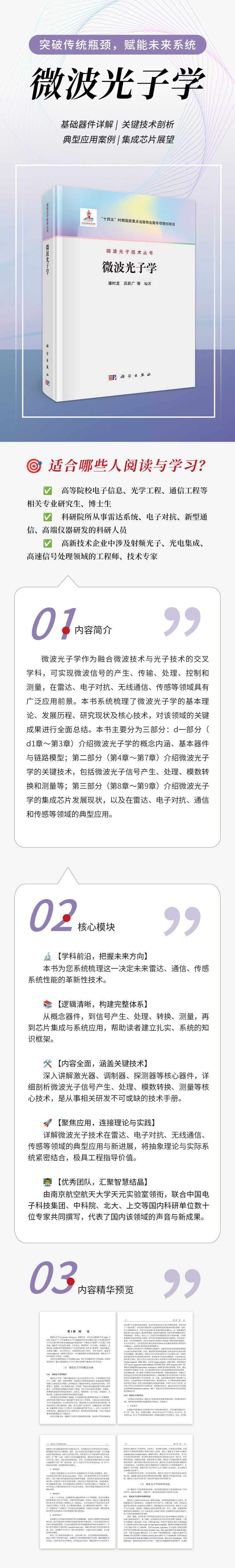 微波光子学作为融合微波技术与光子技术的交叉学科,可实现微波信号的产生、传输、处理、控制和测量,在雷达、电子对抗、无线通信、传感等领域具有广泛应用前景。本书系统梳理了微波光子学的基本理论、发展历程、研究现状及核心技术,对该领域的关键成果进行全面总结。本书主要分为三部分:第一部分(第1章~第3章)介绍微波光子学的概念内涵、基本器件与链路模型;第二部分(第4章~第7章)介绍微波光子学的关键技术,包括微波光子信号产生、处理、模数转换和测量等;第三部分(第8章~第9章)介绍微波光子学的集成芯片发展现状,以及在雷达、电子对抗、通信和传感等领域的典型应用。