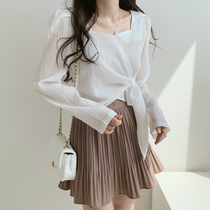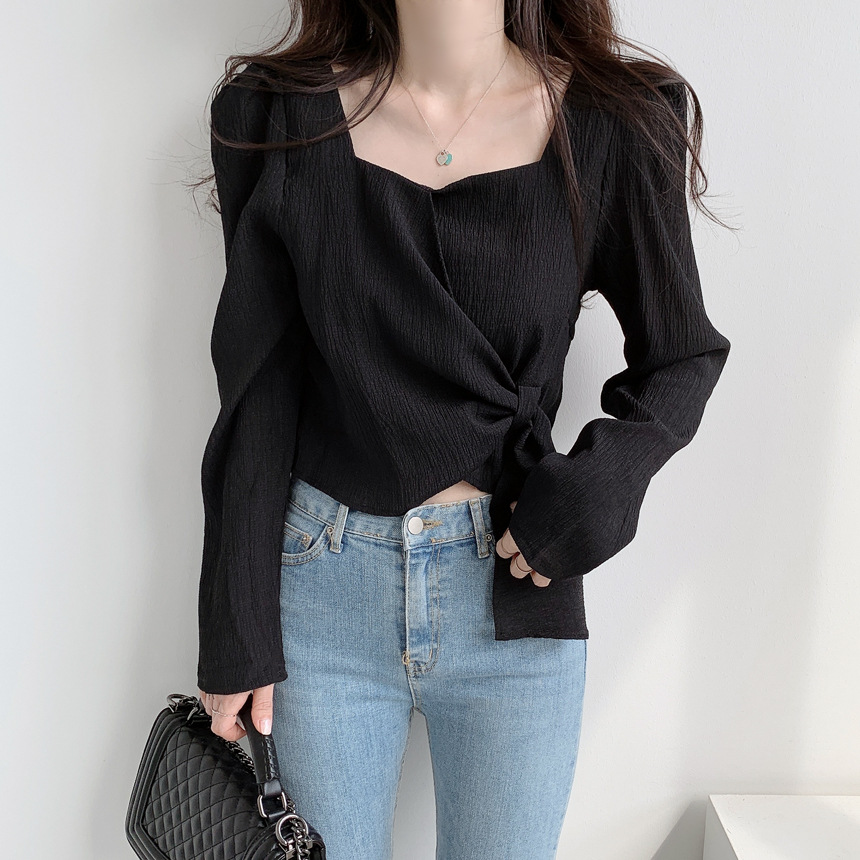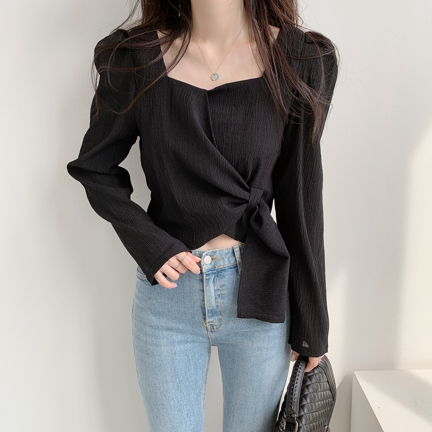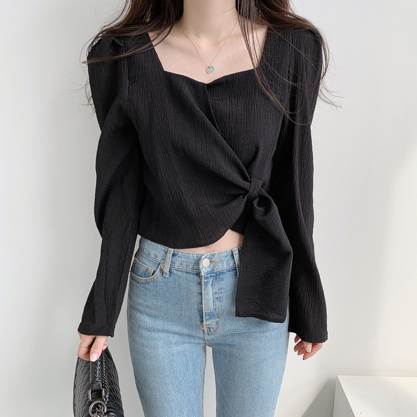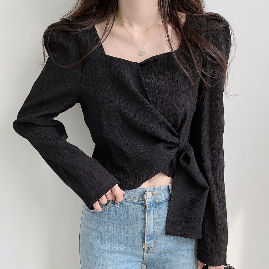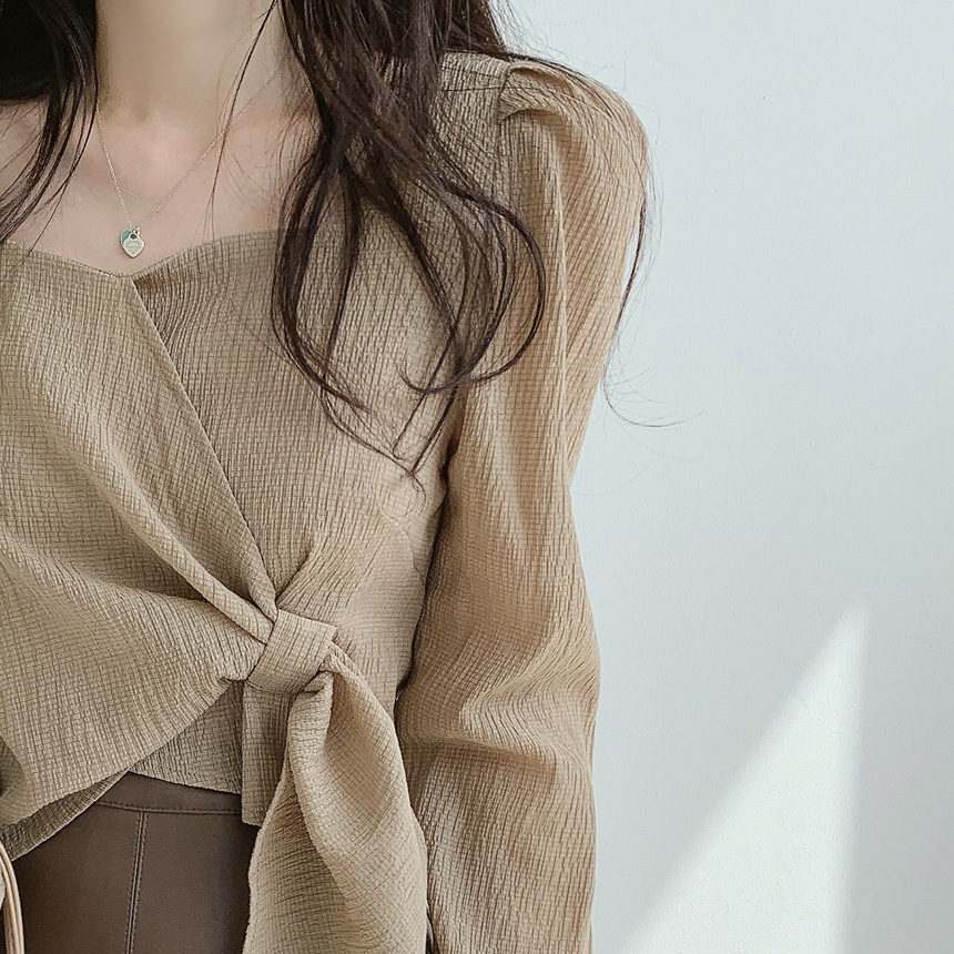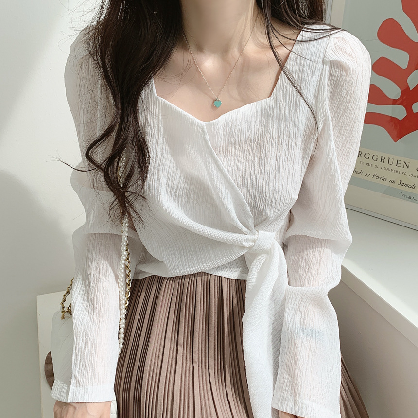 2023春秋上衣设计感韩系方领衬衫泡泡长袖绑带显瘦气质衬衣女