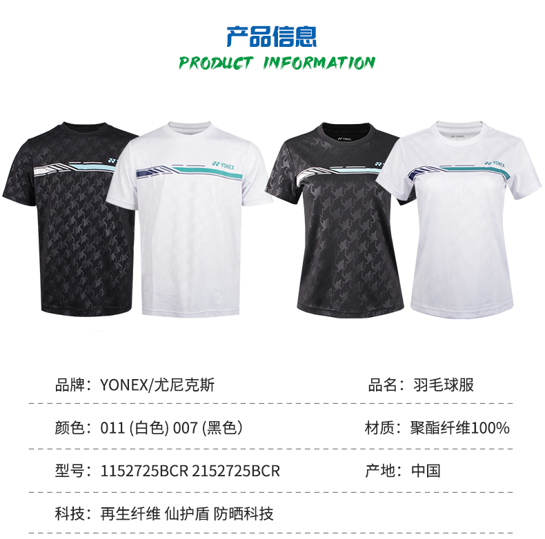 YONEX尤尼克斯新款羽毛球服1152725BCR 2152725BCR男女款透气舒适比赛款运动服短袖