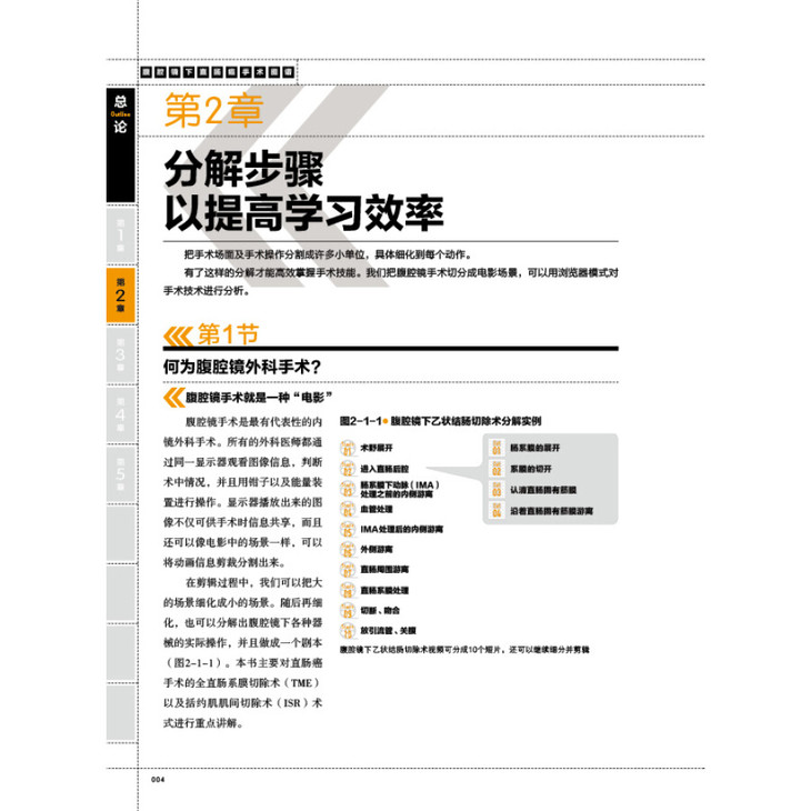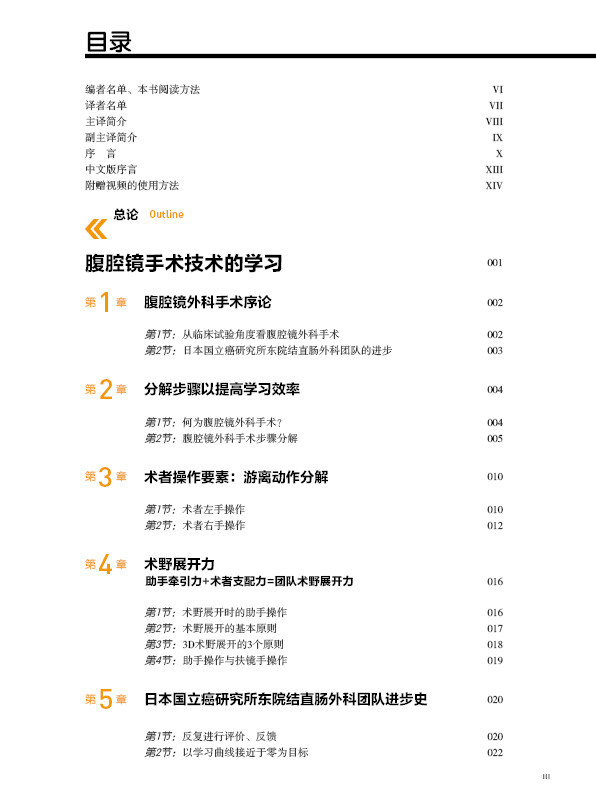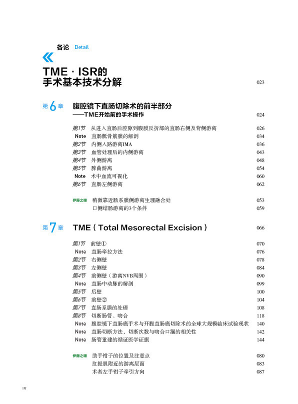 本书是对腹腔镜下直肠癌手术技术的解说,分总论和各论两部分。其中各论中各章采用阶梯式教学方式对相关手术基本技术进行了分解及介绍,其内容包括以下几个主要“项目”:术野展开:相关流程及技术。游离操作:相关流程及技术。关键点:手术技术各环节关键点,注意事项:手术陷阱,一旦中招就可能招致危险,并且介绍其对策。伊藤之眼:如何掌握诀窍、提高技能,为此提供更加专业性及知识性的解说。