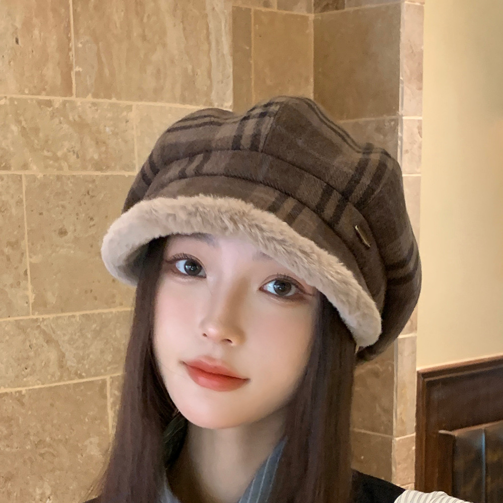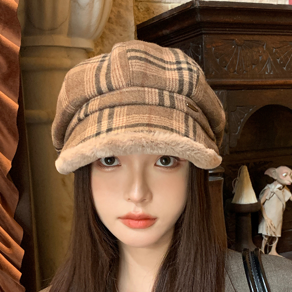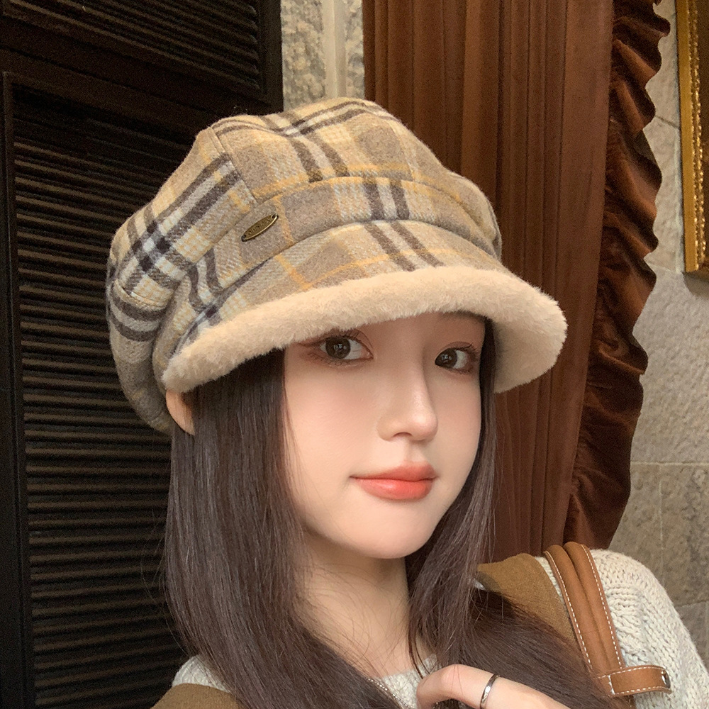 【时尚百搭❗️格纹毛绒八角帽】修饰脸型巨显脸小,毛绒毛呢锁温保暖,文艺新潮更潮搭,保暖女百搭显脸小贝雷帽高级感画家帽QQ