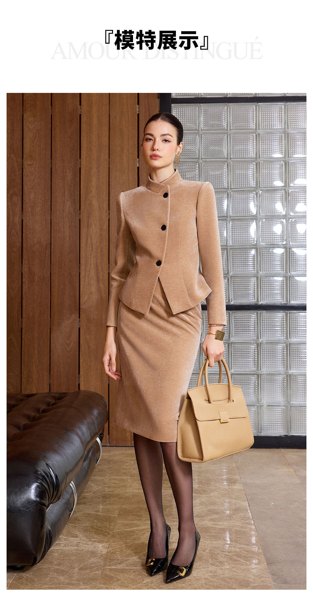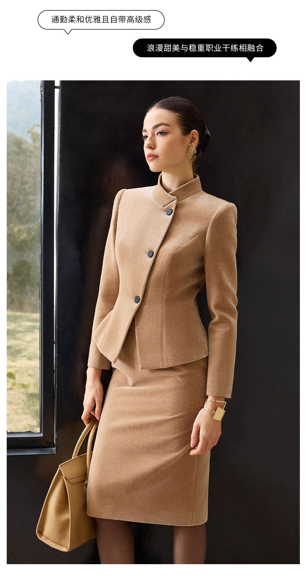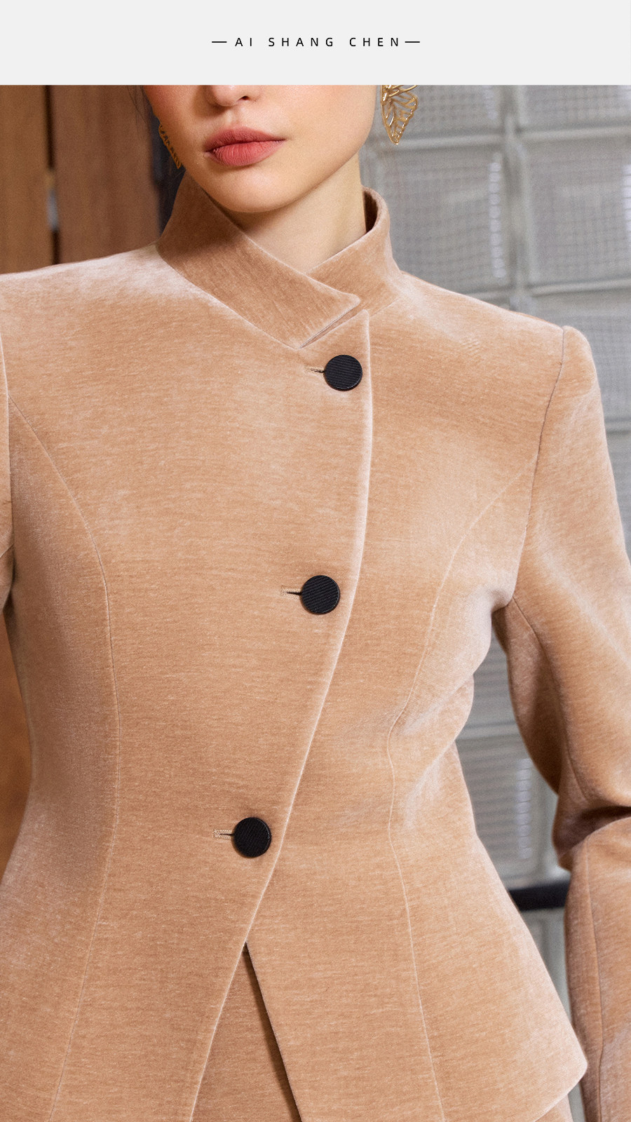 艾尚臣立领西装套装女拼接通勤新中式西服外套气质丝绒裤职业装冬