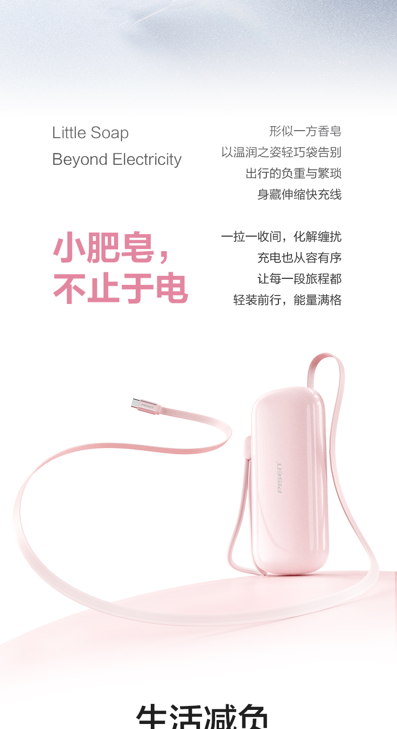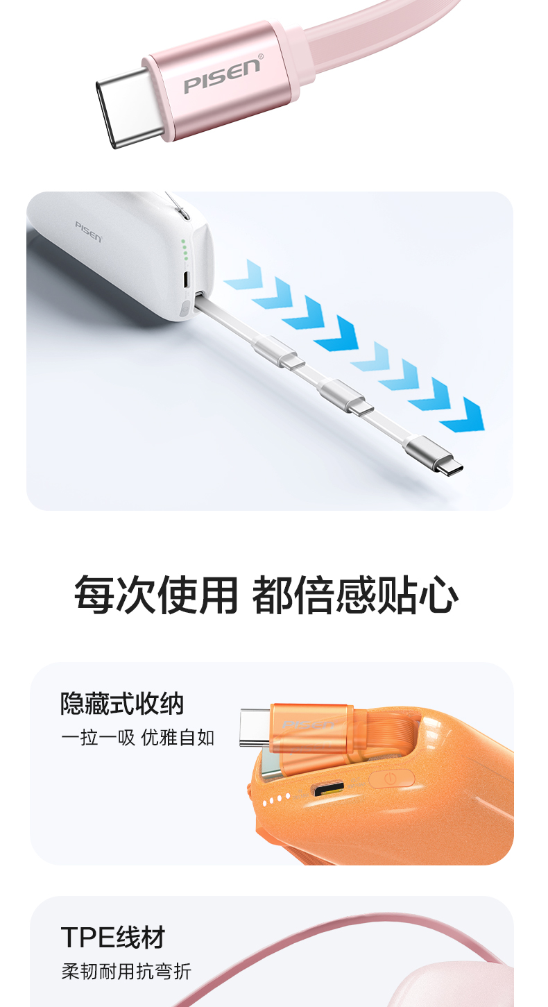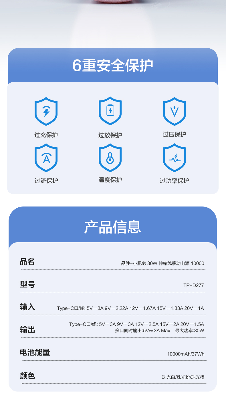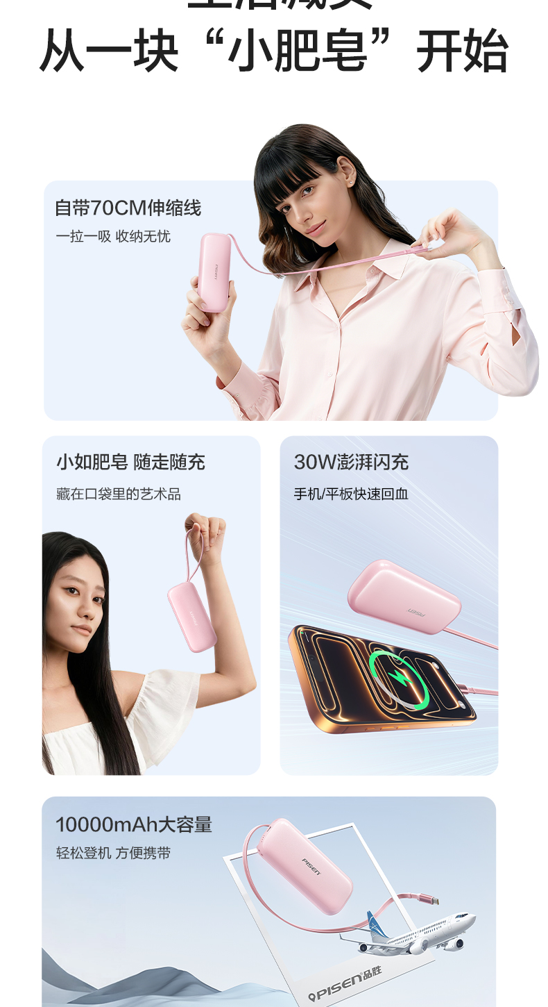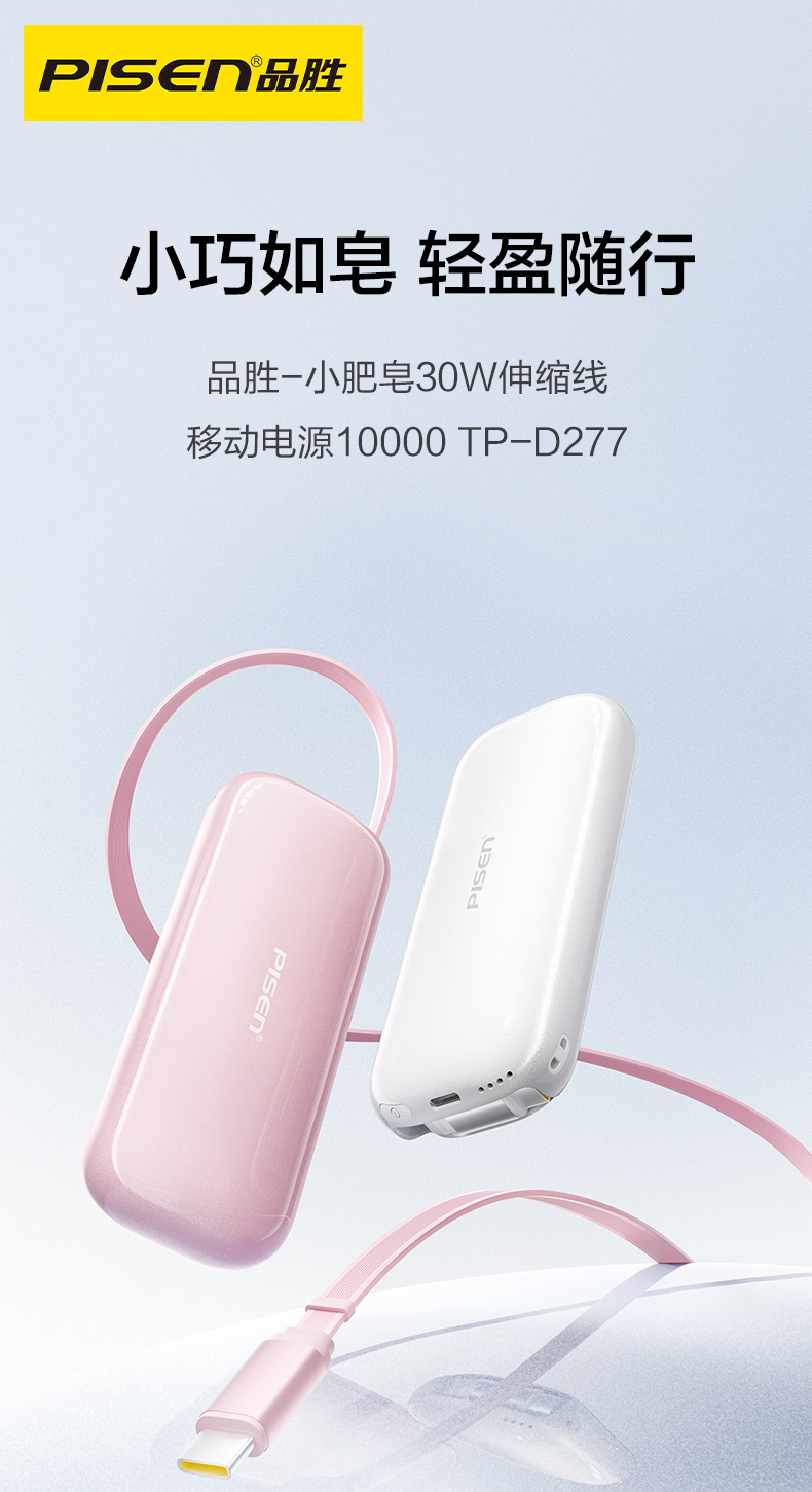 品胜 小肥皂30W伸缩线移动电源10000毫安 自带收缩Type-C线输出充电宝
