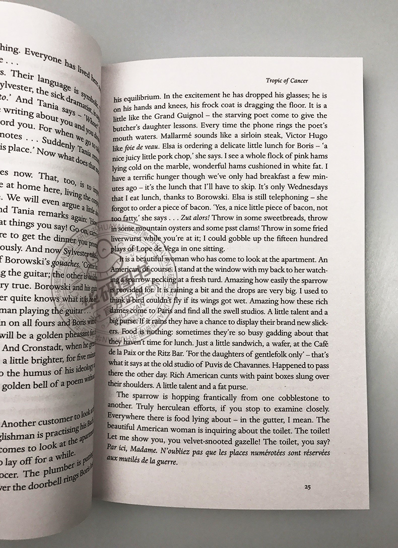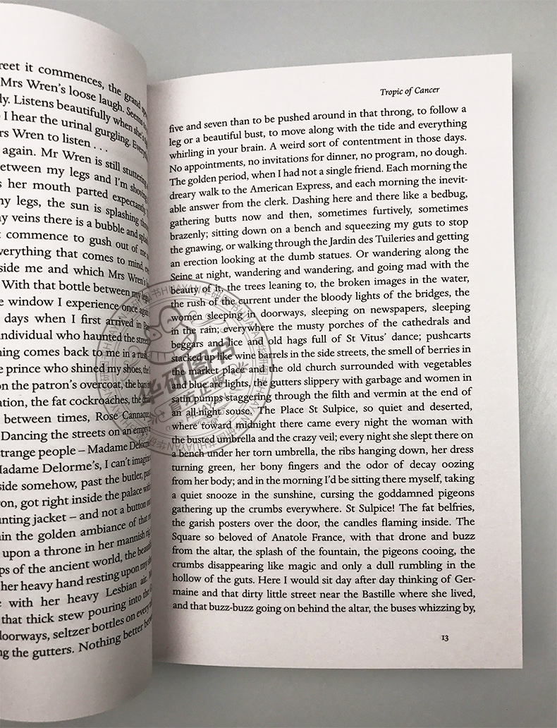 Tropic of Cancer《北回归线》是亨利•米勒自传性三部曲之首,描写了米勒同几位作家、艺术家朋友旅居巴黎的生活经历,同时通过对工作、交谈、宴饮等夸张、变形的生活细节的描写,展现了穷困潦倒的艺术家们的内在精神世界,诘问了在这个杂乱无序、肮脏的世界生存的意义。