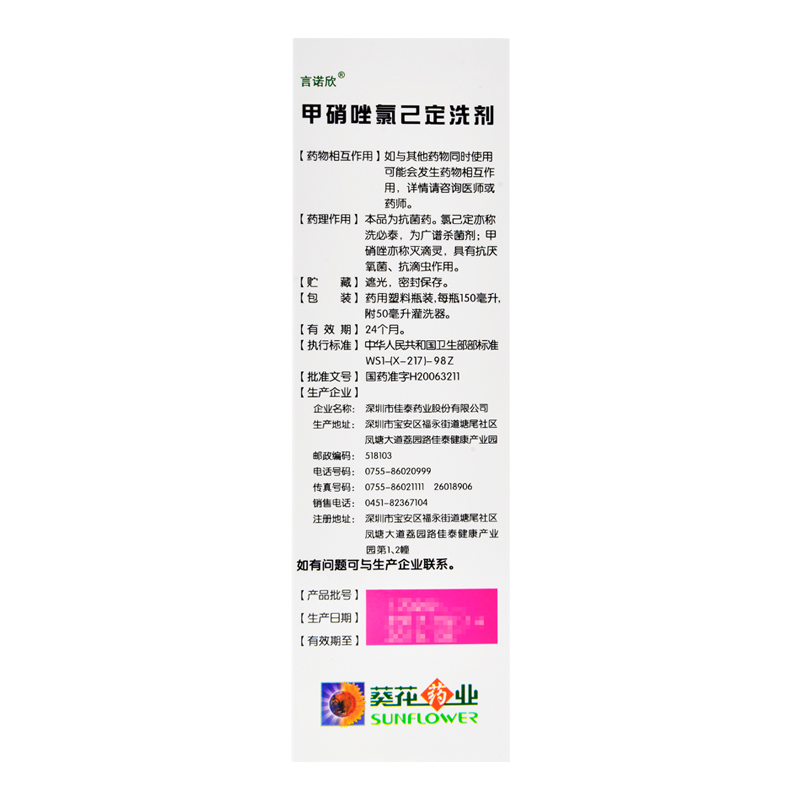 葵花言诺欣 甲硝唑氯己定洗剂150ml滴虫性霉菌性阴道炎非凝胶栓