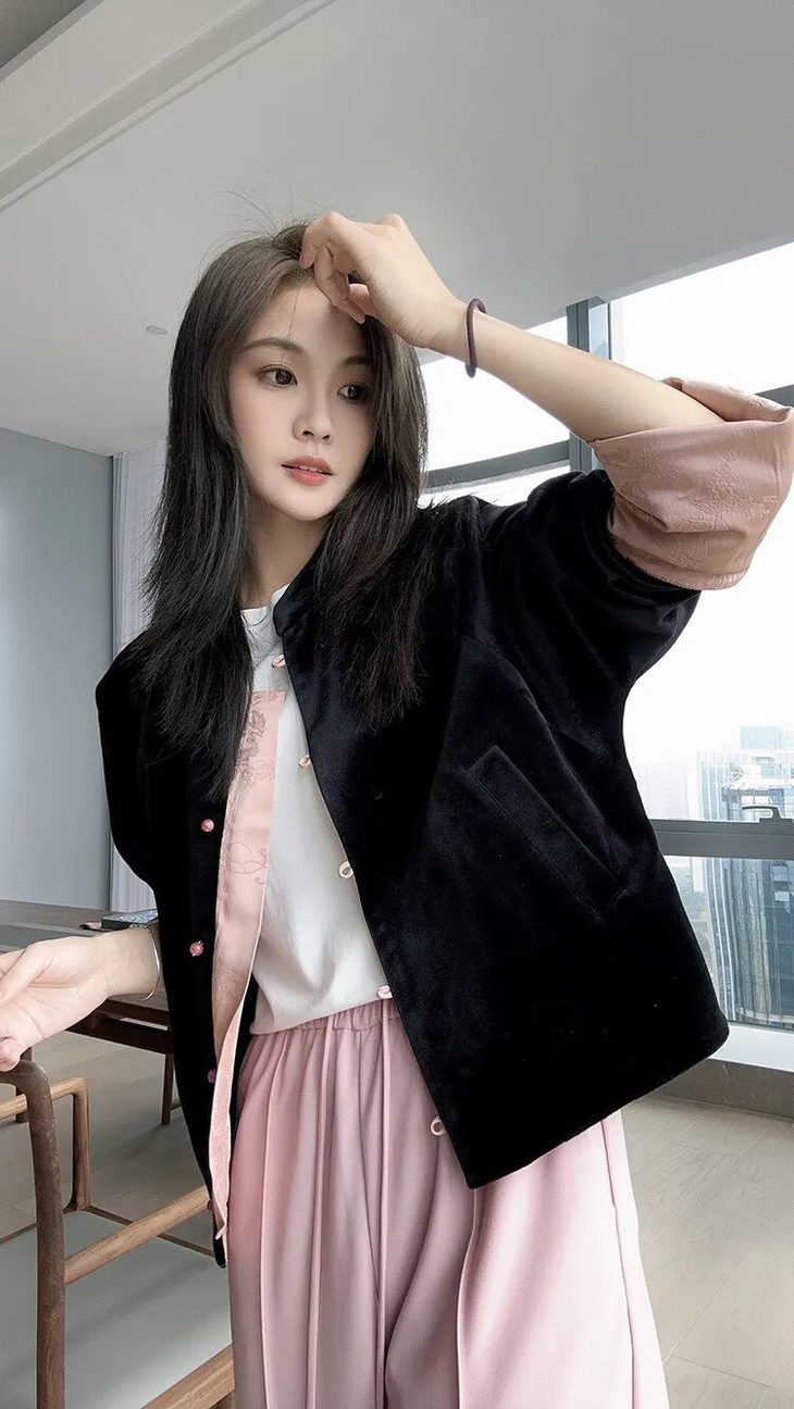 想象一下:沉稳大气的黑色主体上,袖口不经意地翻出一抹柔和的粉,如同黑夜中悄然绽放的蔷薇。