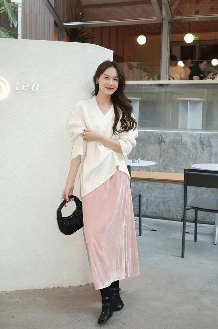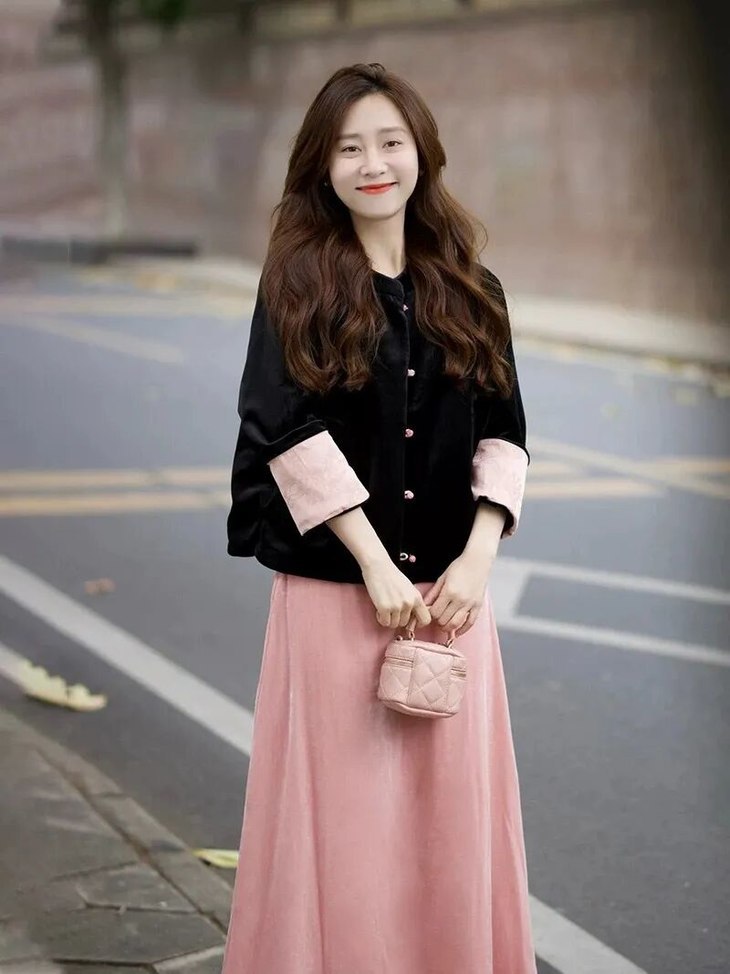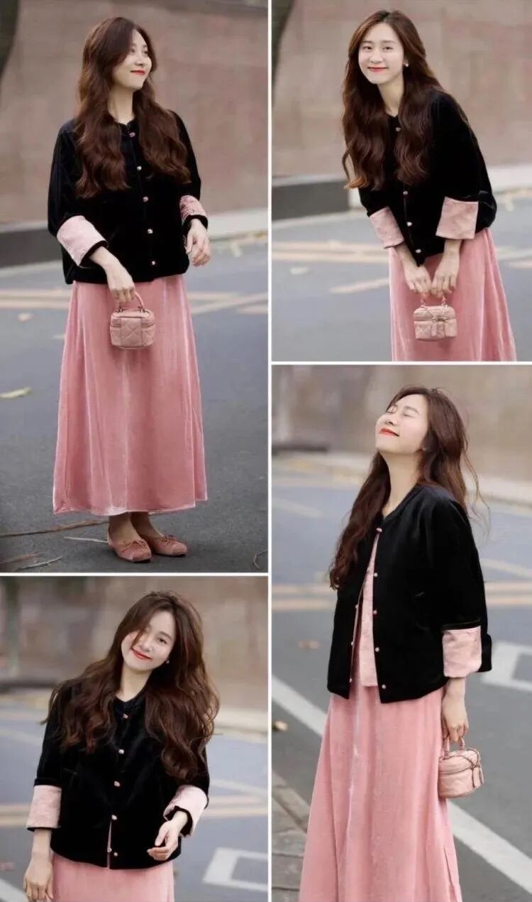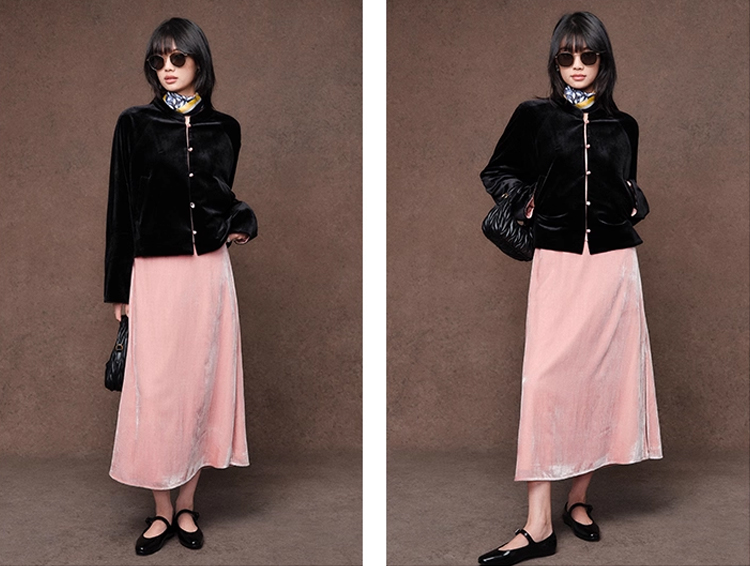 想要更精致的造型?搭配一条黑色丝绒半裙,整体顺色,优雅大方,气质直接拉满。或者,大胆搭配粉色流光丝绒半裙,上下呼应,温柔又吸睛。