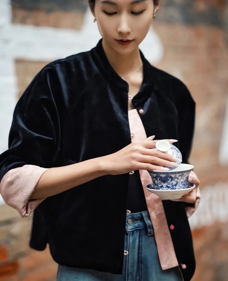 丝绒自带的复古、华丽属性与新中式、国风的调性不谋而合。它天生就带有一种时光沉淀下来的故事感和优雅韵味。