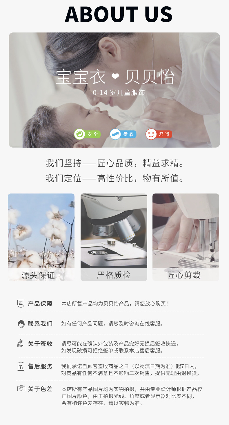 - 贝贝怡专注0-6岁婴幼儿服饰,坚持安全、柔软、舒适的产品理念,为千万中国家庭提供超高品质、安全可靠的婴幼儿服饰产品,妈妈放心,宝宝开心!