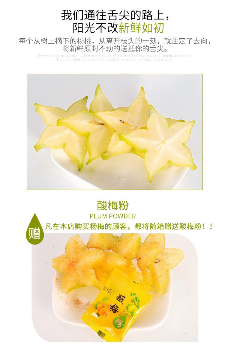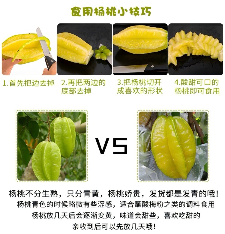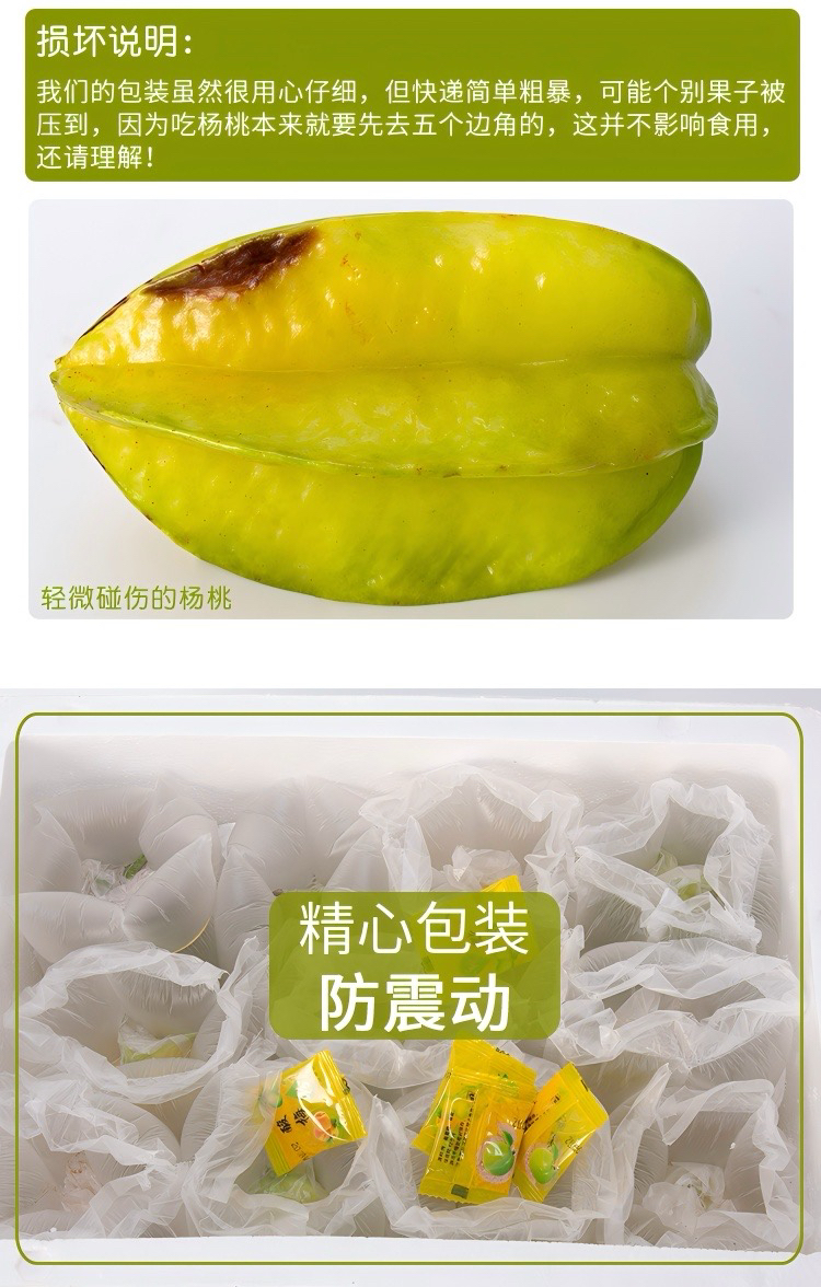 【赔付标准】杨桃比较娇气轻微磕碰不影响吃不售后,坏果超出四分之一按比例赔付,收款金额/总个数坏果个数,坏品及面单正面合拍照,冻伤不售后
