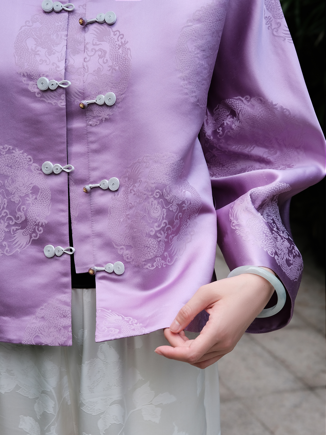 盛唐牡丹|丁香紫花蕾缎双龙团纹外套