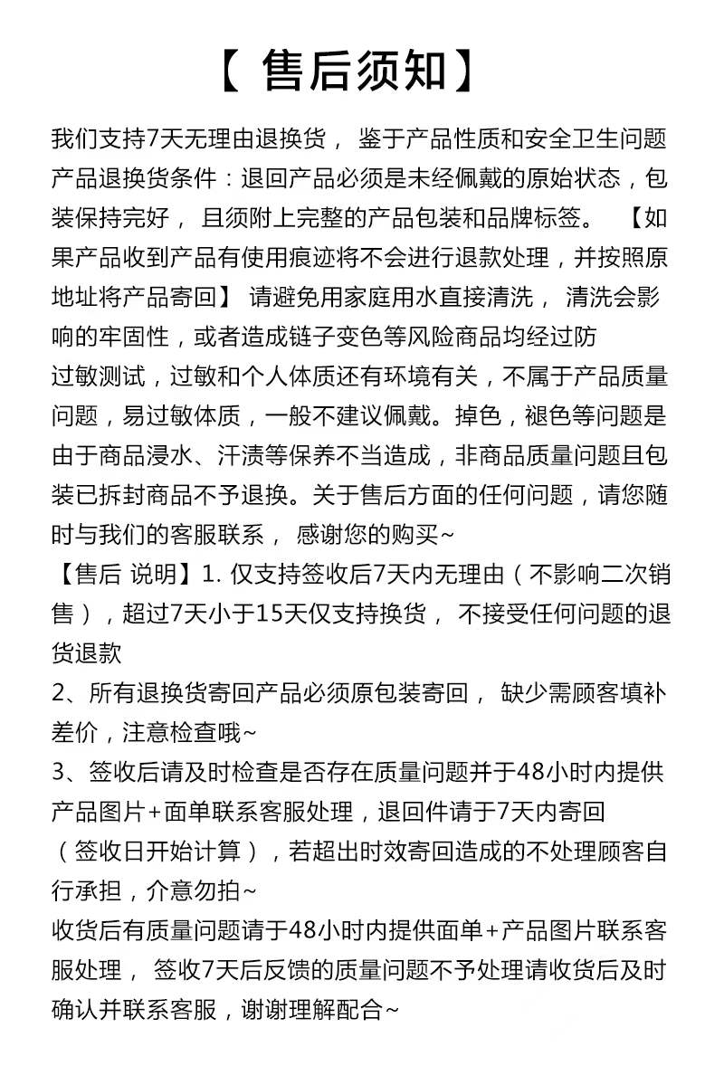 【关于售后】:请认真查看售后详情哦!1️、签收后产品如果存在质量问题,请在签收24小时之内,提供快递面单和产品质量问题同框的照片,联系我们售后处理,超时将无法处理,谢谢理解。2️、产品发货后不能拒签,快递签收时发现任何问题,请及时拍照并与我们联系,我们会第一时间进行处理。3️、下单时一定要仔细检查收货人电话/姓名/地址信息,不要将收货人信息填写在备注栏,每天仓库处理的订单较多,备注信息不一定看到。由此导致货物不能正常送达将不在售后范围内。4️、每天下午15点-18点是仓库发货高峰期,已经配货打包的产品,不支持修改地址和退货退款,由于实际发货到运单号上传中间有24-48小时时差,存在部分订单显示未发货,但实际产品已经打包发走。5️、非产品质量问题,不支持无理由拒收,拒收需要承担来回运费。