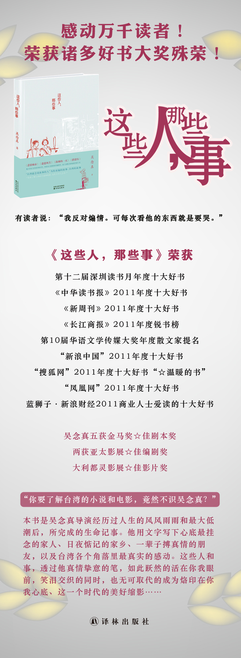 心底挂念的家人,日夜惦记的家乡,一辈子搏真情的朋友,以及台湾各个角落里真实的感动!它们是一个时代的缩影,虽然情感朴素又恣意,喷薄出的却是强大的生命能量与心灵启发。母亲在念真的婚礼上,穿着一辈子没穿过几次的旗袍和高跟鞋坚持跪拜一百下,以谢神明保佑“像我这样的妈妈,也可以养出一个大学毕业的孩子”;那个神算子一样的相命师缓缓道出一切皆属必然;跑片小弟领着一群孩子在海边,把影片拉得长长的,一边跑一边对着阳光看;暗生情愫的技工和中学女生在公车上面对面,各自沉默地吃着面包;更有给念真带来屈辱又为他做面子的弟弟,写遗书说“你要照顾家里,辛苦你了,不过,当你的弟弟妹妹,也很辛苦”。书中的小弟和小妹,老兵或女孩,仿佛就在身边,和我们一起经历着生命中的惊喜与惶恐。作者是台湾人,深沉的文字底下透出浓厚的中国人乡土情怀,感动着同根所生的人们,让我们想念共同的祖先和血脉。有读者说:“我反对煽情。可每次看他的东西就是......