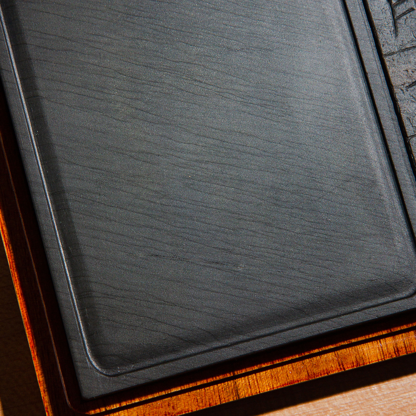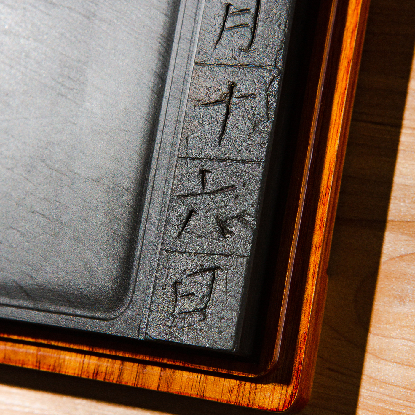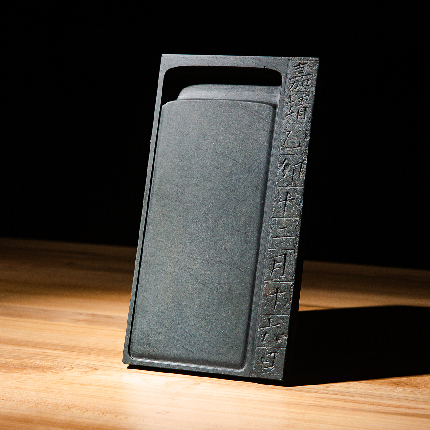 明代歙石残碑为原材料,砚上所刻文字,为明代原碑上的文字(非后刻)。其石质温润,眉纹和金星、金晕石品颇为精美。拥有几百年岁月之积淀,十分难得。