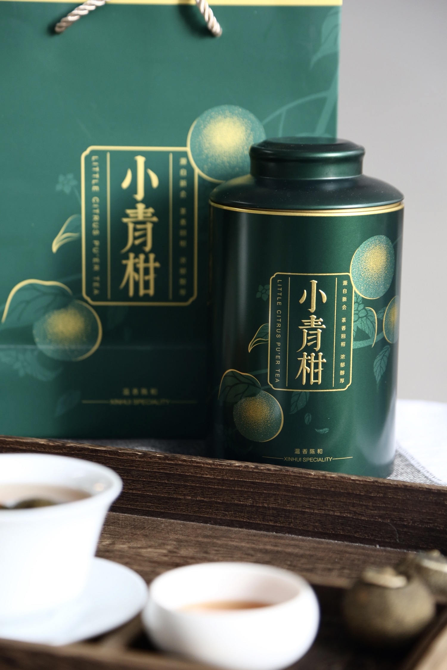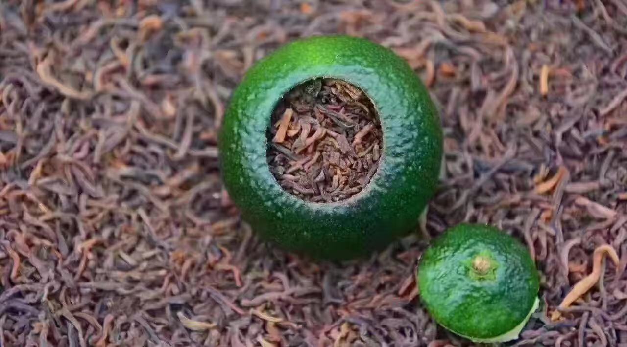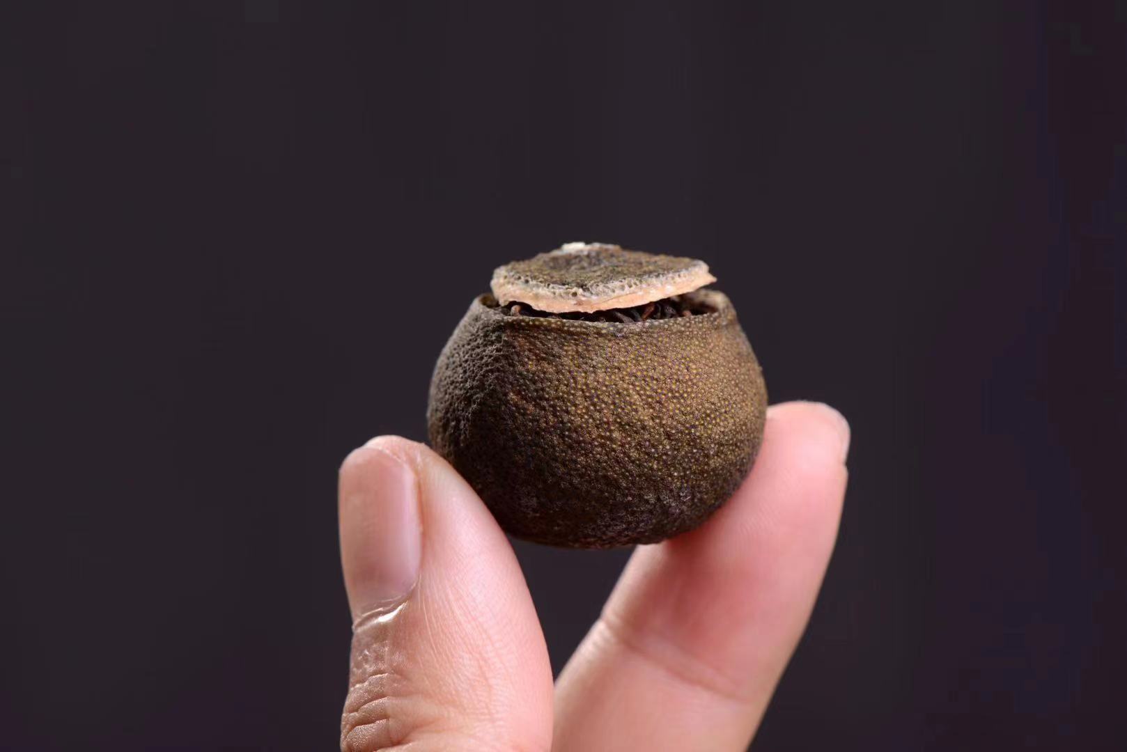 「7-9个月的青柑果挖去果肉填入普洱茶,经过生晒或烘干等工艺制作而成」
