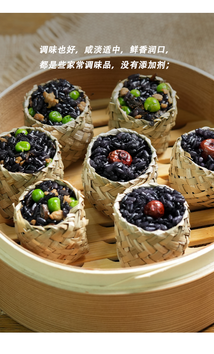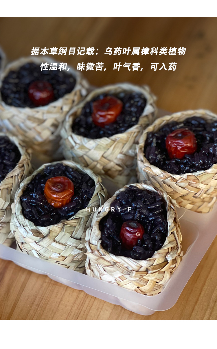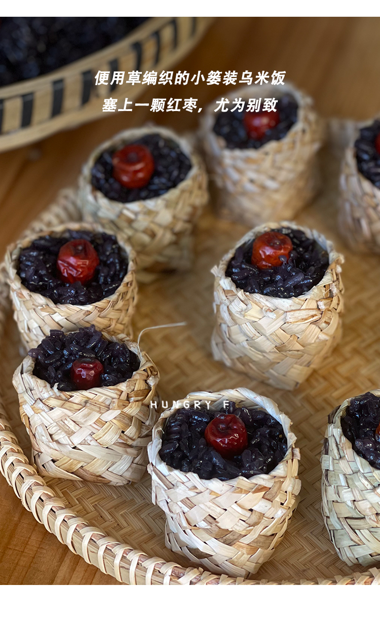 最后,便用草编织的小篓装乌米饭,塞上一颗红枣,尤为别致。