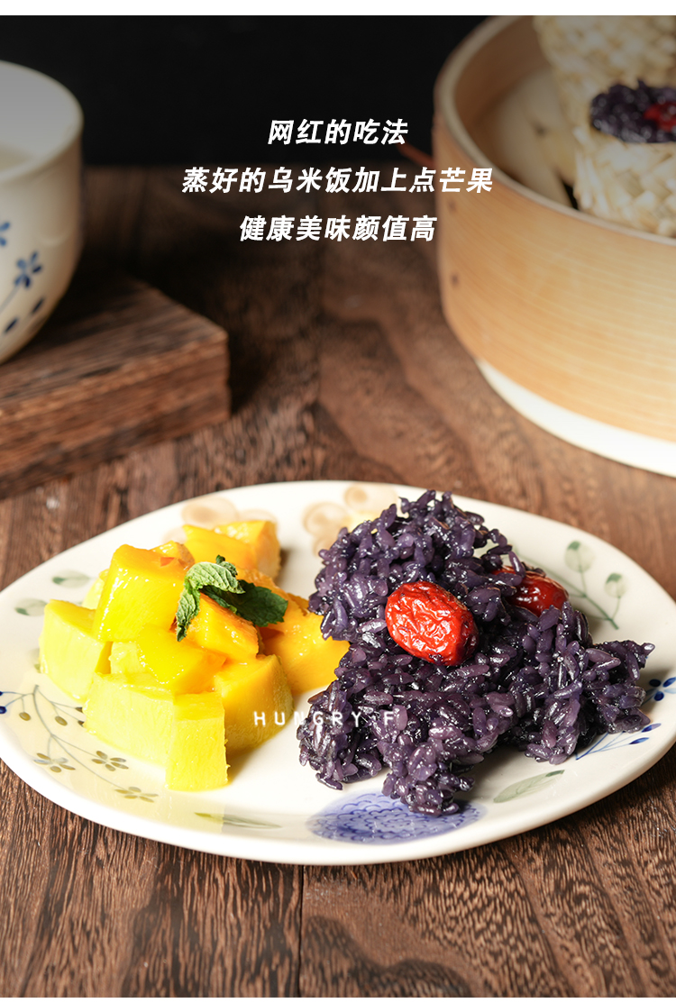 最新网红的吃法我们也给你带回来了,蒸好的乌米饭加上点芒果,香香软软颜值超高。