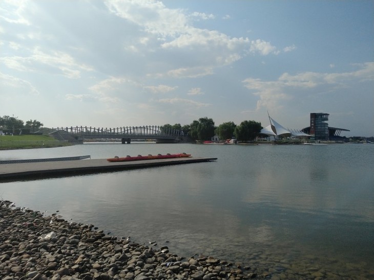 孩子们的宿舍窗户就正对着奥林匹克水上公园的澄澈的大片的湖面!开阔且养眼!小编放一张隔湖远眺的角度大家来感受一下!