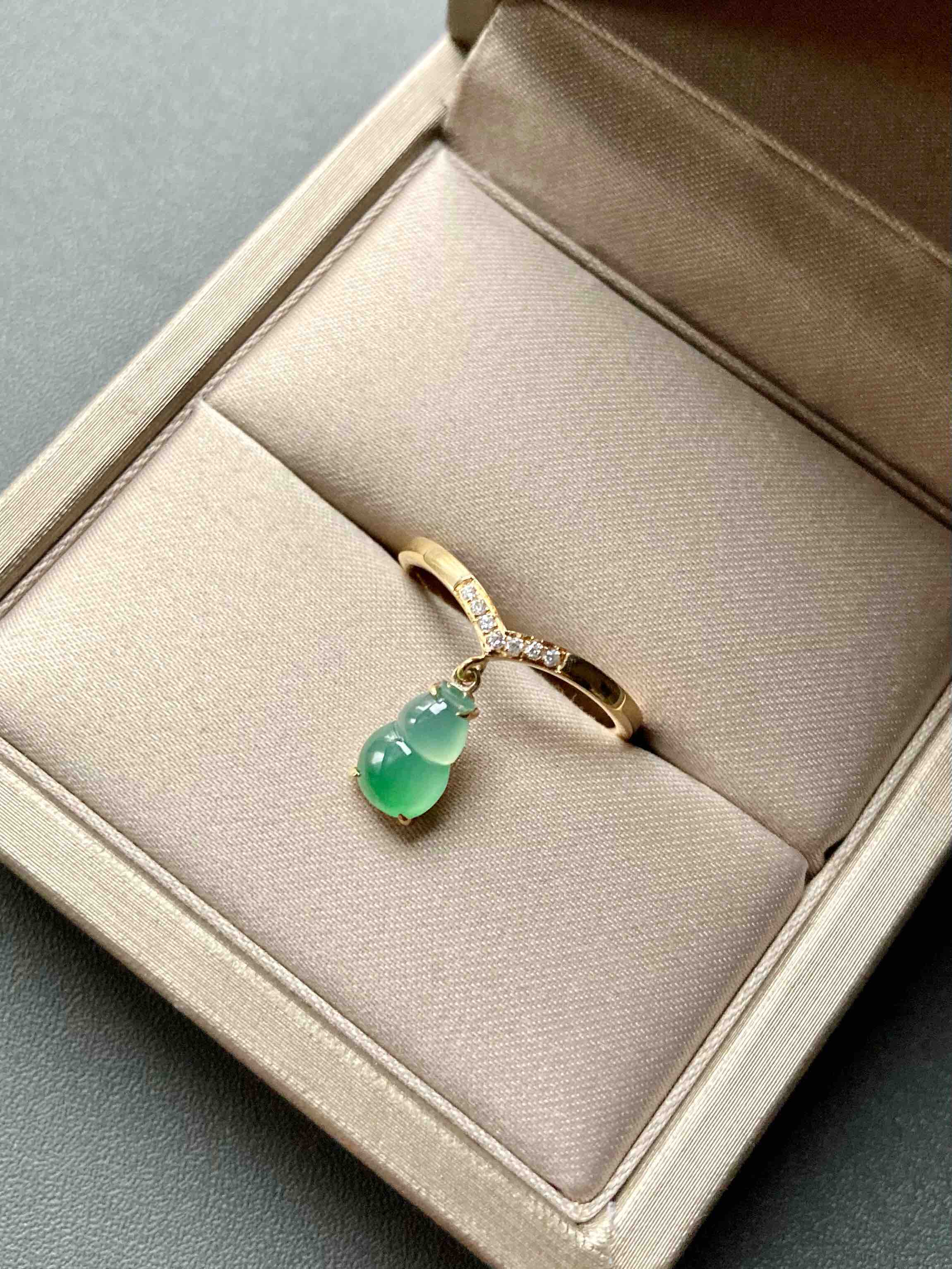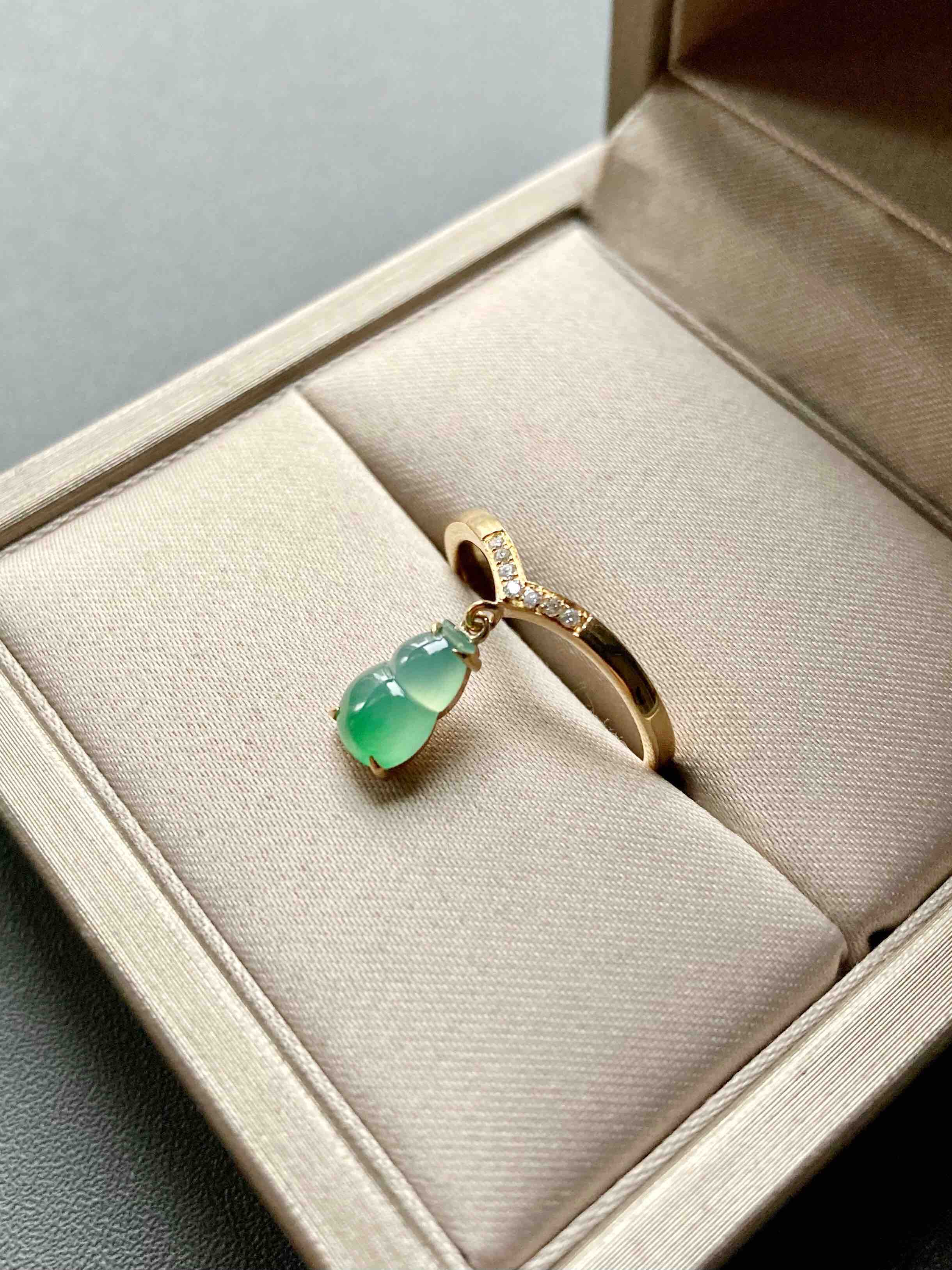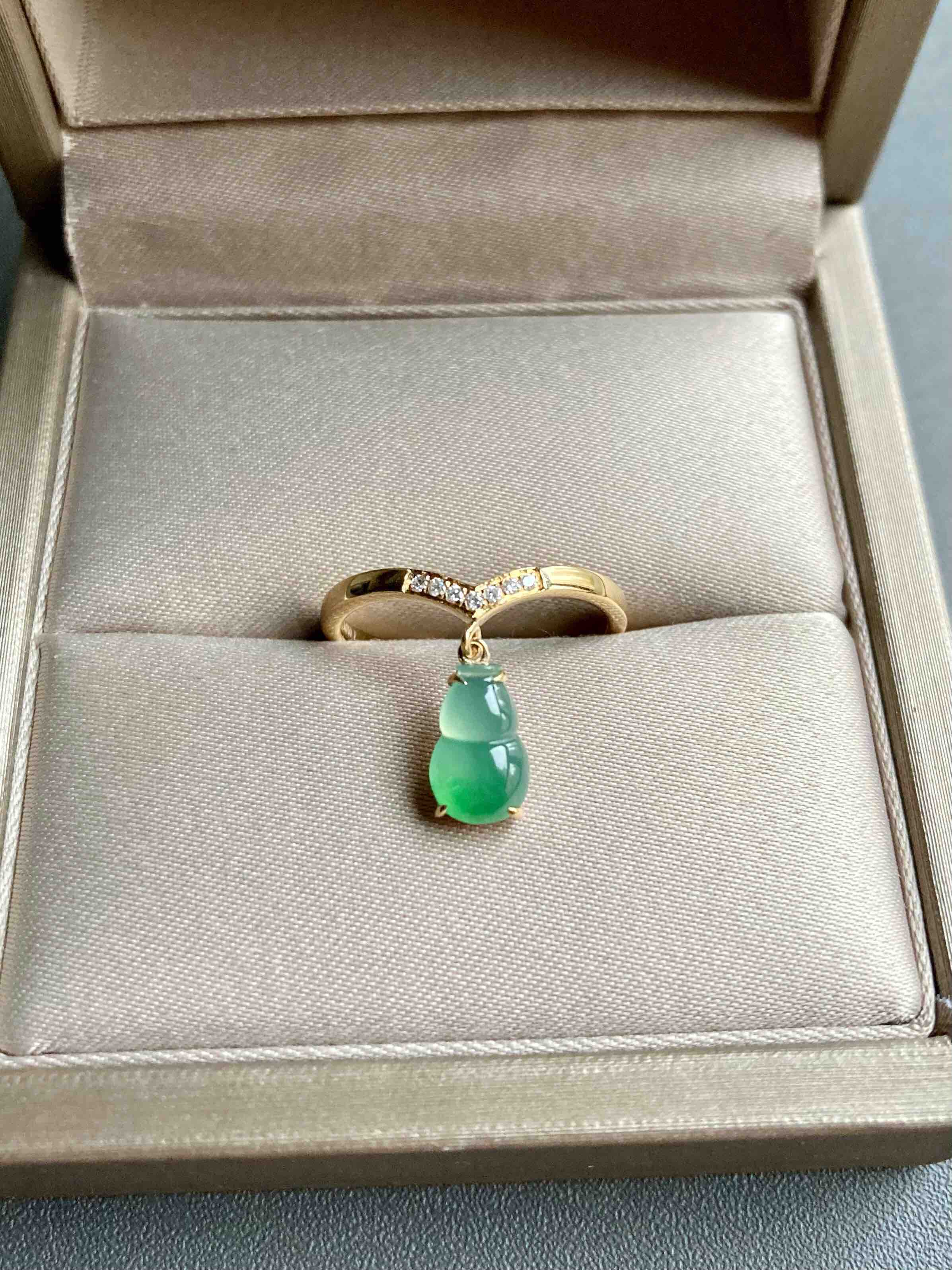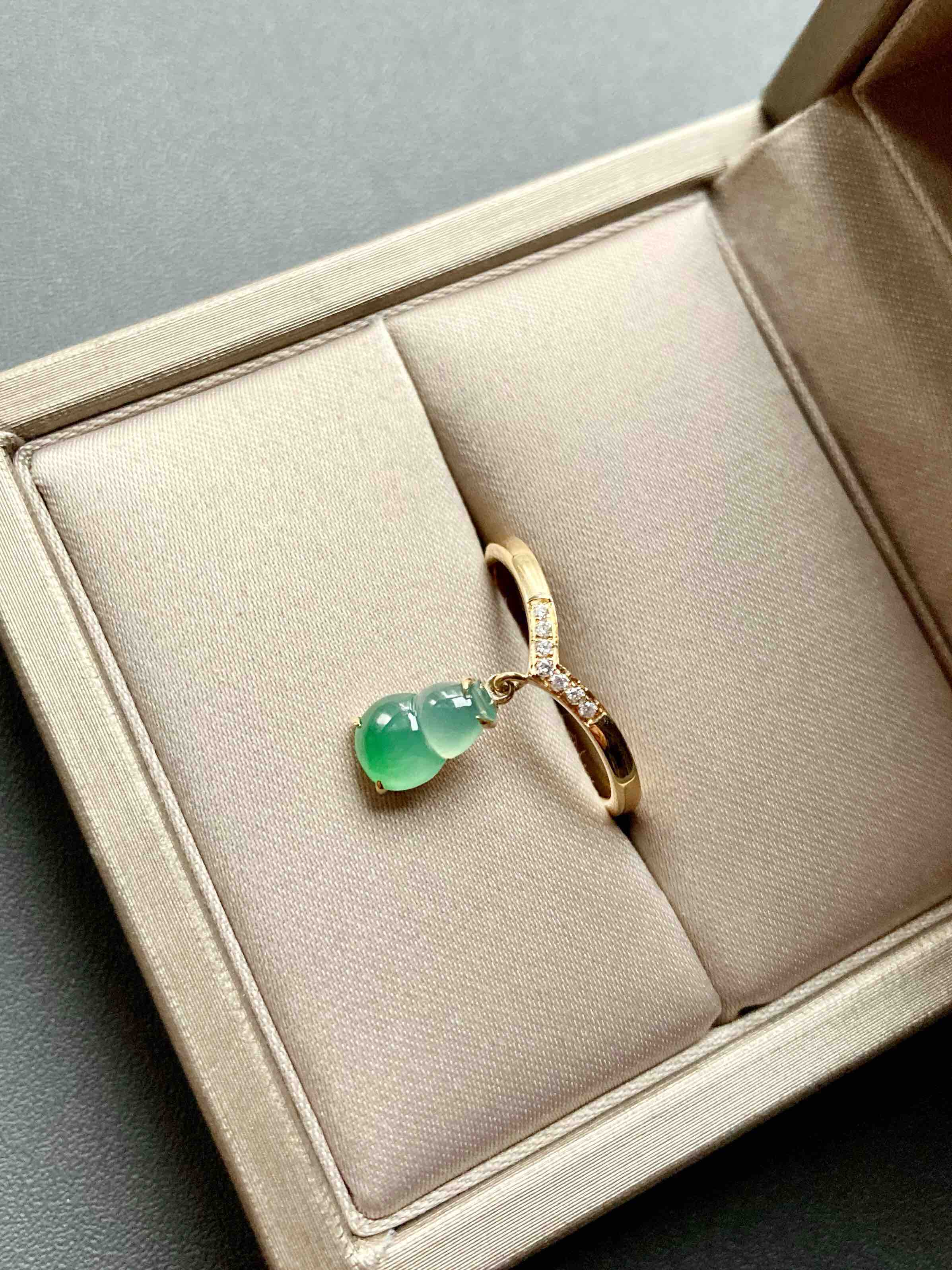 禄来家的爆款,就一件,上哪去找这么灵的高冰种阳绿翡翠葫芦戒指,种水晶莹剔透,荧光四射,阳绿艳丽,18k黄金钻石镶嵌,风水戒指,葫芦是可以活动的,上手摇曳多姿,只要小四价位,卖完了可别再问我有没有