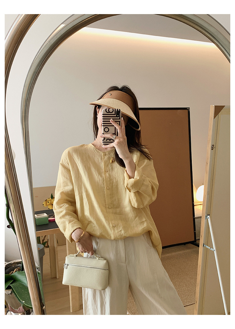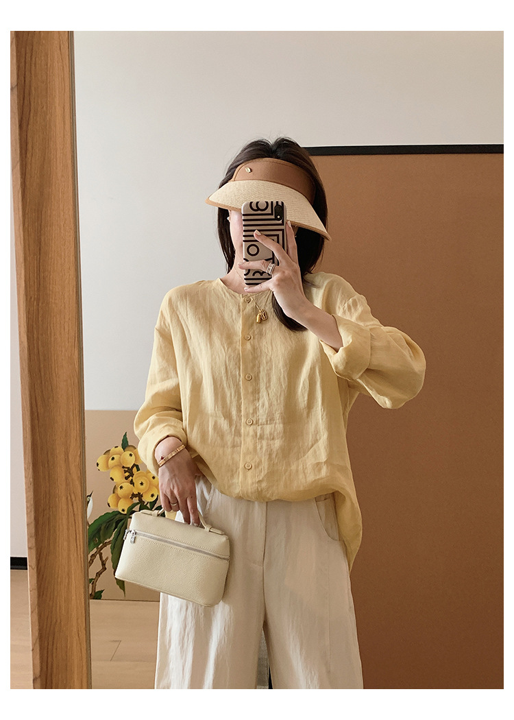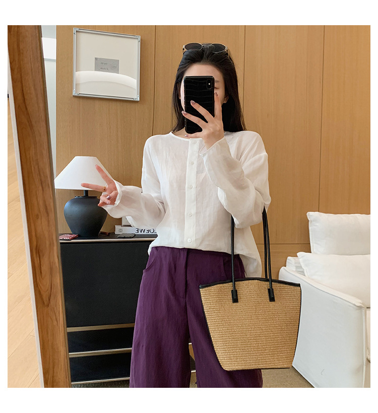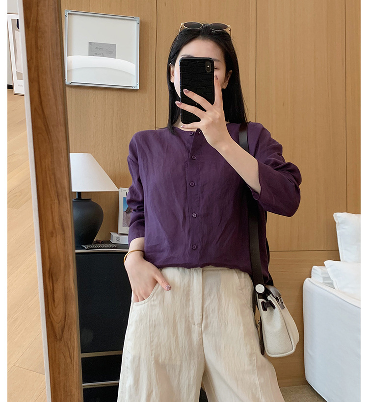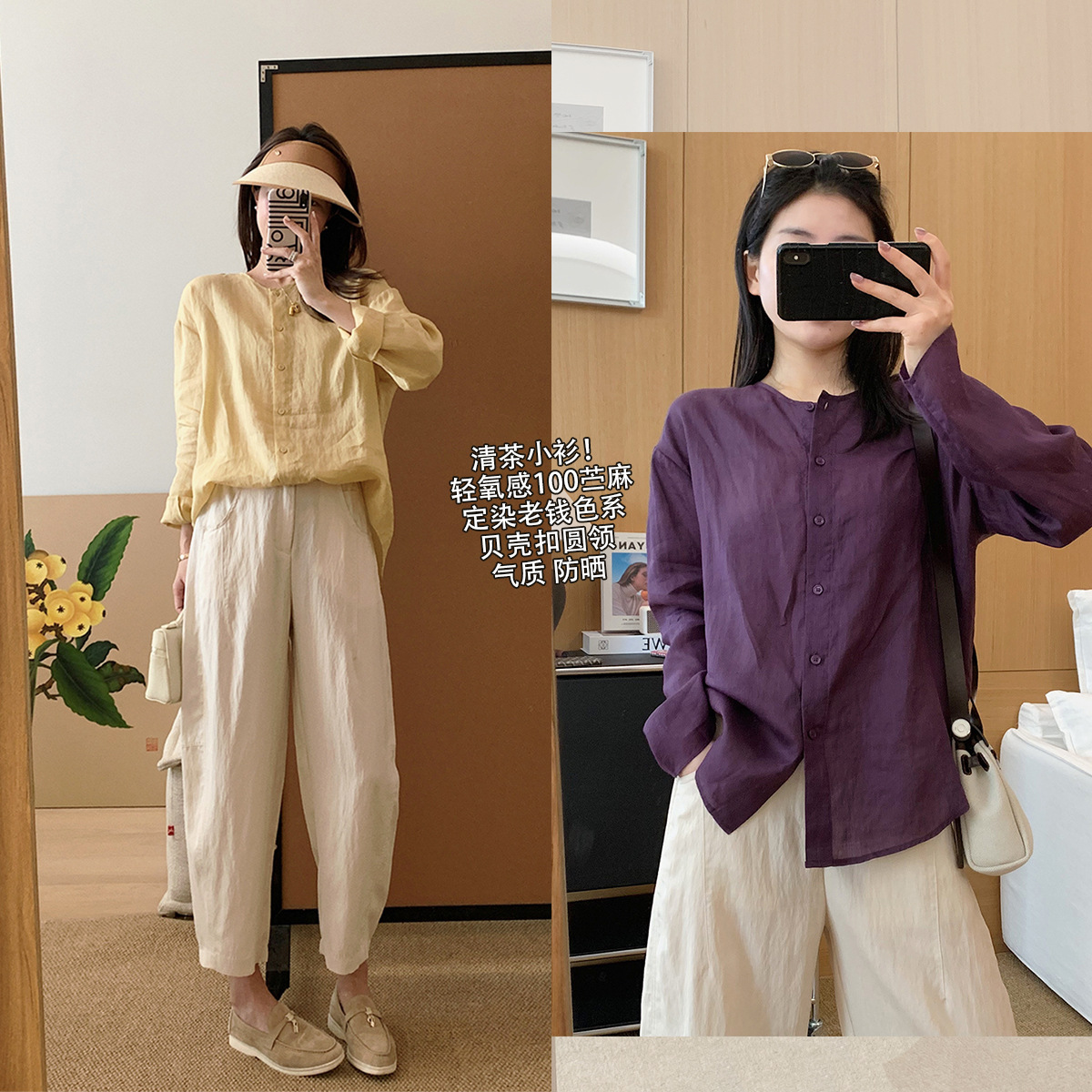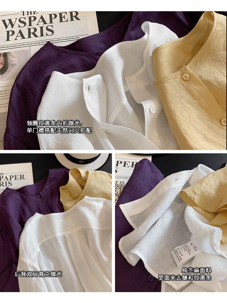 夏日轻氧感天䔳chun苎麻贝壳扣圆领衬衫!#