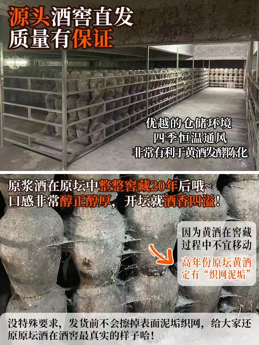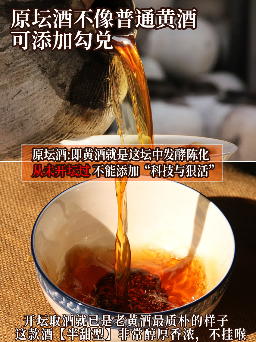 原坛原酒就是在坛内自然老熟,未经勾兑的原浆酒,从未开过坛,真实年份。市面上所谓“干净”的新坛装酒,其实是新酒勾兑少比例老黄酒经高温煎煮重新装坛,反而丧失原坛原酒经岁月发酵产生的益生菌等营养物质🙅