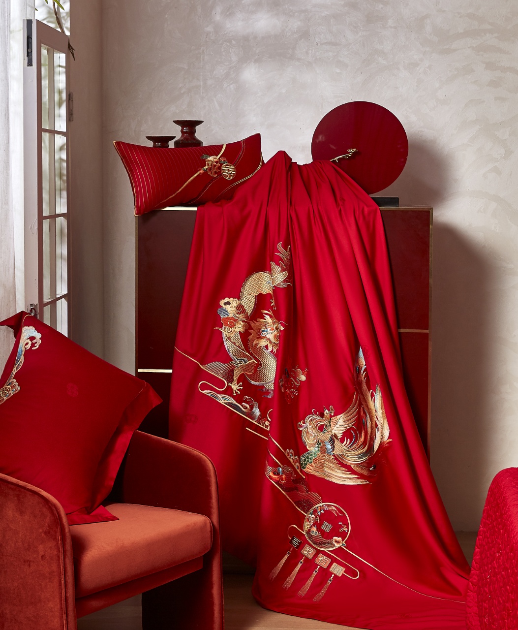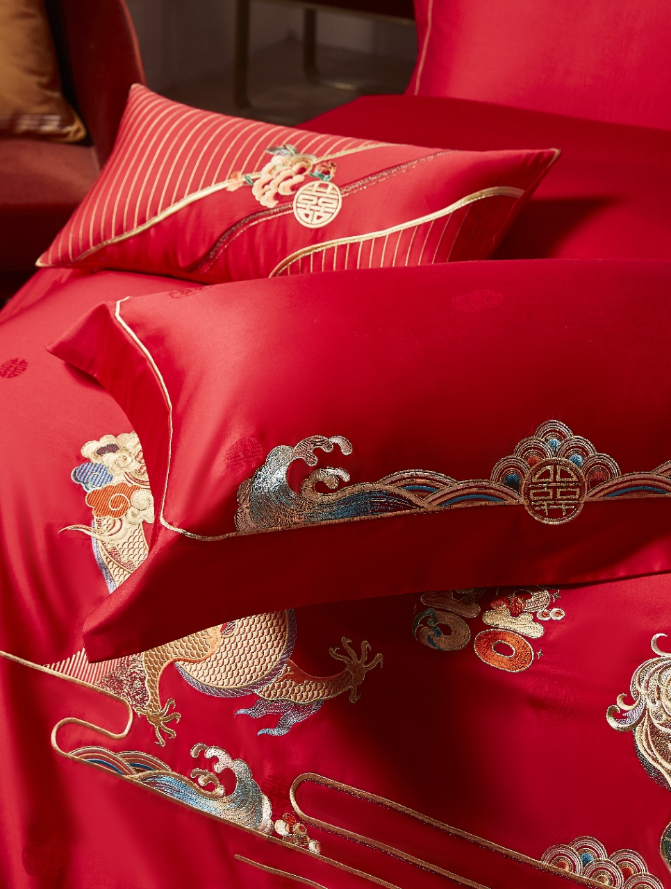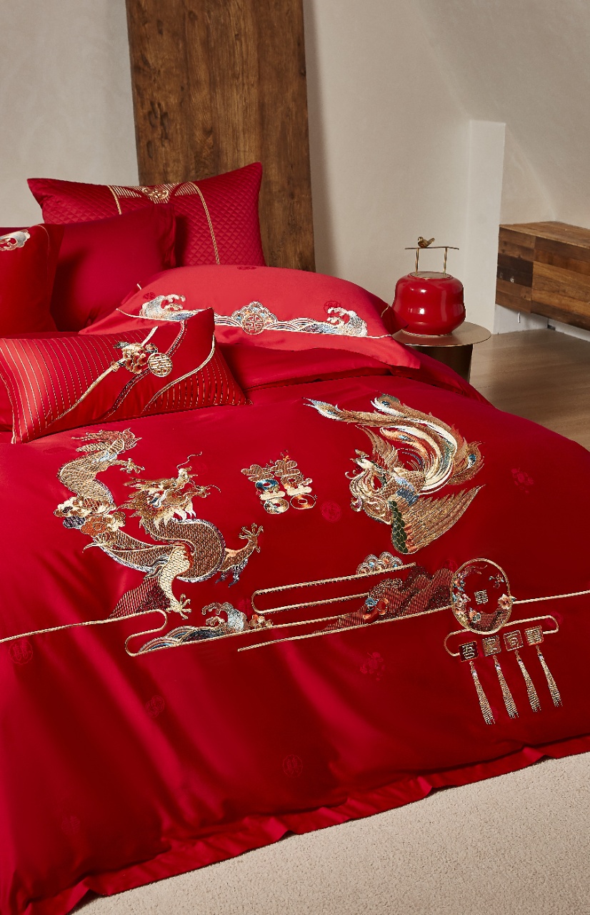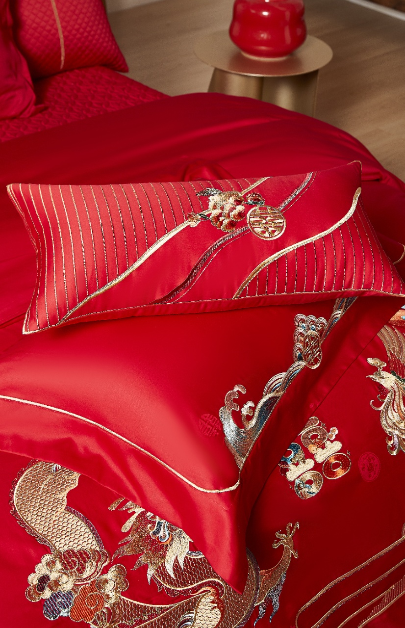 巧思成纹,入东方吉庆。左龙右凤,阴阳相济,是比翼双飞、恩爱缠绵的誓言,寓意心意交融、佳偶天成。锣鼓喧天、鞭炮齐鸣,趣味横生的双喜字,传递着圆满喜乐、爱意永恒的美好祝福。花生寓意好事发生、红枣莲子寓意早生贵子,融于双喜中,象征喜上加喜、福运连连。锦簇盛放的国色牡丹,雍容华贵中透着勃勃生机,寓意爱情生活将如它一般绚烂多彩、繁荣昌盛。巍峨山脉象征婚姻稳如磐石,波涛水浪寓意顺遂无忧、缱绻祥云象征福泽绵长。整套床品延续华夏婚嫁的传统脉络,在时尚新潮中探索创新,重新演绎新中式的东方雅韵。