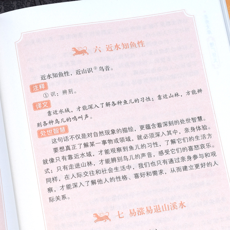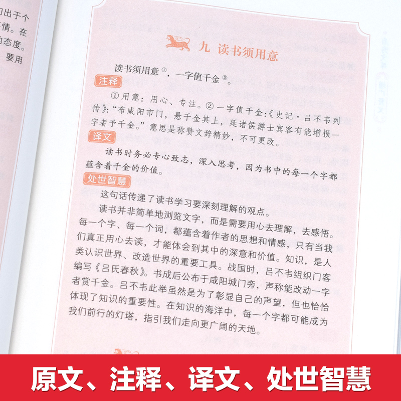 《增广贤文》原名《昔时贤文》《古今贤文》,汇集了从古至今的各种名言、谚语、金句以及文人雅士智慧结晶的著作,以简洁明了、通俗易懂的语言,深刻阐述了人生哲理、处世智慧和修心法则。它是一部具有悠久历史和深厚文化底蕴的经典之作。本书中的每条金句体例分为原文、译文、处世智慧三部分。其中,“译文”部分以直译为主,意译为辅;“处世智慧”部分是对原文的赏析以及引申拓展。