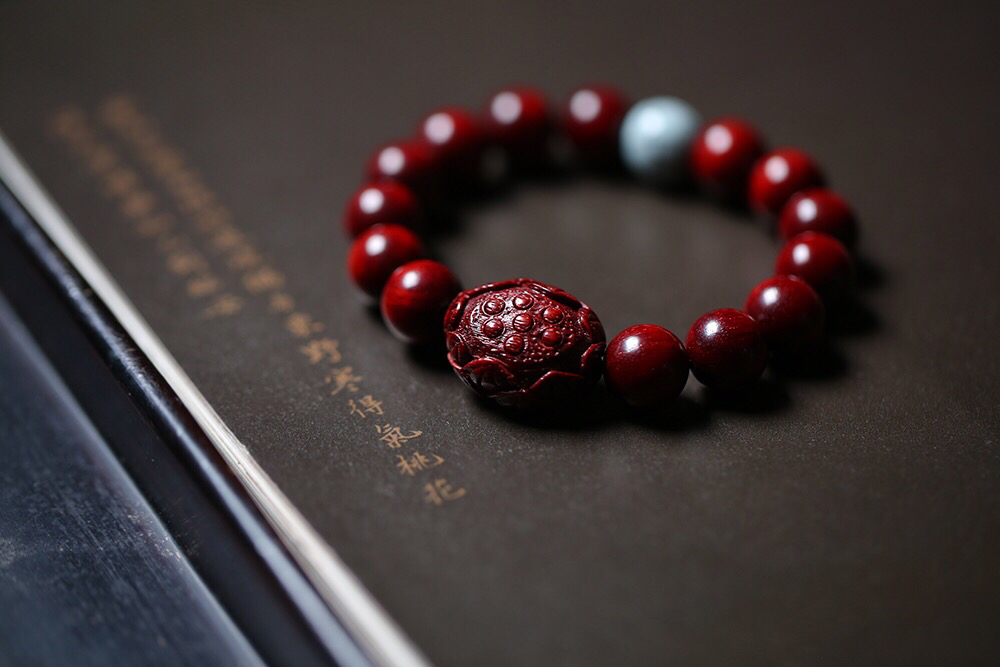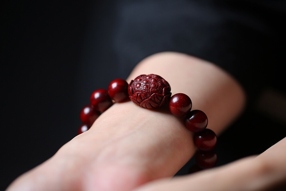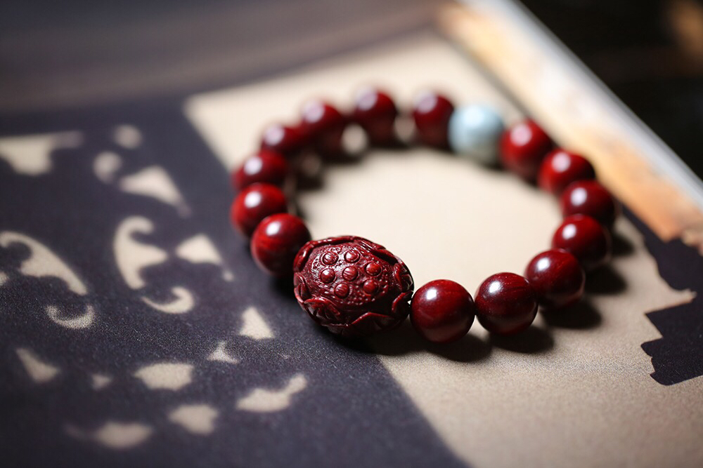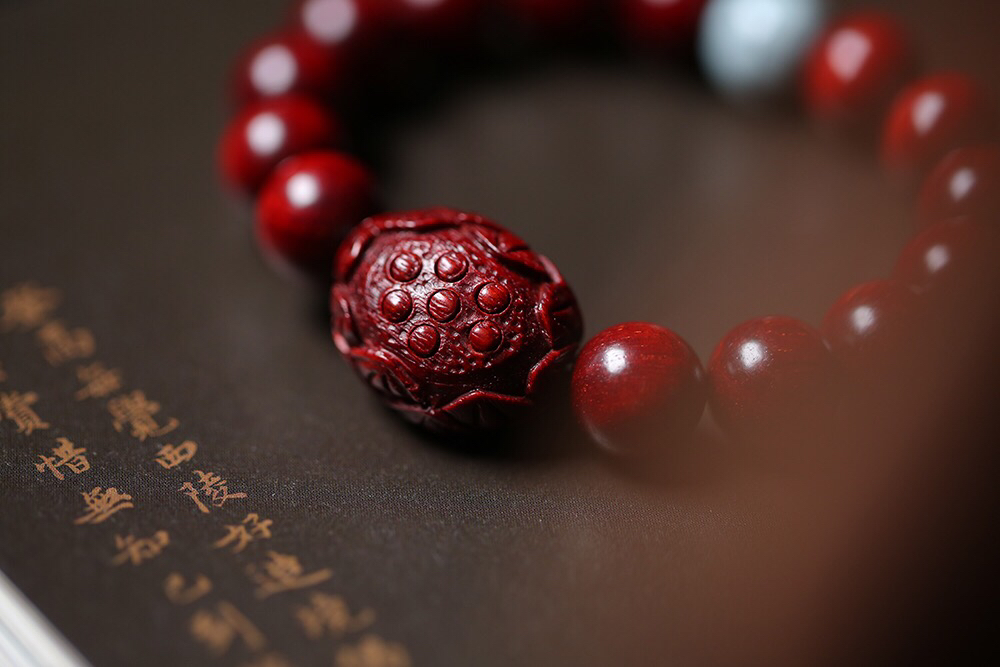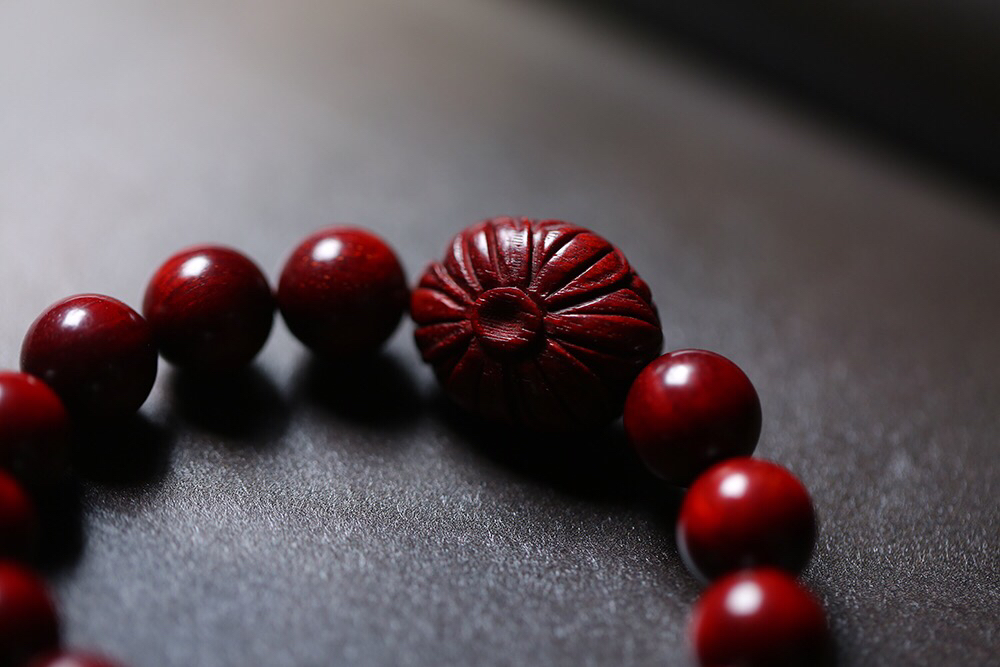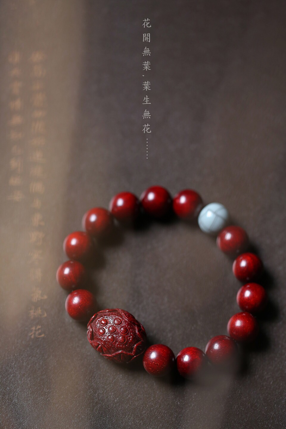 宝贝精选了非常优质的小叶紫檀料制作而成,料质细腻,油性足,颜色红润,颜值特别的高。最大的特色在于彼岸花的雕刻以及汝窑珠子的雕刻,非常的有特色,日常把玩佩戴,性价比特别的高,也很有韵味特色,很值得入手!