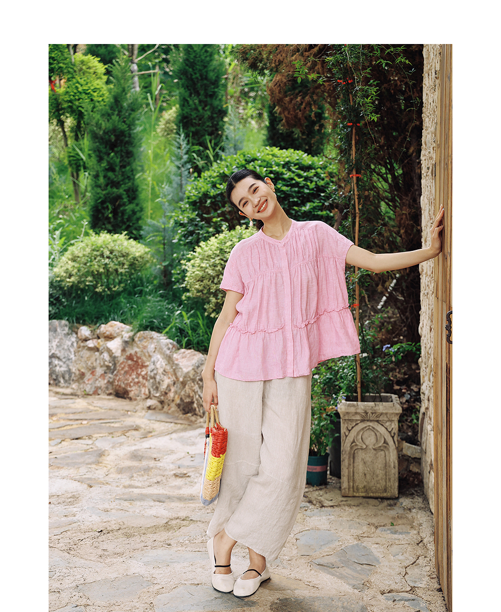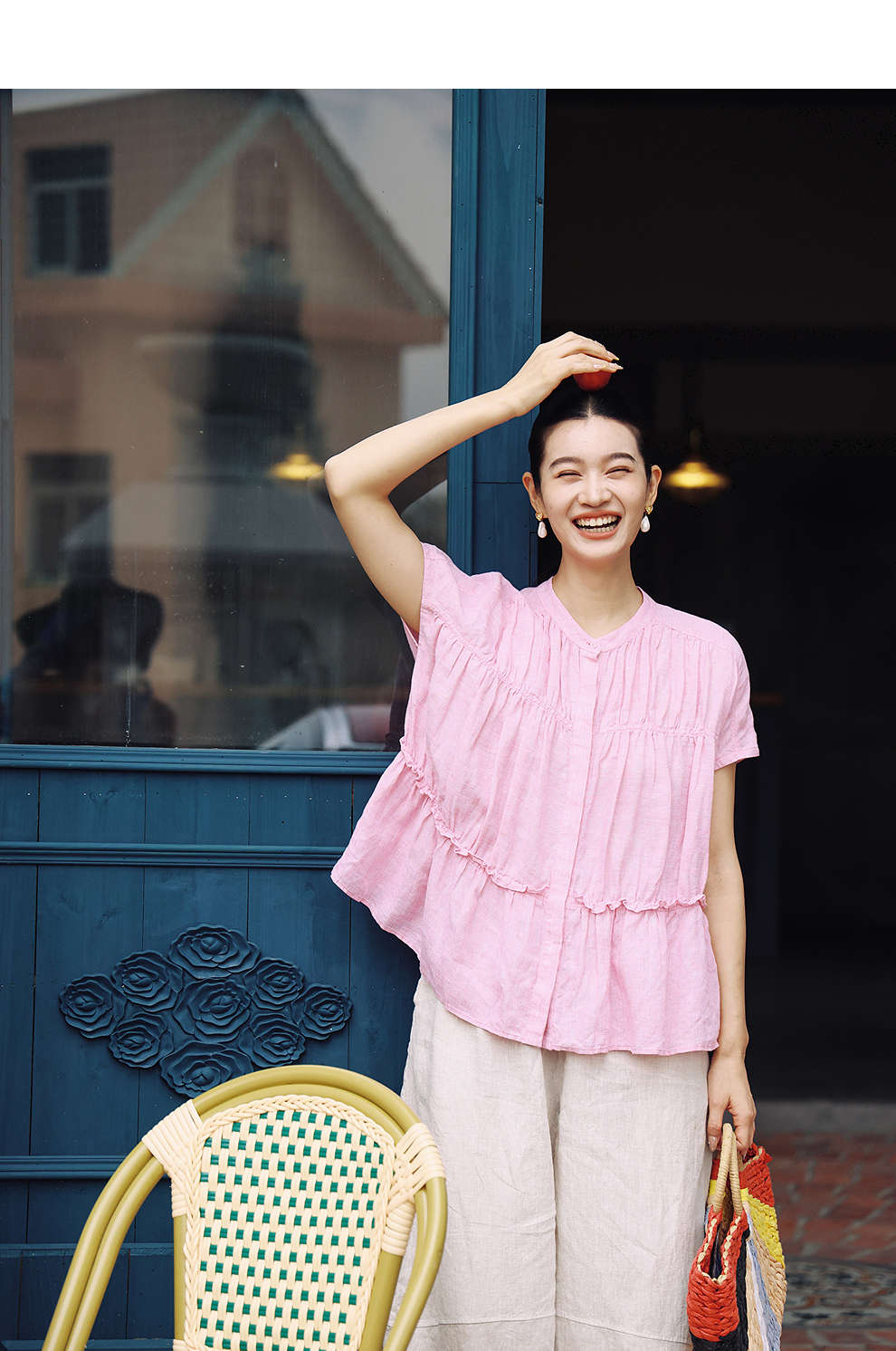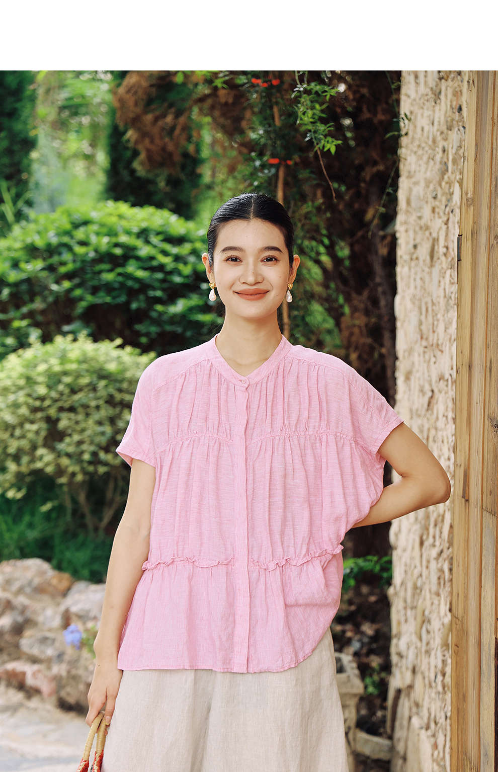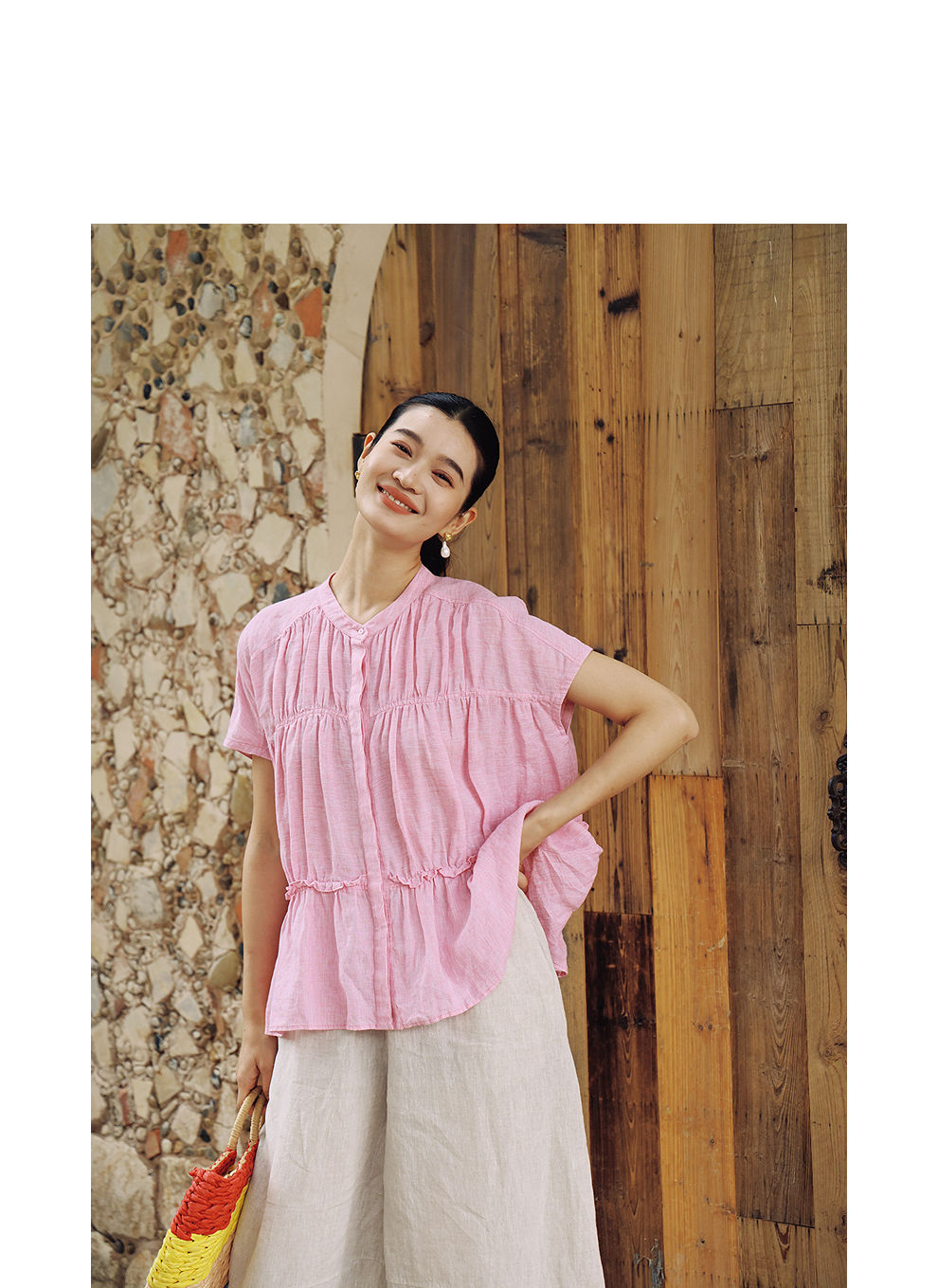 绽放367朵/【多巴胺系列】色织亚麻小立领开襟捏褶层次感短袖小衫