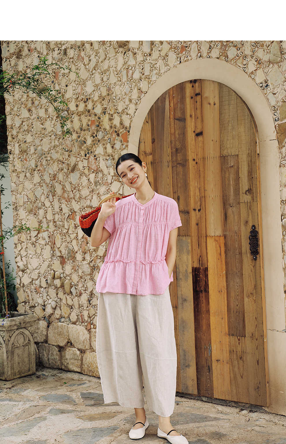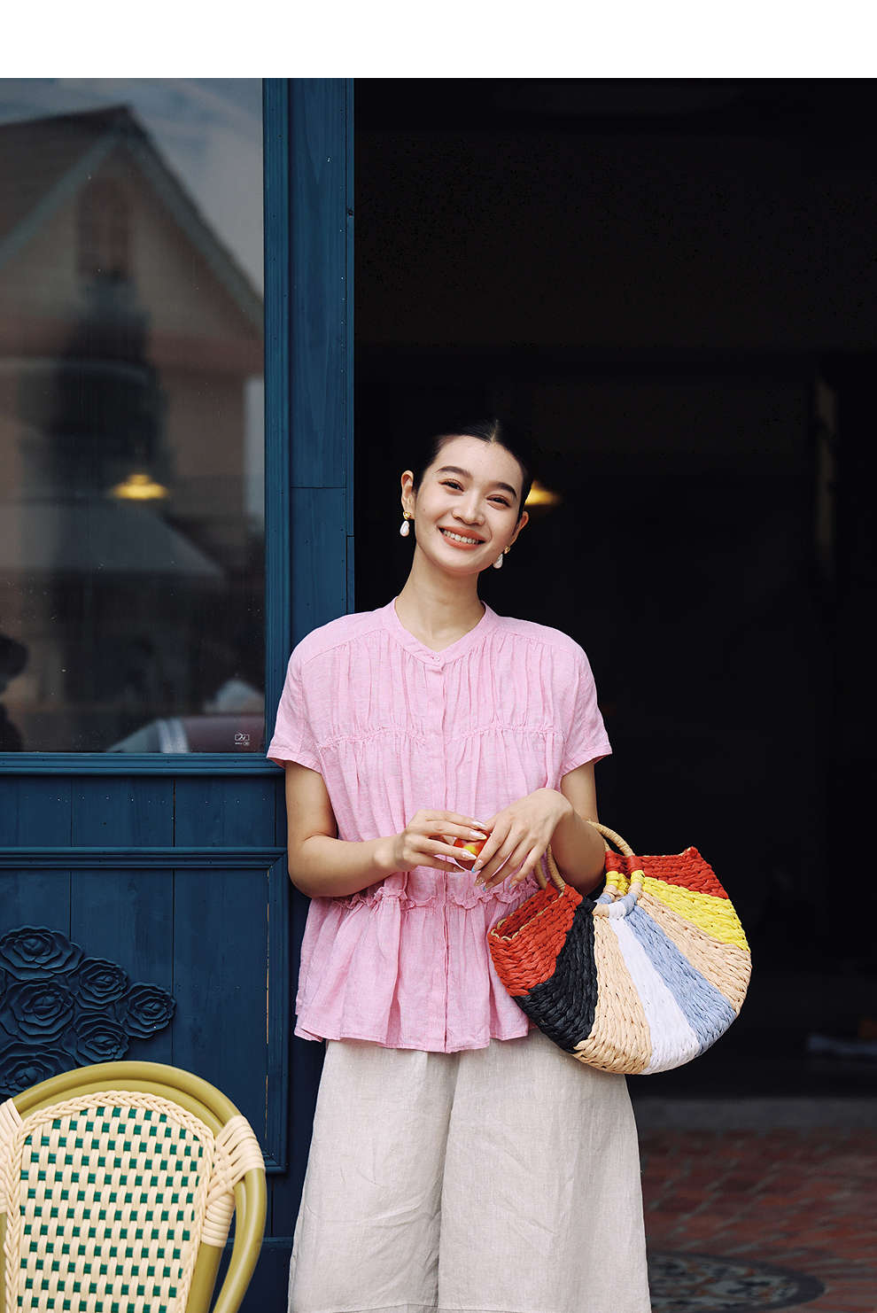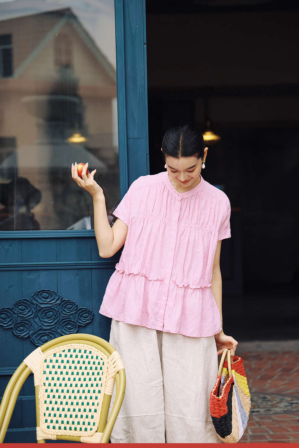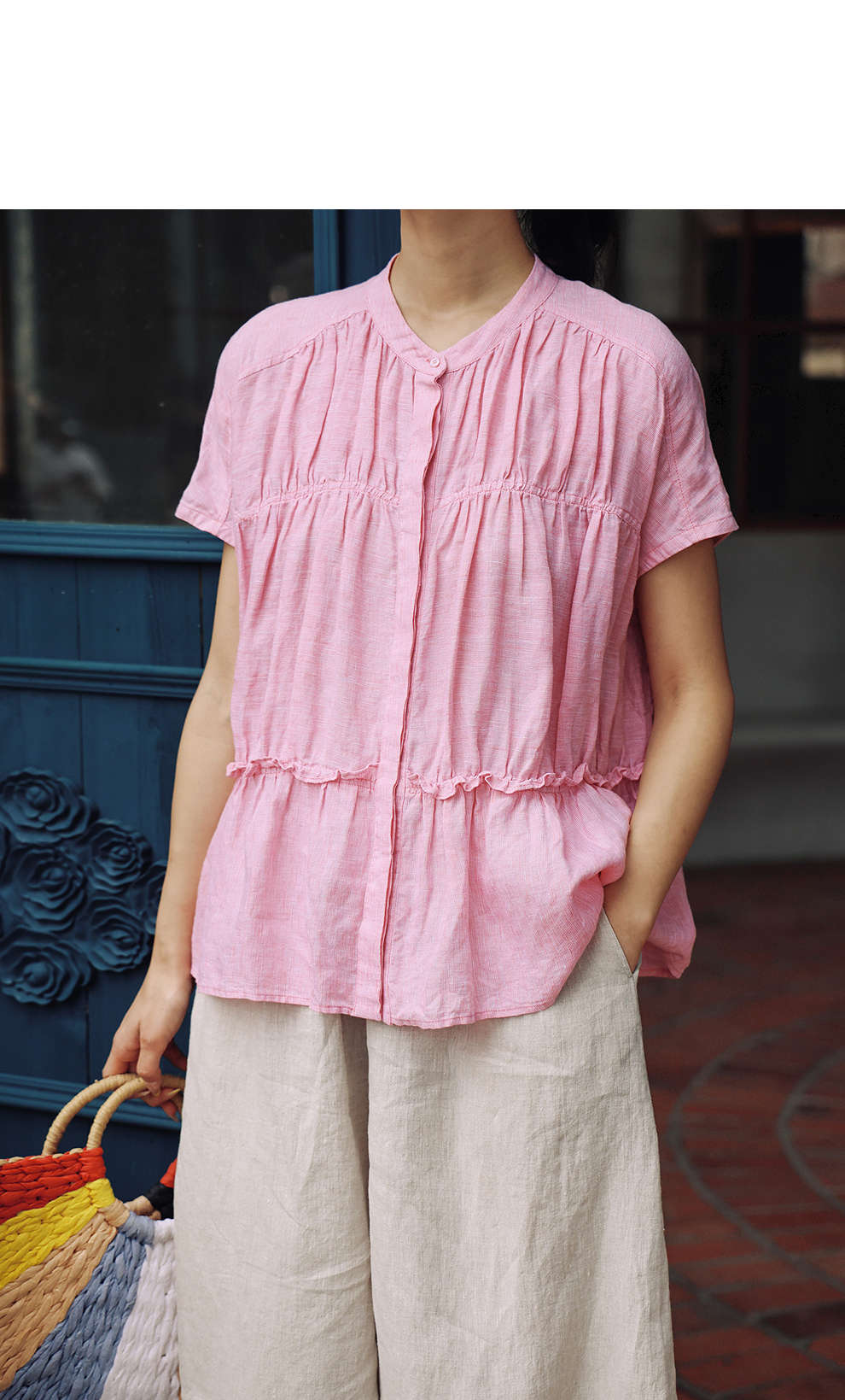 绽放367朵/【多巴胺系列】色织亚麻小立领开襟捏褶层次感短袖小衫