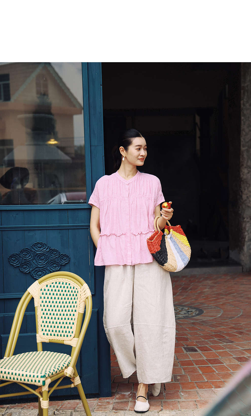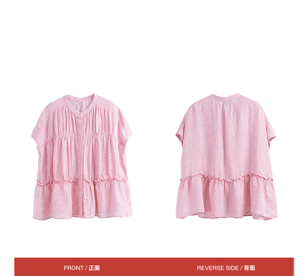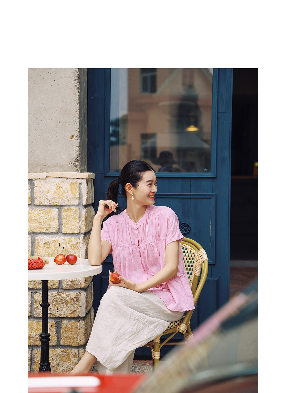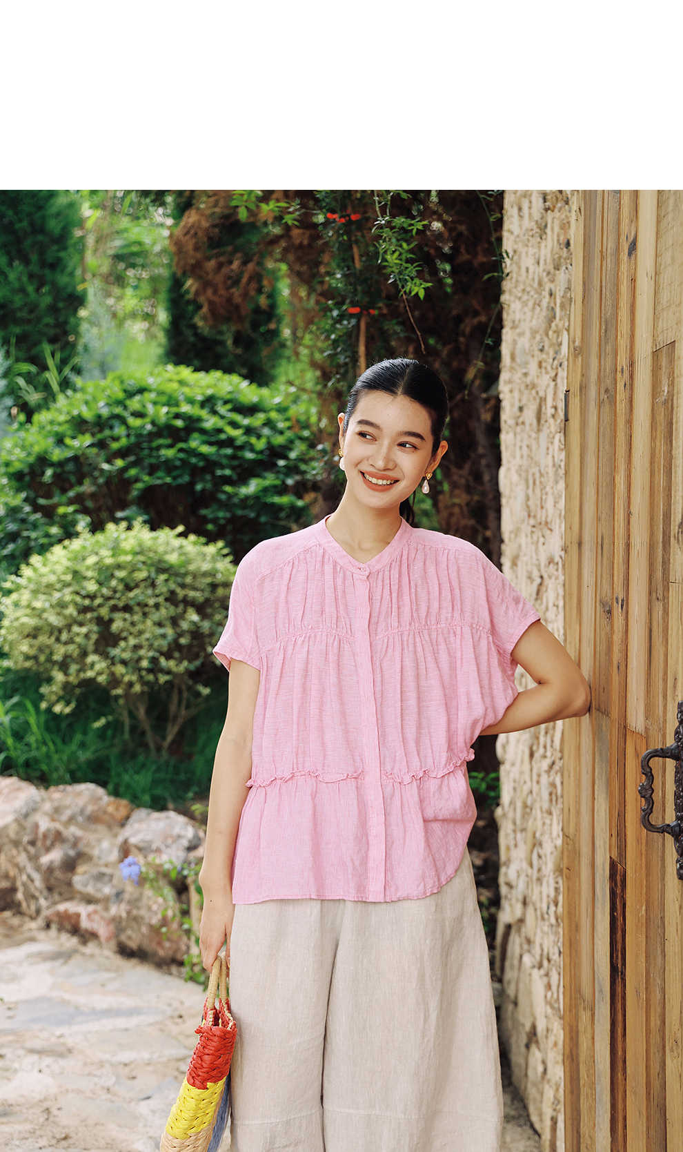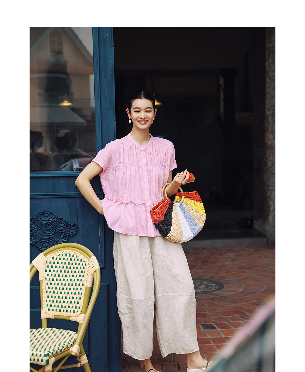 绽放367朵/【多巴胺系列】色织亚麻小立领开襟捏褶层次感短袖小衫