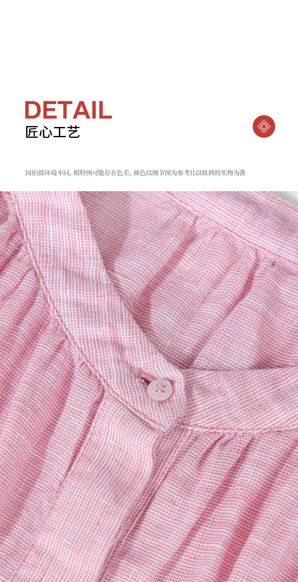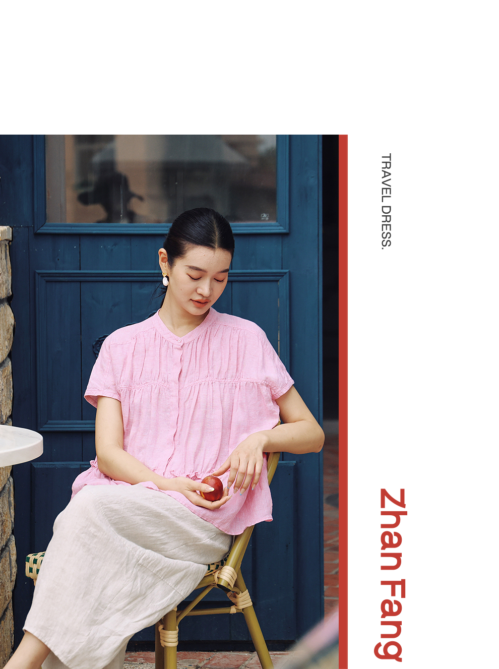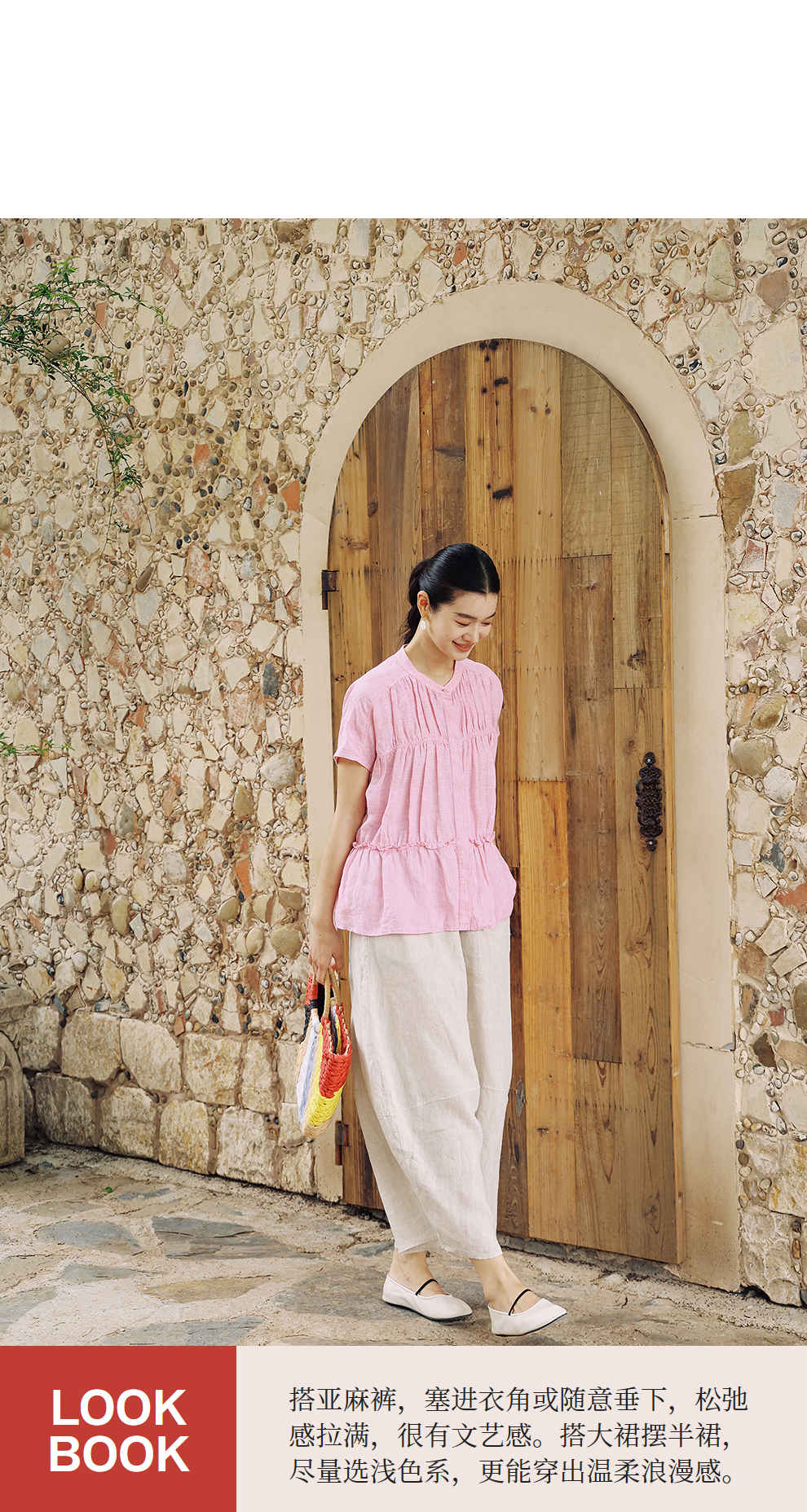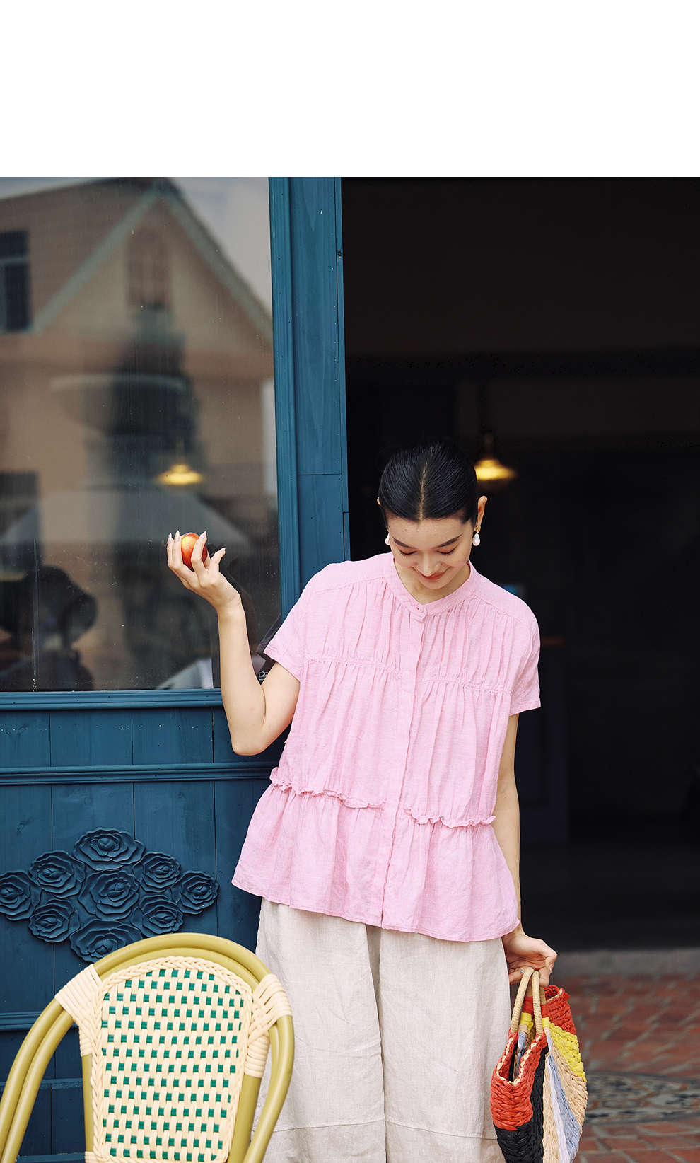 绽放367朵/【多巴胺系列】色织亚麻小立领开襟捏褶层次感短袖小衫