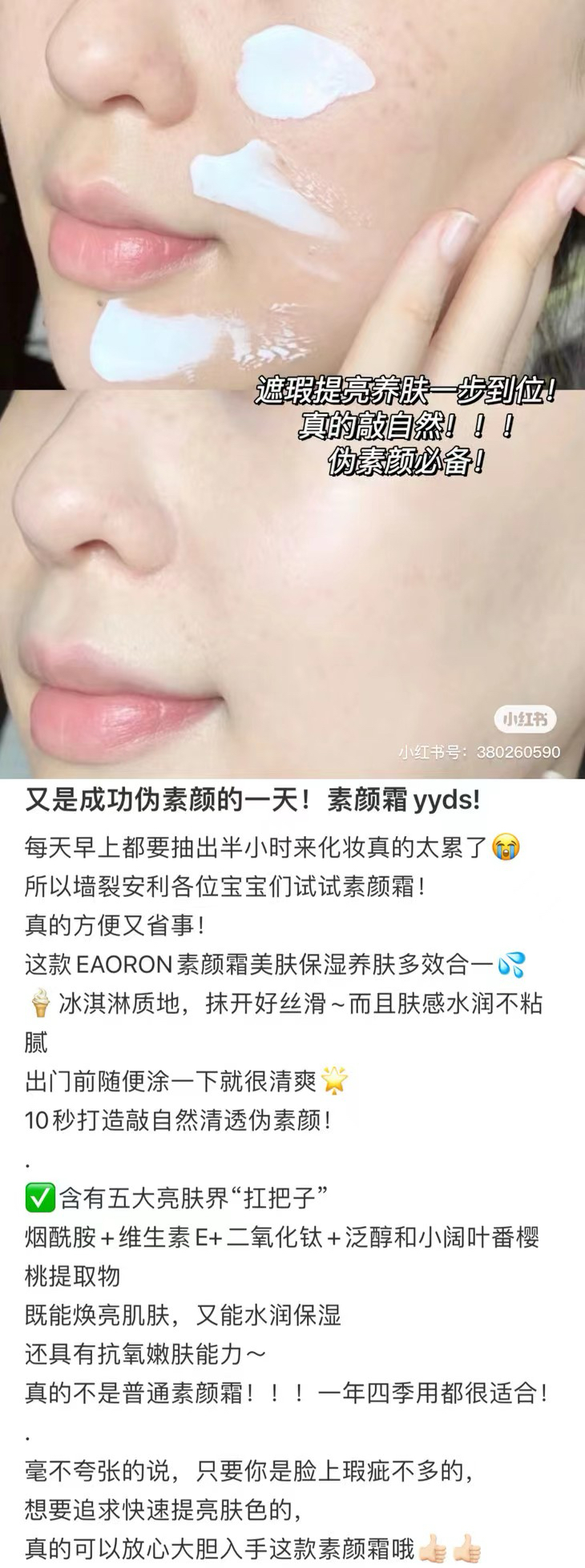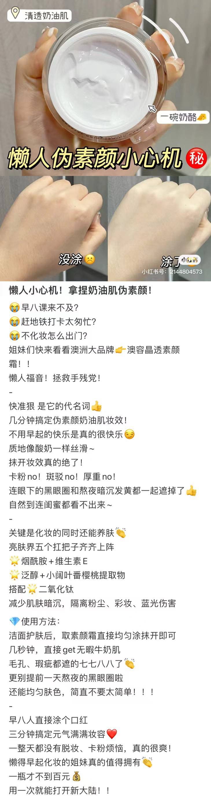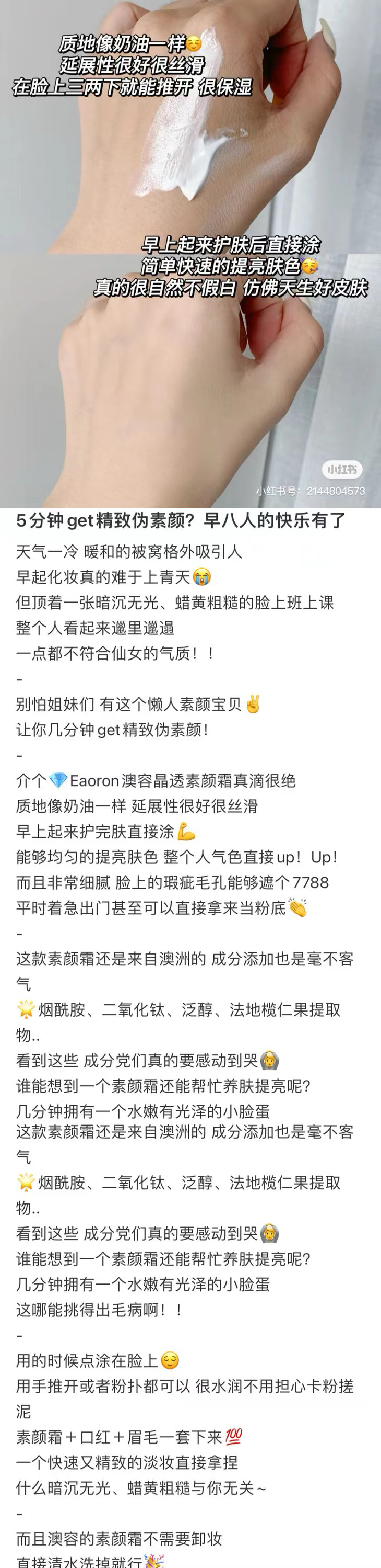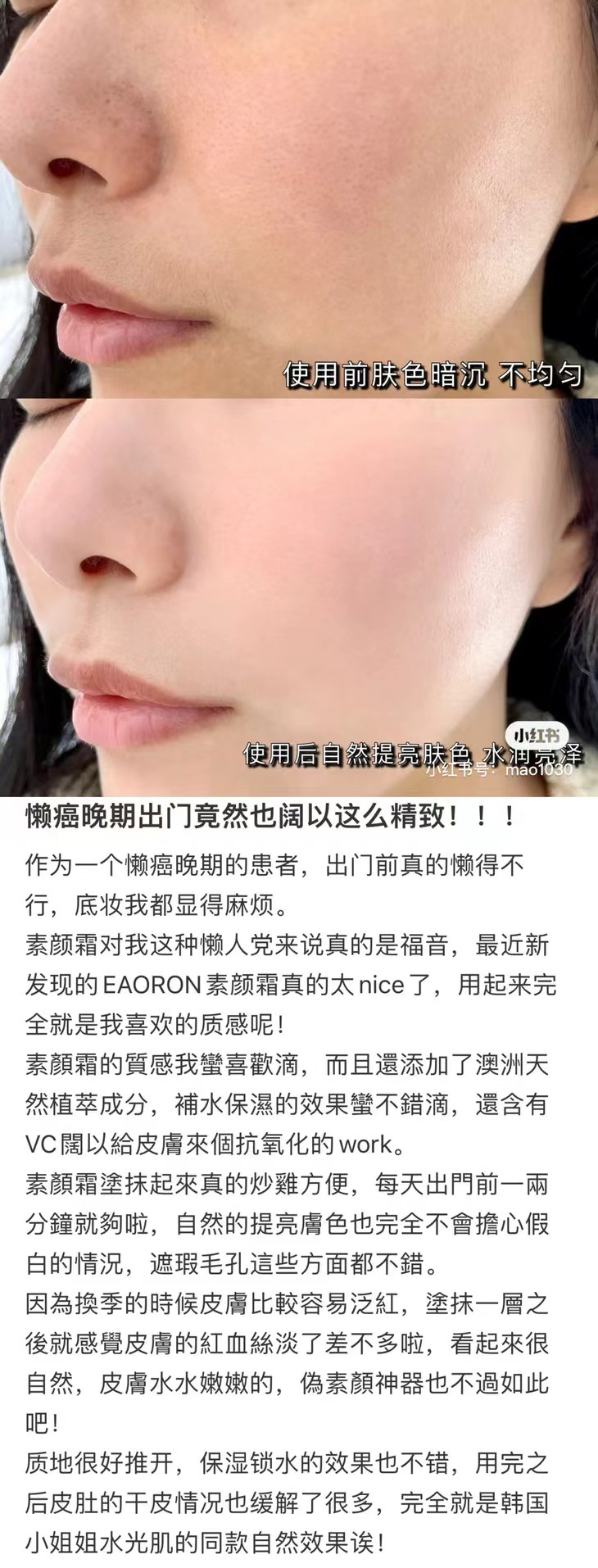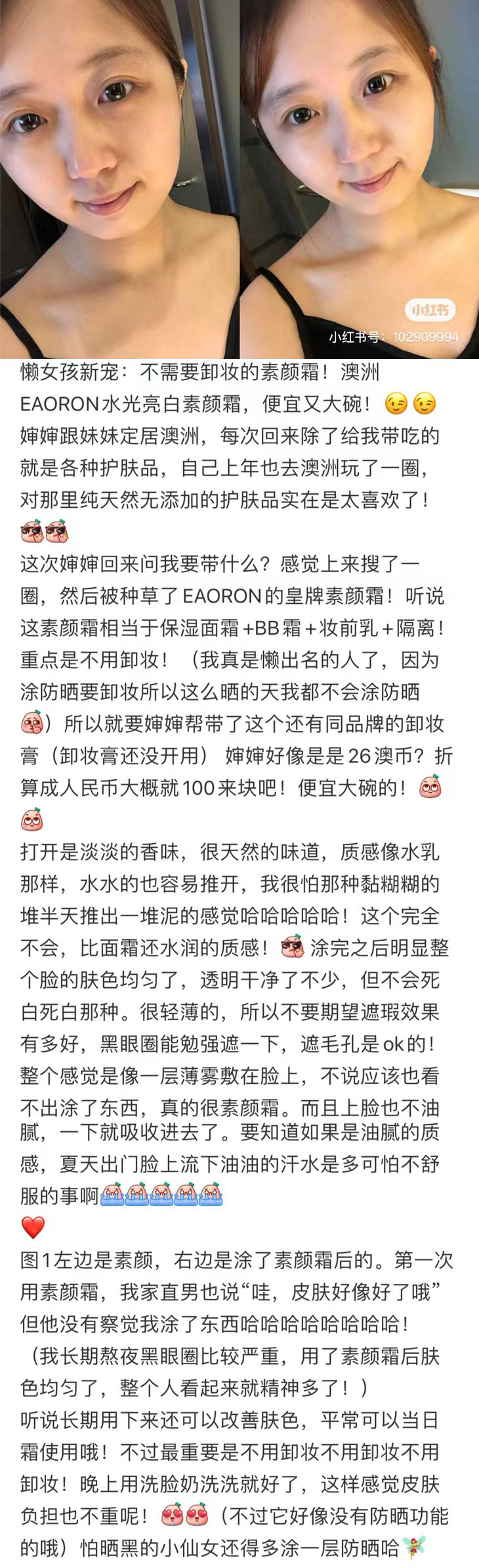 澳洲EAORON大家应该不陌生了,多年前就有上过他家的王牌精华,这罐素颜霜是比较新的品,我有试用下,还蛮不错的,是非常自然的润色效果,遮瑕一般,但提亮,还有点闪闪,蛮适合不爱化妆的懒人!关键是价格很好,不仅可以涂脸,涂全身都不会心疼哦!