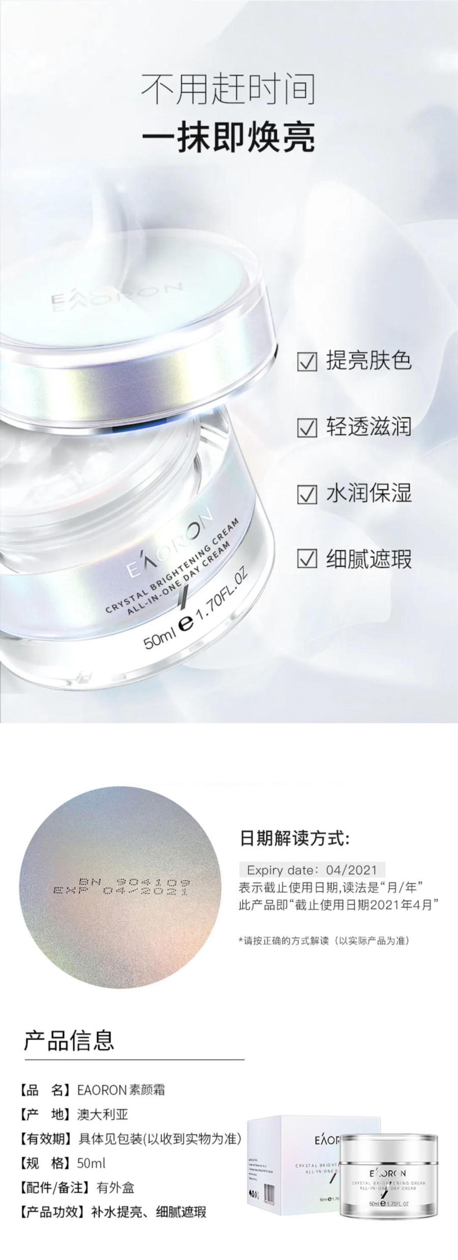 [屁侠推荐]澳洲Eaoron 素颜霜 水光针懒人霜 遮瑕滋润保湿亮肤50ml