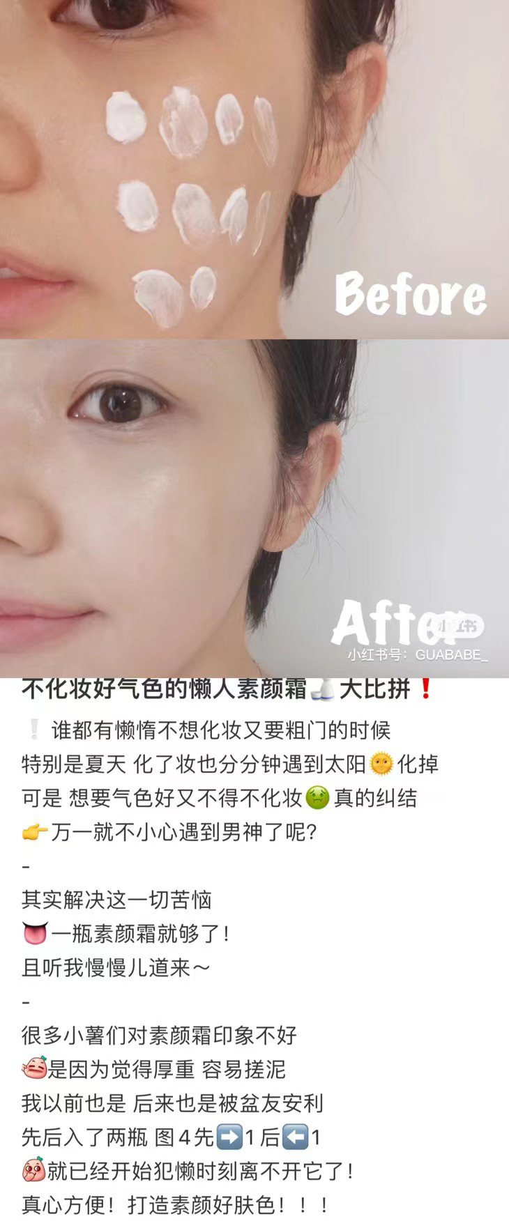 素颜霜的霜体质地很像奶昔,延展性很好,清爽不油腻,自然不假白,细小斑点、毛孔也能被遮得七七八八,就像是加了磨皮滤镜!特别适合肤色暗黄又懒得折腾的姐妹,可以很有效的提气色,加个唇膏就可以非常神采奕奕,并且直男还看不出来,是那种有妆胜无妆的清透素颜感!