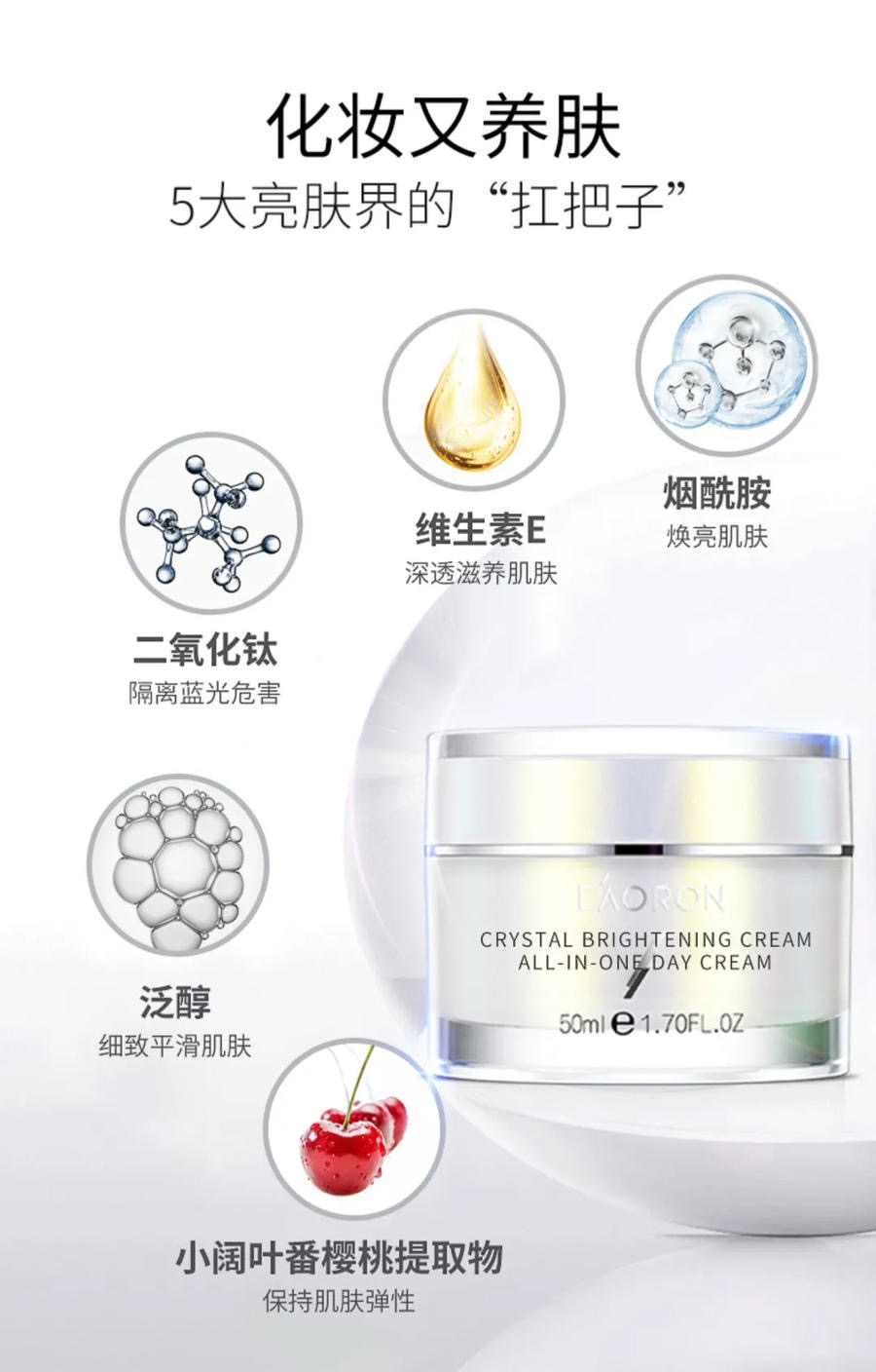 EAORON素颜霜是澳洲原装进口,以先进的TiO2物理美白及防晒成份,配以澳大利亚西北部原始森林独特植物卡卡杜李(Kakaduplums)果实所提取的维生素C、多酚、儿茶酸等纯植物护肤成份,从而达到提亮肤色、滋润保湿的功能。除此外,还搭配了烟酰胺及泛醇等美白保湿成分,对皮肤无伤害的同时,还能养肤。